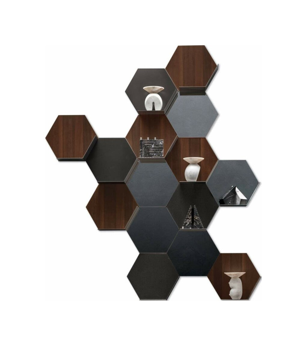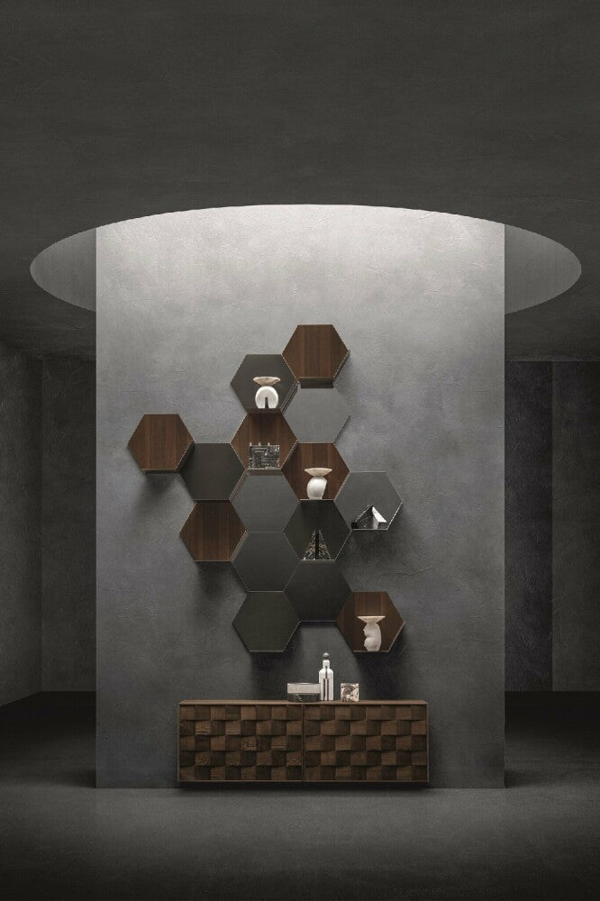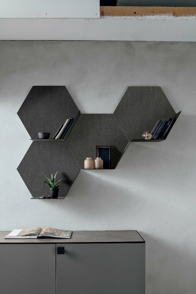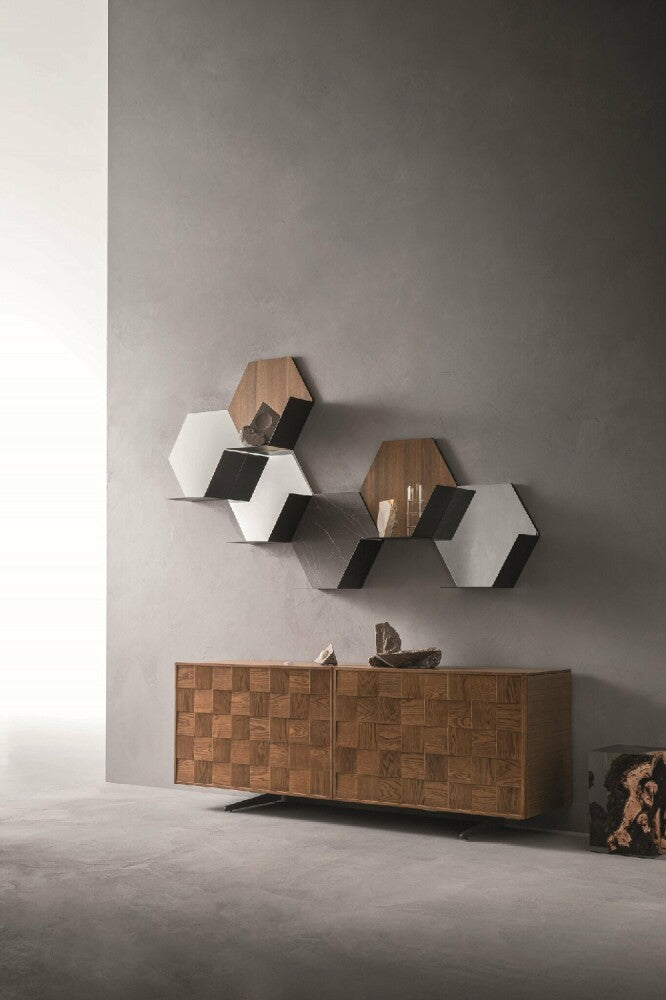 Il suo elemento principale, dalla caratteristica forma esagonale, può essere configurato con o senza ripiano e incastrato con altri moduli per dar vita a composizioni originali e personalizzate. Grazie alla sua flessibilità, Icaro si adatta a qualsiasi ambiente della casa: dal soggiorno alla camera da letto, fino ai disimpegni o alle zone di passaggio. A seconda delle finiture e della configurazione scelta, può fungere da piccola libreria, mensola d’appoggio o persino diventare una superficie specchiante, grazie alla possibilità di inserire uno specchio come schiena.