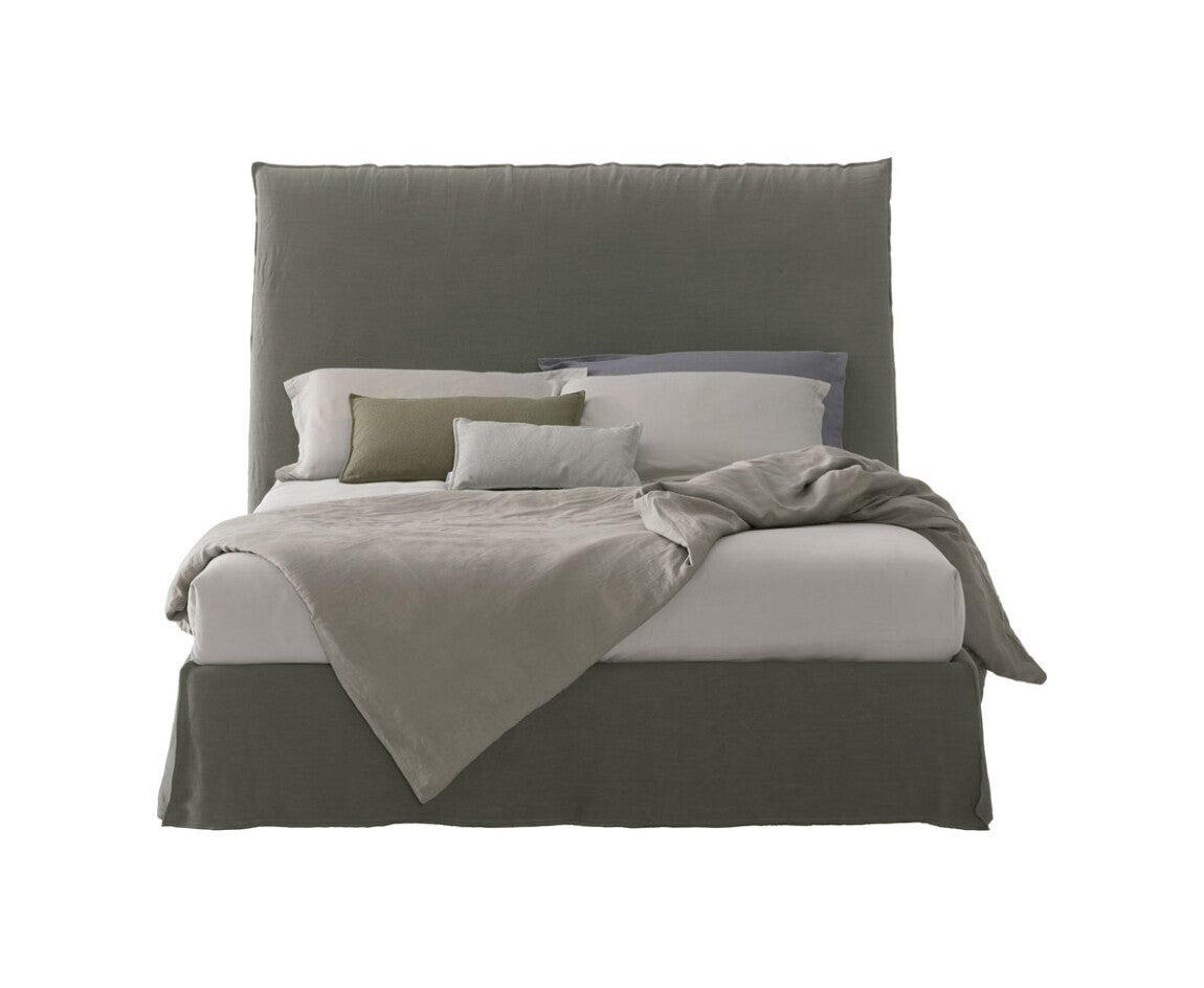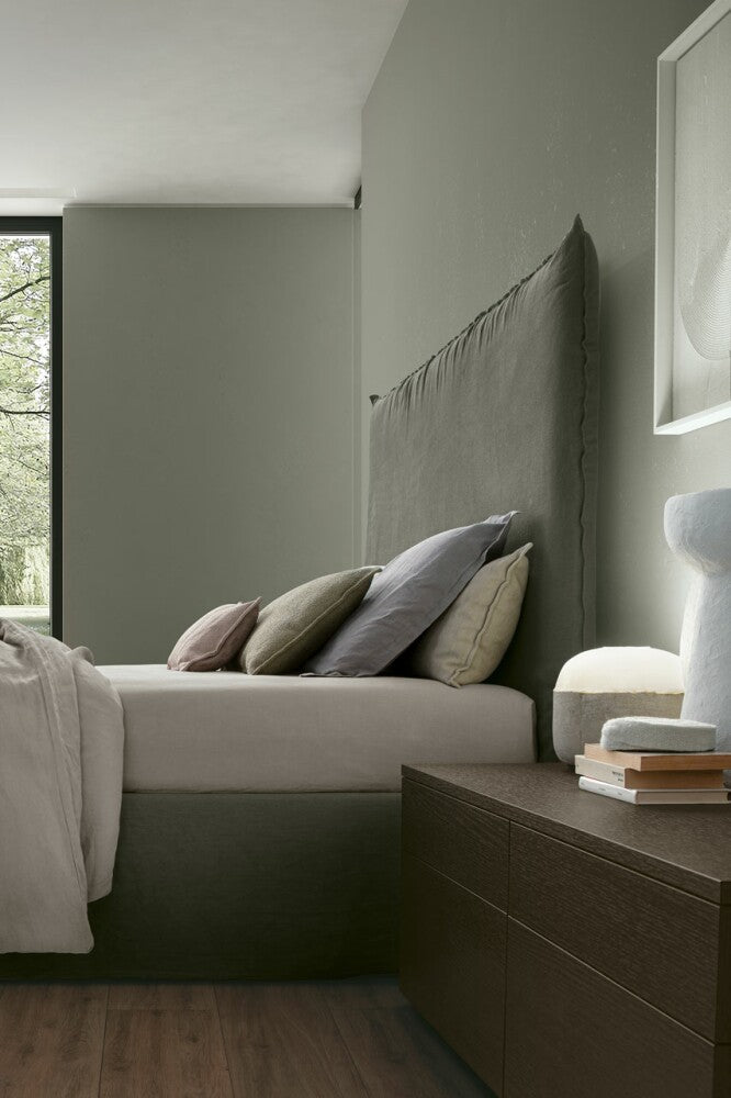 Il letto Hera di Tomasella è una proposta dal design pulito e lineare che si distingue per la testiera alta e sottile, capace di slanciare la figura del letto, e per l’elegante balza che riveste il giroletto come un abito su misura, richiamando alla memoria arredi classici ma con un tocco di contemporaneità.