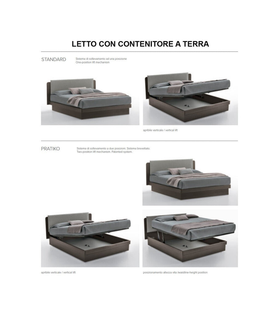 Integra un pratico vano salvaspazio accessibile tramite sistema di sollevamento standard, incluso di serie. Per i letti matrimoniali è possibile richiedere il sistema opzionale Pratiko, che consente il sollevamento sia verticale che orizzontale, rendendo più agevoli l’accesso al vano e il rifacimento del letto. In questa variante il letto risulta privo di piedini.
