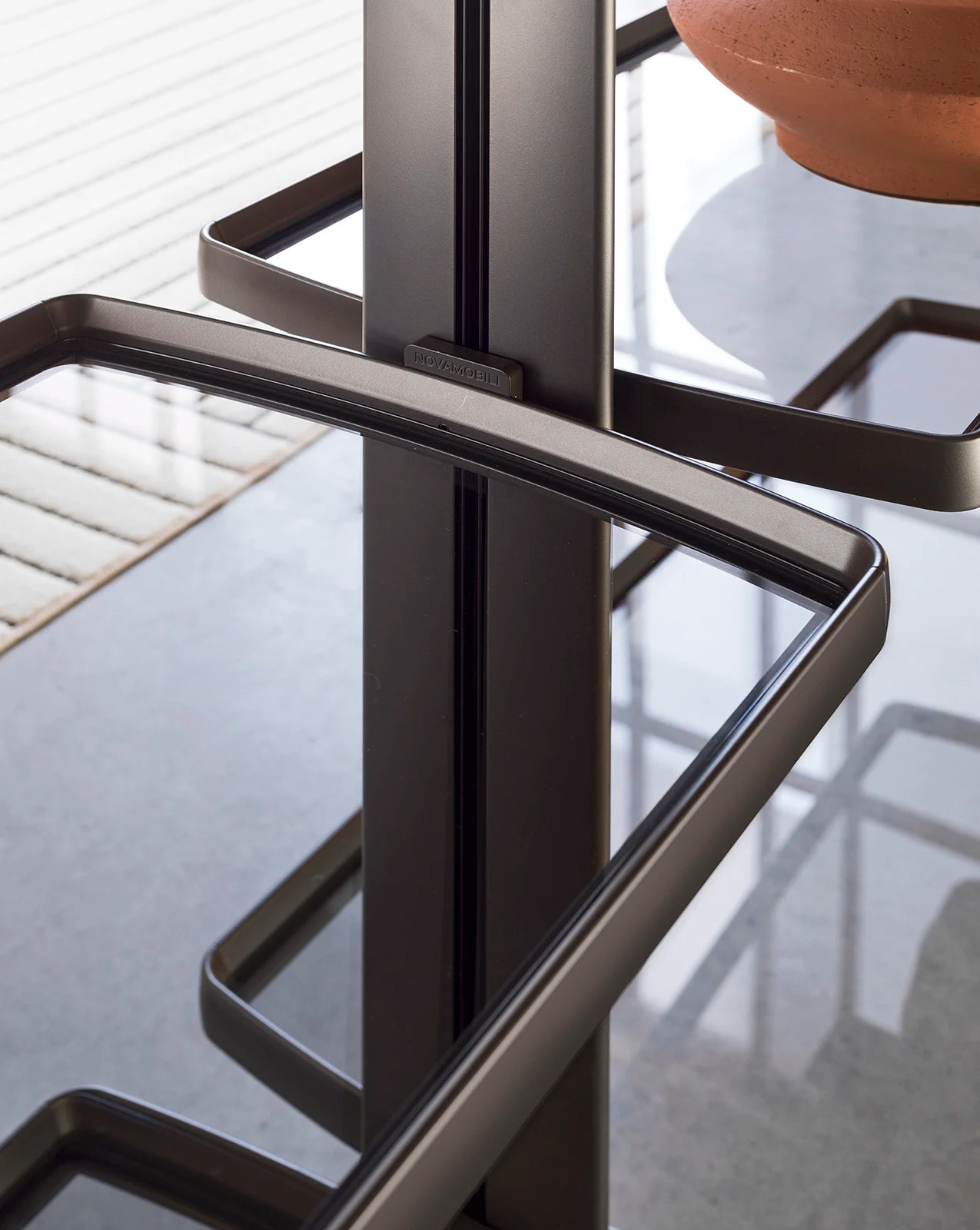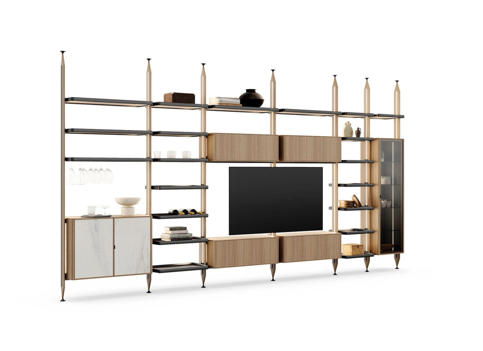 Nel living, Dedalo si trasforma in una parete attrezzata dinamica e personalizzabile, arricchita da un palo porta TV orientabile, scrittoi, contenitori chiusi con ante lisce, frontali Rays o in vetro, oltre a pratici cassetti e cassettoni. I ripiani modulari, disponibili in diverse finiture e materiali, garantiscono un’estetica elegante e coerente. L’illuminazione LED integrabile nei montanti, ripiani e cassettiere esalta ogni dettaglio, mentre la possibilità di configurarlo come angolo bar con portabottiglie e portabicchieri in cuoio lo rende ideale anche per momenti conviviali.