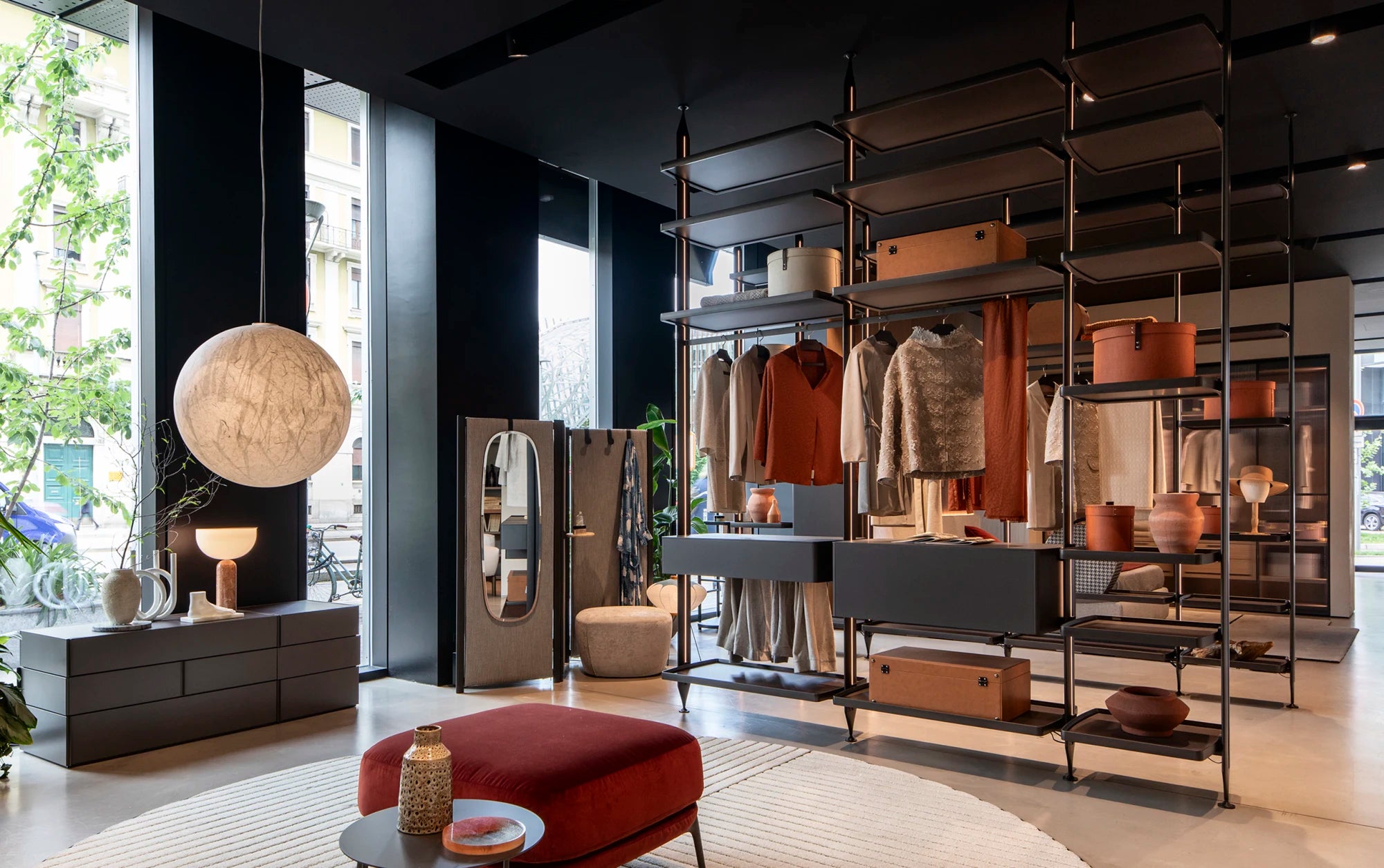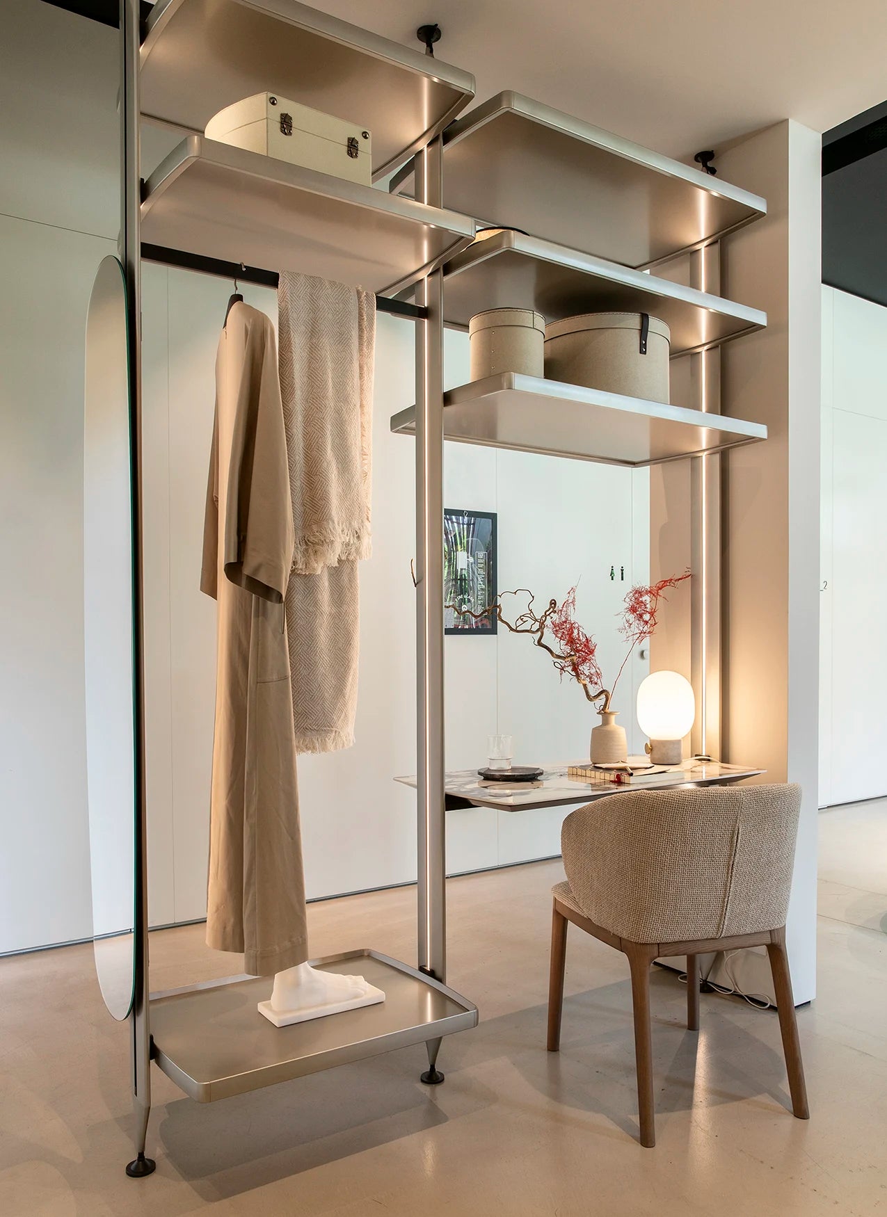 Nella zona notte, Dedalo diventa una cabina armadio funzionale ed elegante, progettata per ottimizzare lo spazio e mantenere l’ordine. Ai montanti possono essere aggiunti contenitori, cassettiere, tubi appendiabiti, kit pantaloni, griglie portacravatte, ripiani portascarpe, specchi orientabili e accessori estraibili. Grazie al sistema di aggancio tramite scanalatura centrale, ogni elemento si integra in modo solido e stabile, trasformando la cabina armadio in uno spazio dedicato al benessere e all’organizzazione, dove ogni dettaglio riflette il tuo stile.