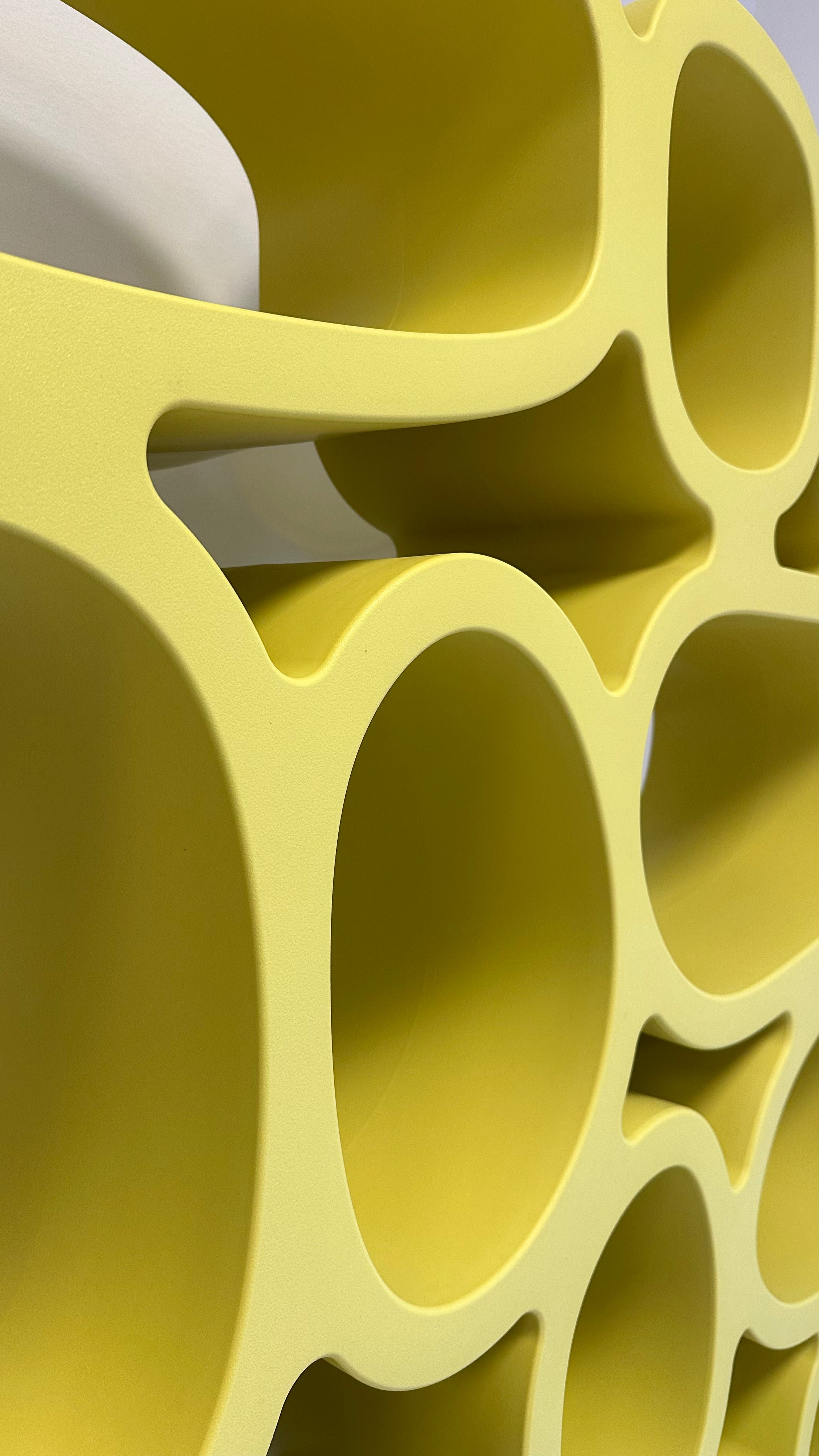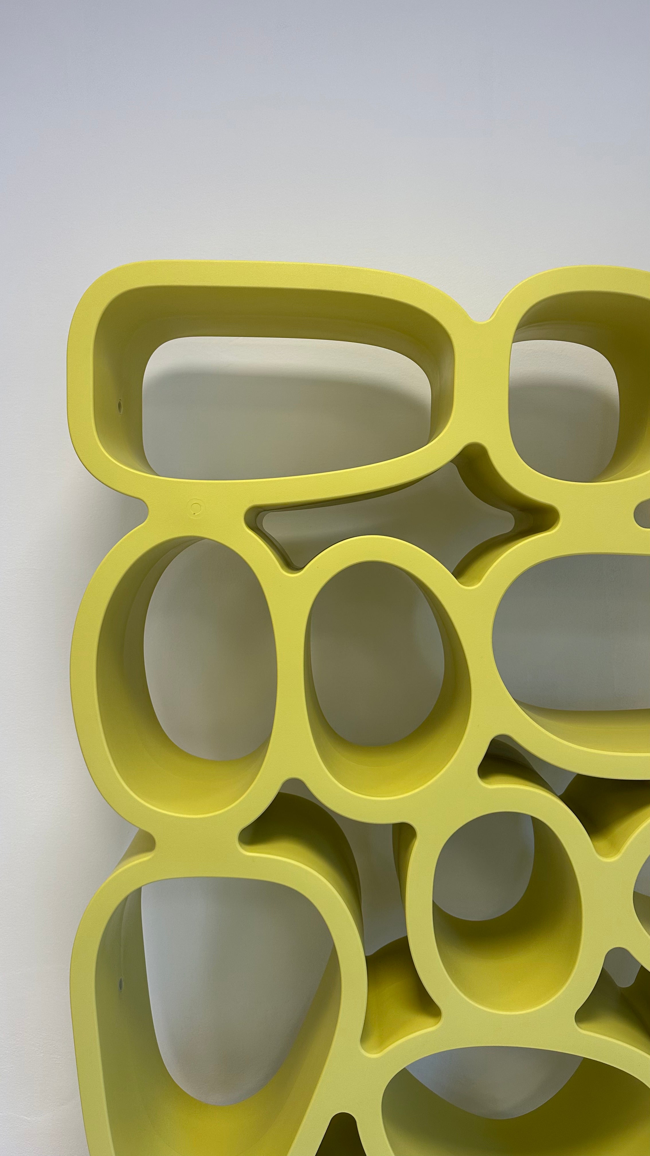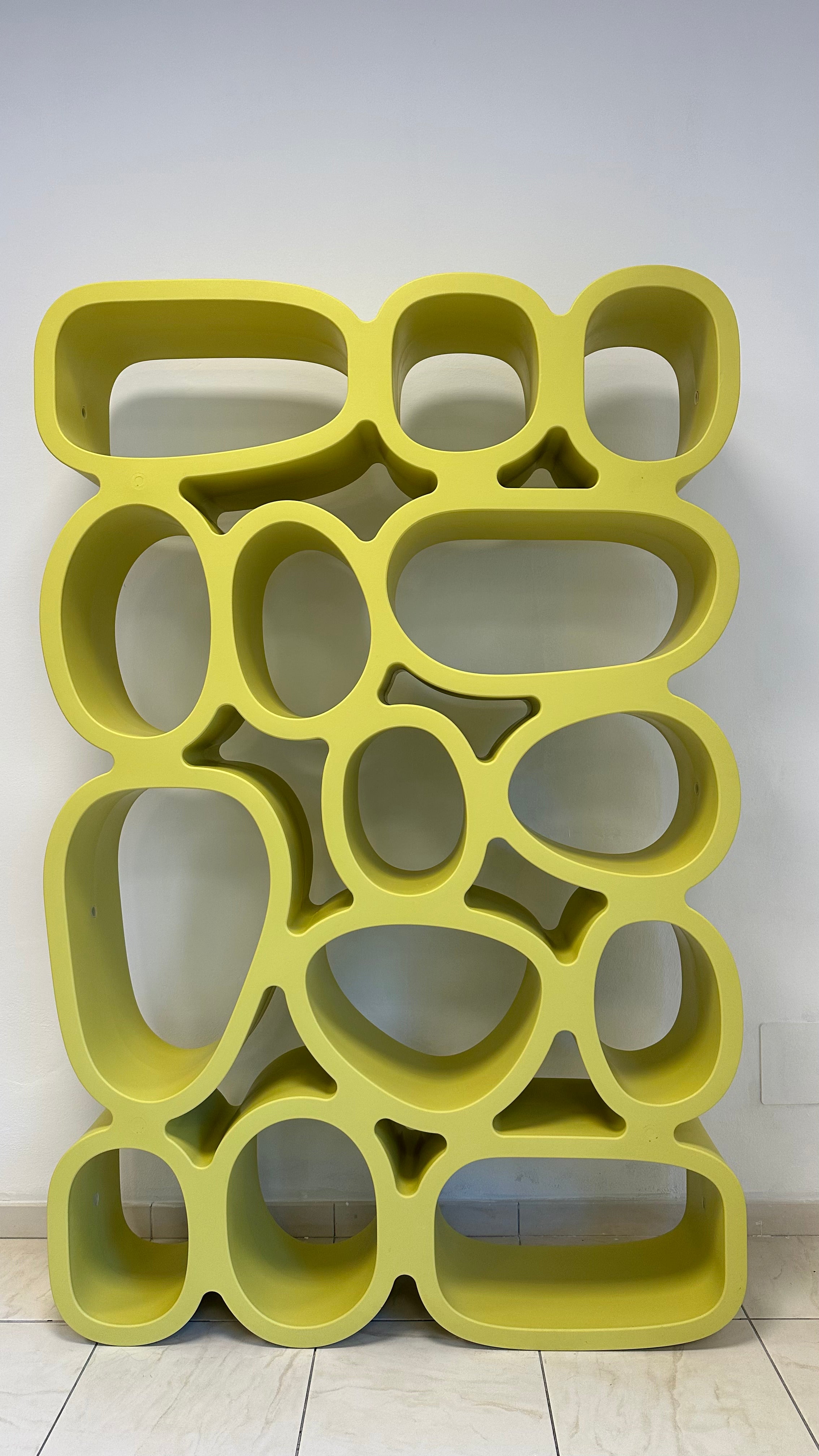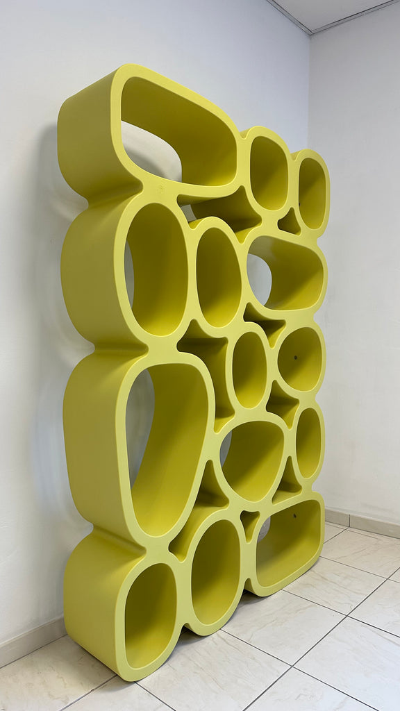 Realizzata in polietilene riciclabile, è sorprendentemente leggera ma stabile, utilizzabile sia verticalmente che orizzontalmente. Perfetta come libreria, divisorio o elemento centrale in soggiorno, studio o ufficio. La modularità consente di affiancare più unità per creare composizioni su misura.