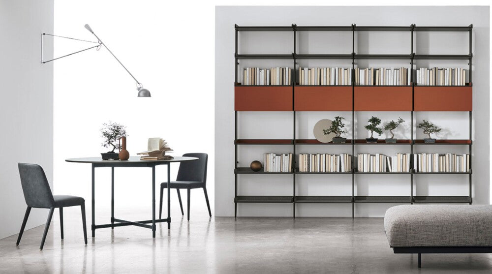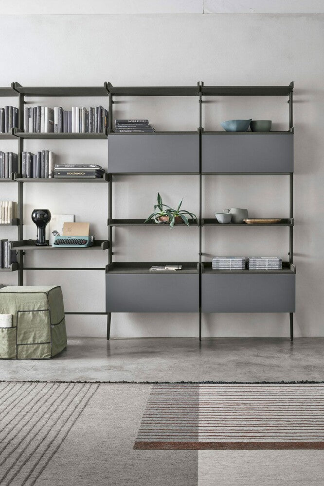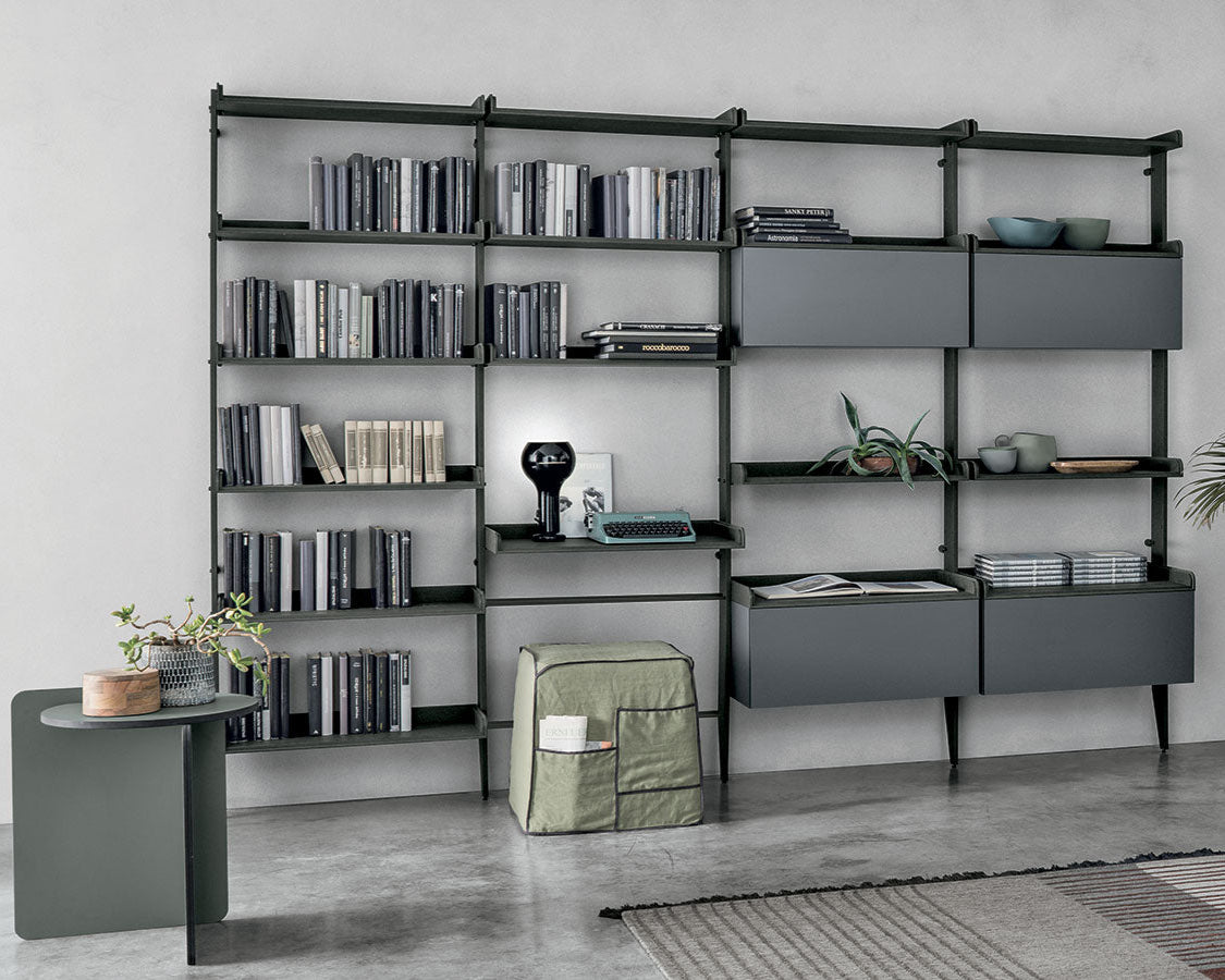 La libreria modulare Raise è composta da montanti fissati a parete, intervallati da mensole o da una coppia di tubetti in metallo dal diametro di 1,2 cm. Per renderla ancora più pratica e organizzata, è possibile integrare cassettoni, pensili o una mensola-scrittoio profonda 40 cm, ideale per ricavare un angolo home office senza occupare ulteriore spazio.