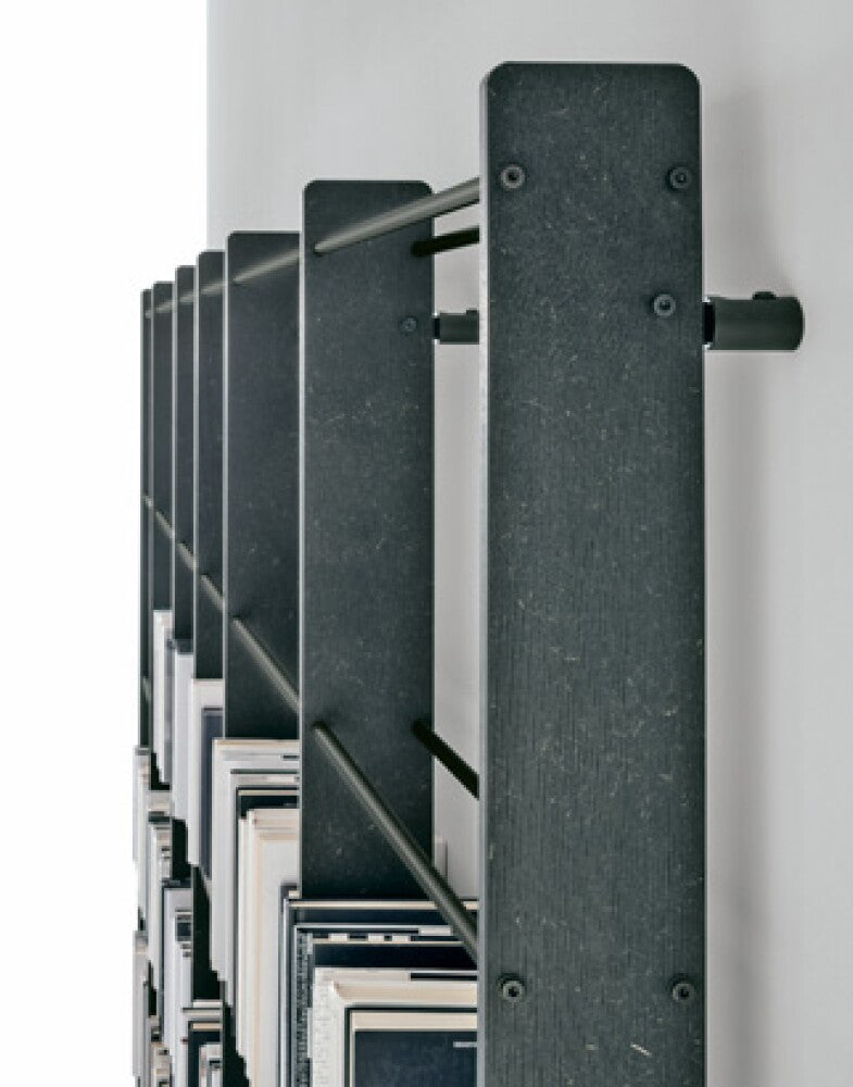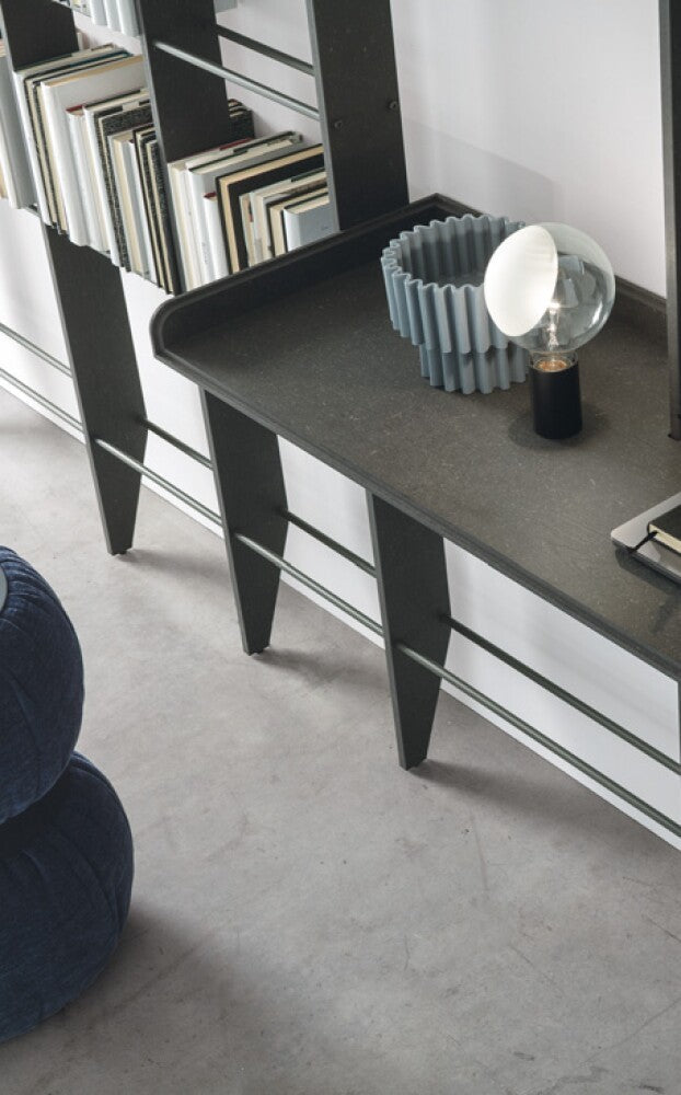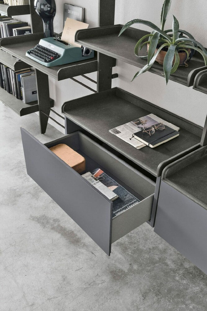 Il cuore della collezione è il CDF (Compact Density Fibreboard), un pannello in fibra di legno estremamente compatto e di colore nero, che lascia visibile la pasta sui bordi delle mensole, donando carattere e personalità. Oltre a essere sostenibile dal punto di vista ecologico, il CDF è resistente e performante, garantendo estetica e funzionalità in un unico prodotto.