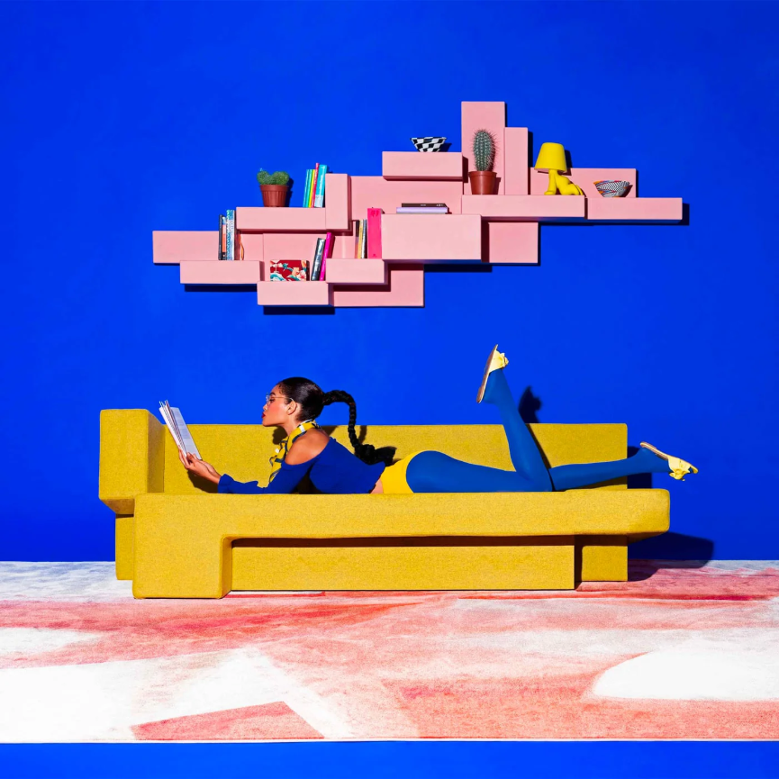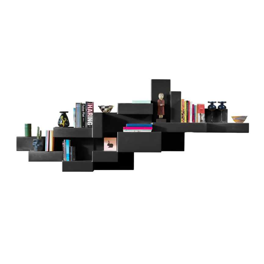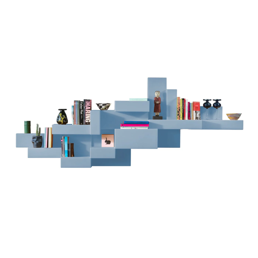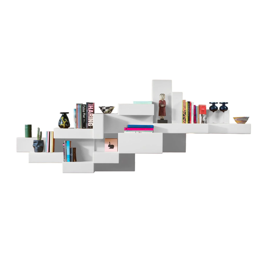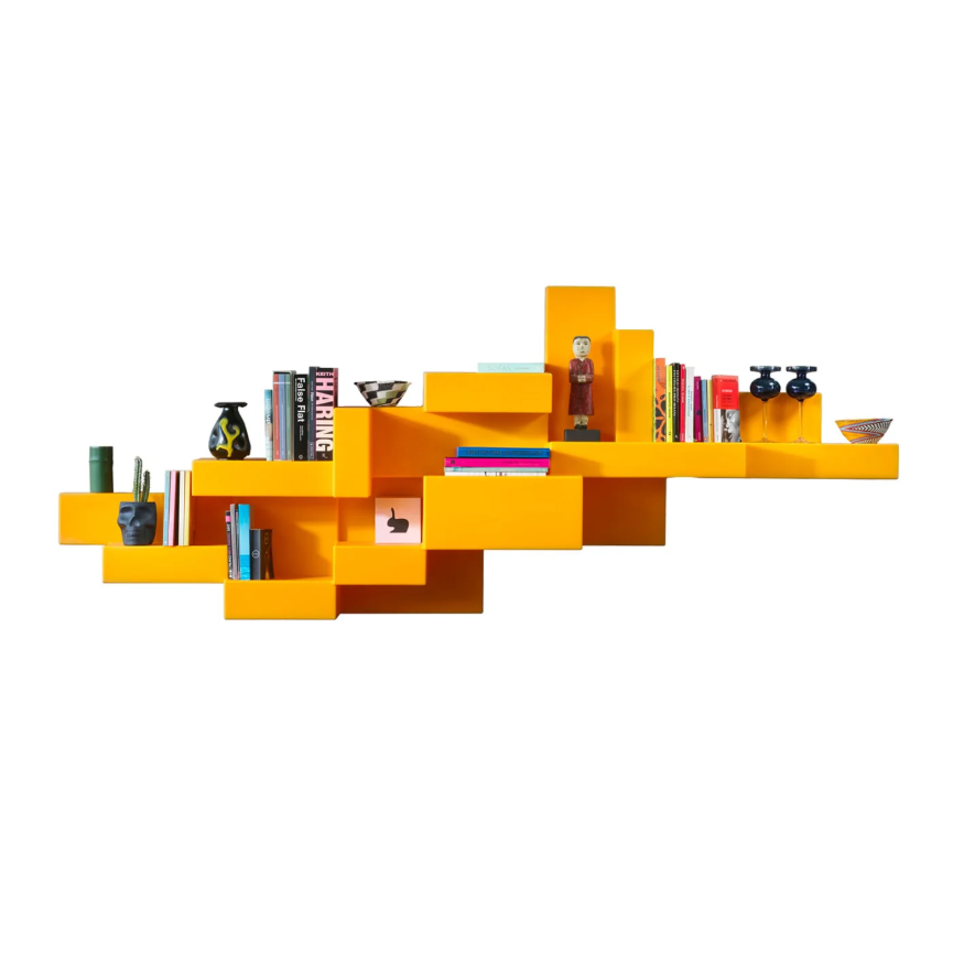 La libreria è composta da un modulo scultoreo, caratterizzato da volumi primari e forme geometriche essenziali, che può essere utilizzato singolarmente oppure combinato con un secondo modulo per creare configurazioni più ampie e scenografiche.