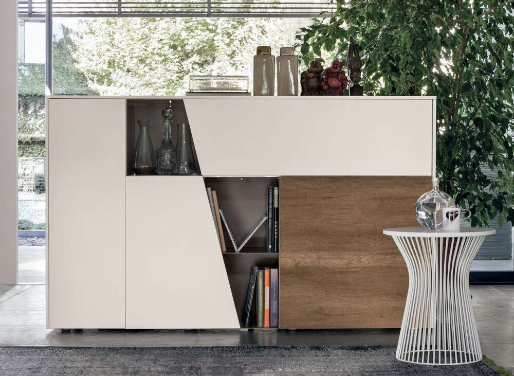 I tagli diagonali delle ante creano originali forme trapezoidali e giochi di pieni e vuoti che movimentano la composizione, offrendo allo stesso tempo ampia capacità contenitiva e zone a giorno per esporre libri, oggetti o complementi decorativi.