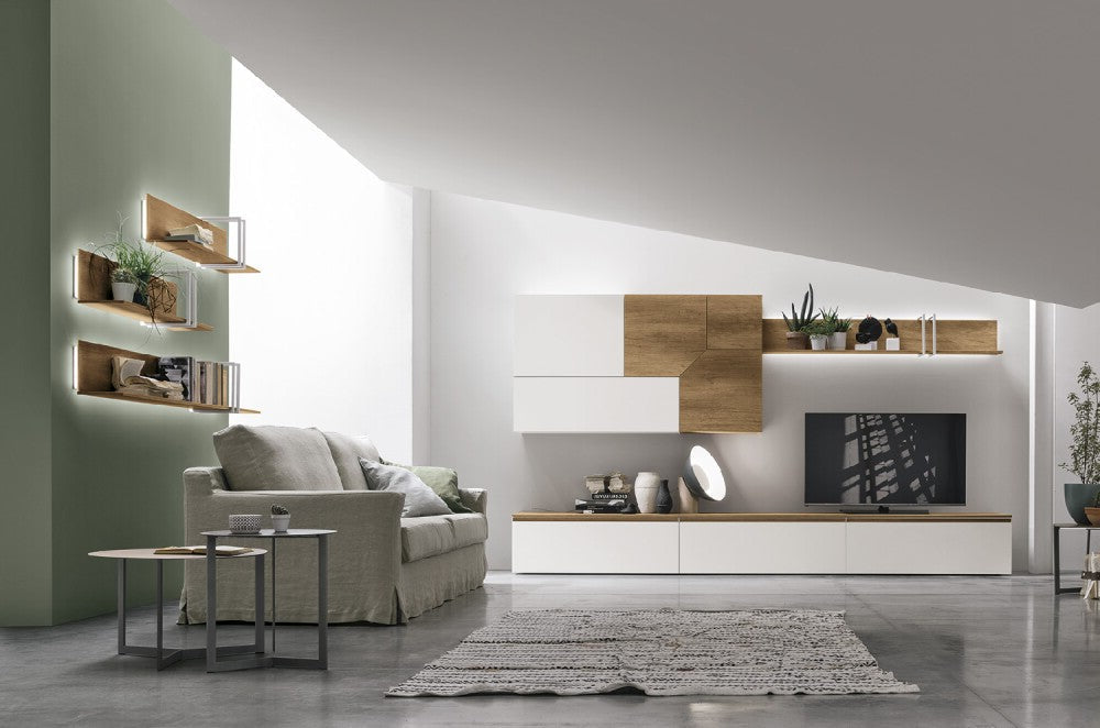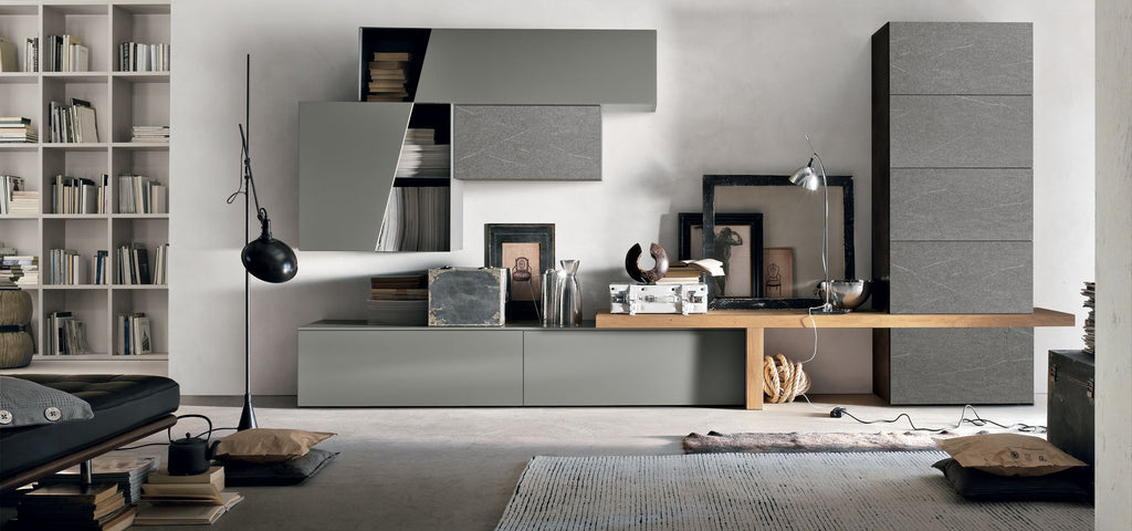 • Funzionalità: moduli libreria, vani contenitori, pensili ed elementi a giorno