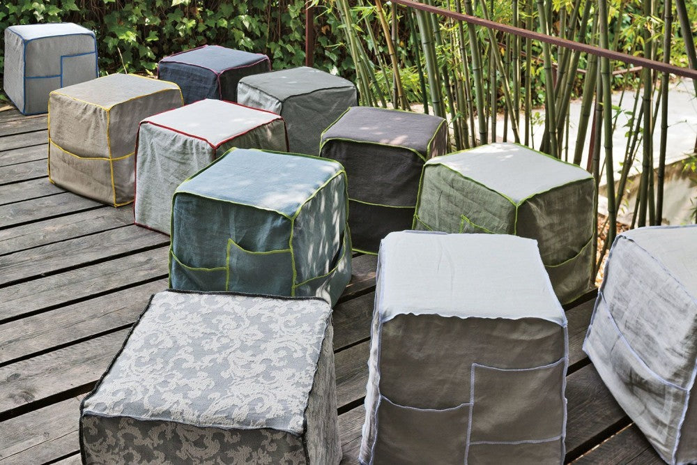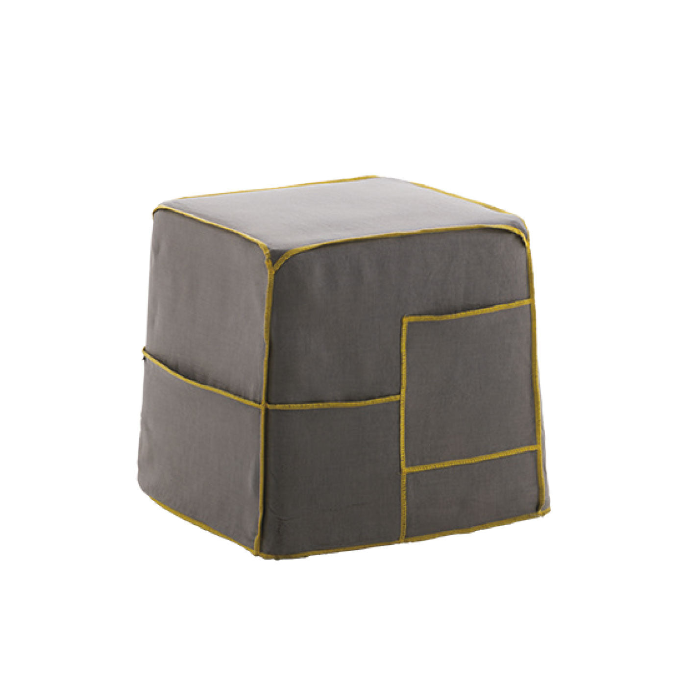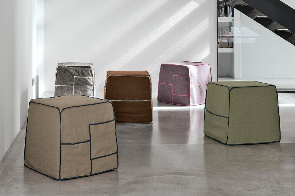 Rivestito in tessuto o lino, il pouf Cookie è completamente personalizzabile grazie alla cucitura a contrasto, che ne esalta il profilo e permette di creare abbinamenti cromatici raffinati e originali, in linea con lo stile Tomasella.
