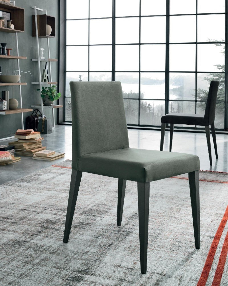 La struttura, realizzata in legno massello di frassino, è disponibile in 32 tonalità laccate a poro aperto, che mettono in risalto le venature naturali del legno. La seduta e lo schienale imbottiti assicurano un comfort ottimale e possono essere rivestiti in tessuto, pelle o ecopelle, materiali di alta qualità proposti in numerose finiture per un effetto estetico sempre personalizzato e armonioso.