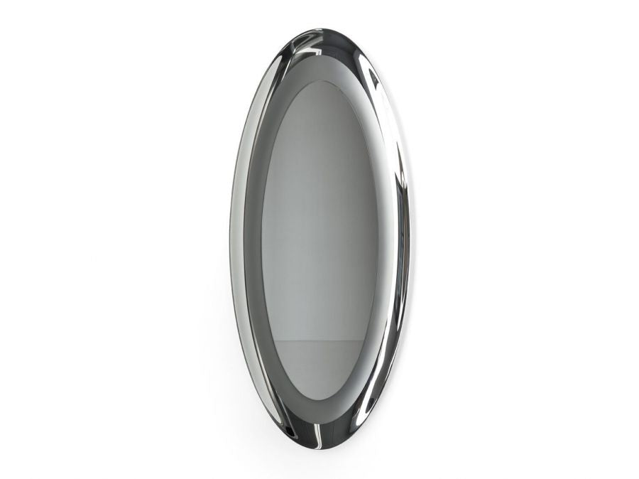 Disponibile in due dimensioni e in due forme – ovale o rotonda – lo specchio moderno Surface offre grande versatilità progettuale. Il vetro è proposto nelle finiture bronzo o grigio, mentre la cornice curvata, a specchio con finitura esterna satinata, crea raffinati giochi di luce e riflessi, aggiungendo profondità e carattere allo spazio.