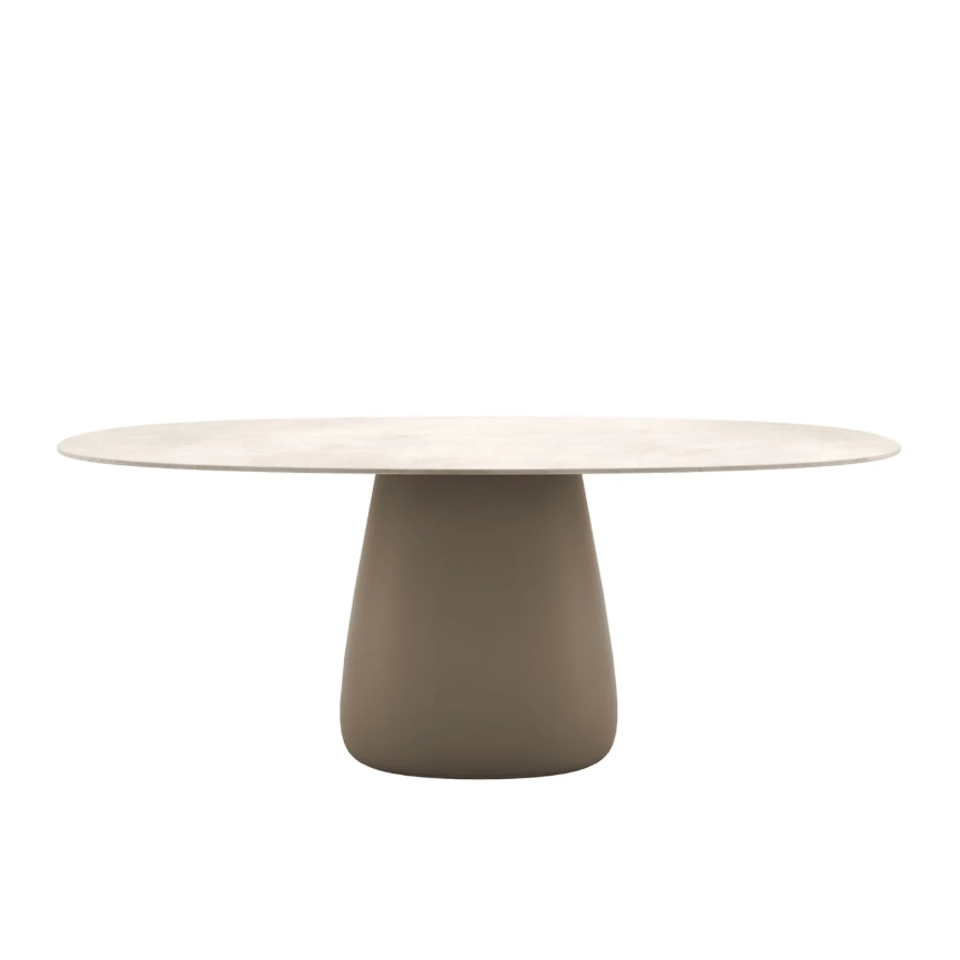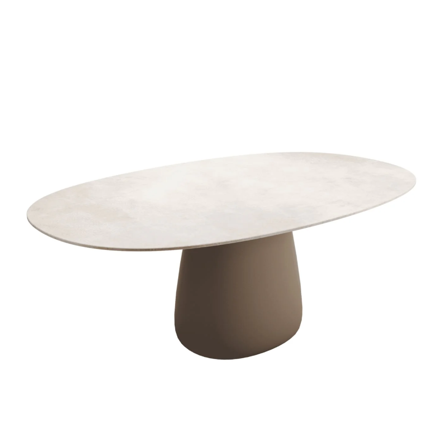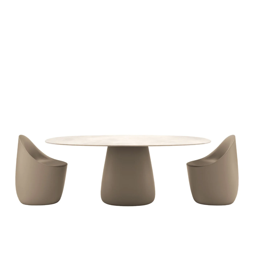 Il Tavolo Cobble di Qeeboo, disegnato da Elisa Giovannoni, è caratterizzato da un elegante piano ovale in gres laminato, materiale resistente e adatto sia all’uso interno che esterno. Il design si distingue per il top sottile e raffinato abbinato a una base scultorea in polietilene riciclabile, dalla forma morbida e contemporanea.