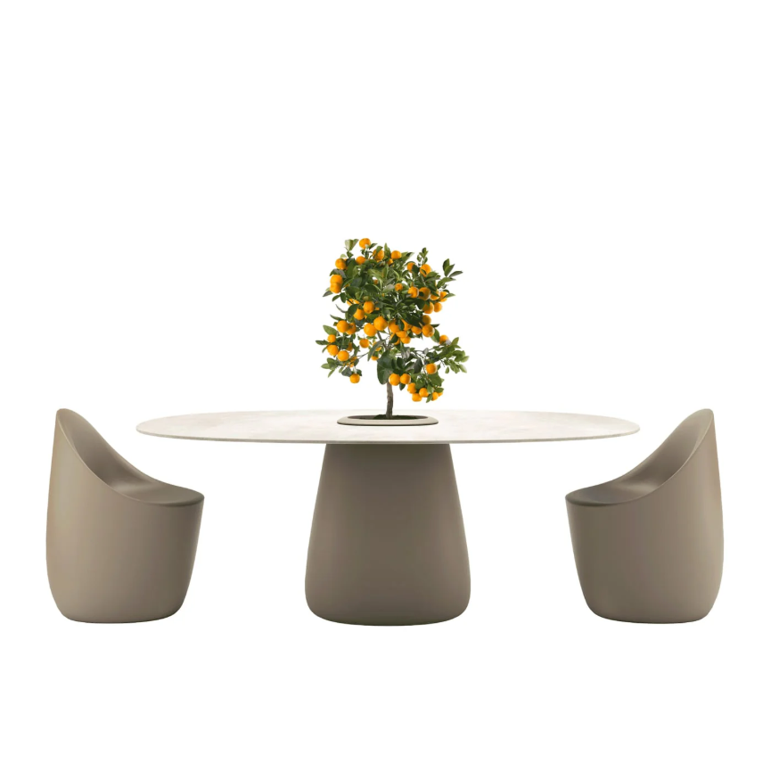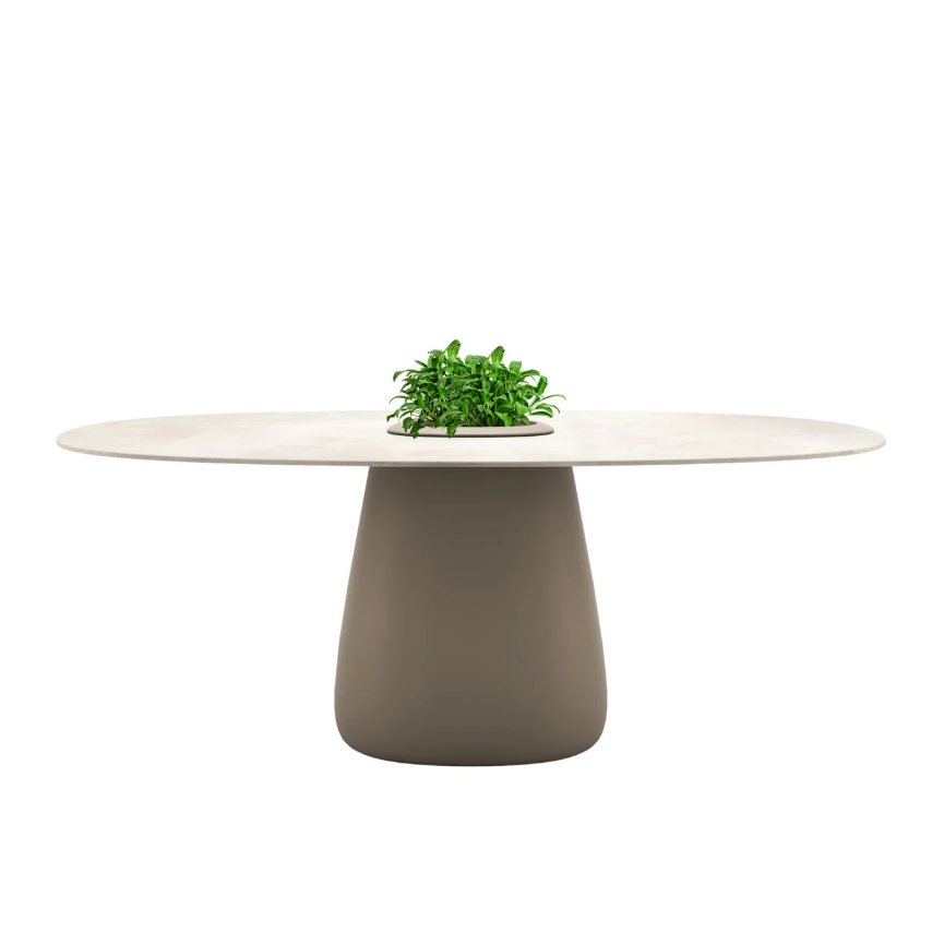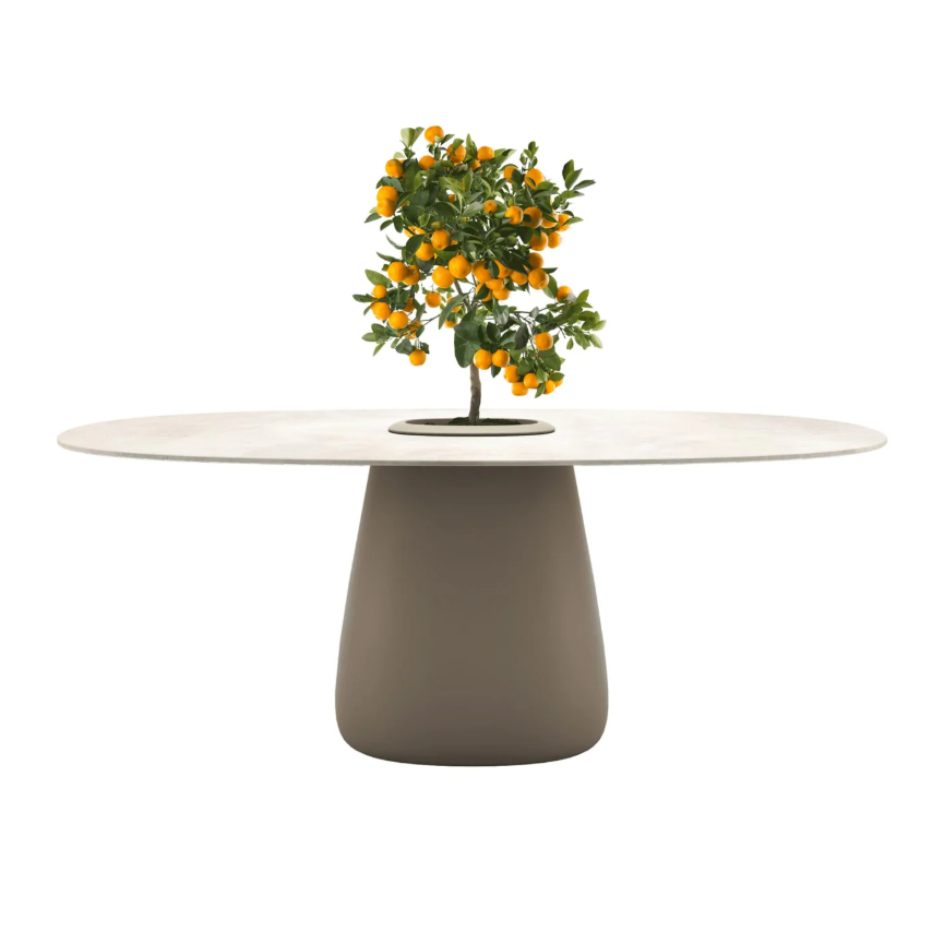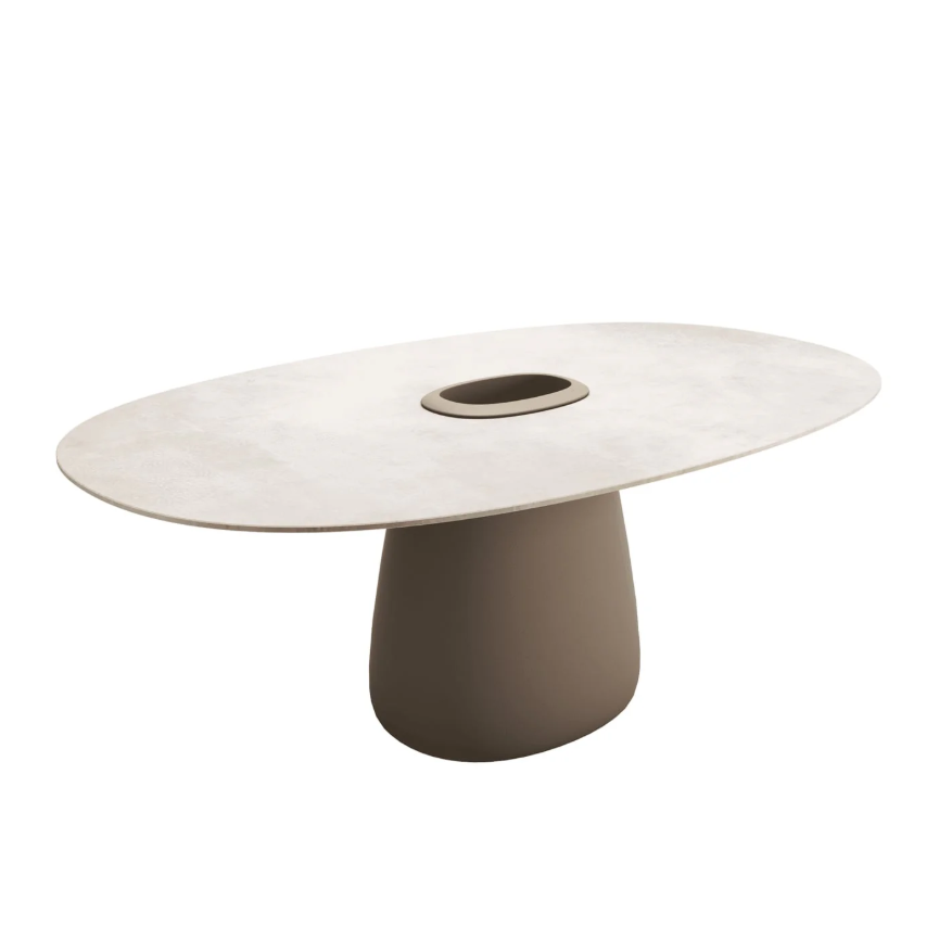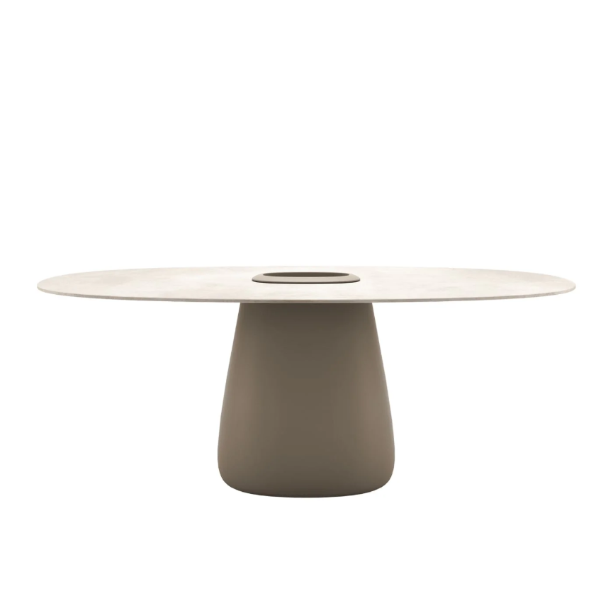 La sua base centrale integra un pratico secchiello che può essere utilizzato sia come vaso per piante sia come ice bucket per mantenere fresche le bottiglie durante pranzi, aperitivi e cene. Il top ovale in gres laminato, sottile ed elegante, è ideale per uso interno ed esterno grazie alla sua elevata resistenza.