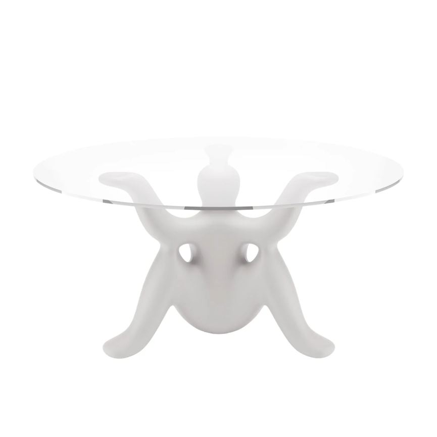 Il contrasto tra la base scultorea in polietilene riciclabile e il top in vetro temperato crea un equilibrio sorprendente tra leggerezza, modernità e un tocco fiabesco, rendendo Helpyourself un tavolo scenografico perfetto per dining room, spazi contract o ambienti di rappresentanza.