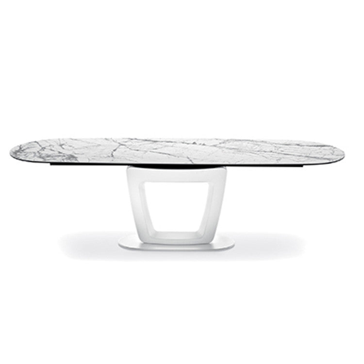 Il piano fisso in pregiata ceramica effetto marmo valorizza il tavolo con una superficie raffinata, resistente e di grande impatto estetico. La base in metallo dal look peculiare rafforza il carattere iconico del progetto, mentre la parte centrale personalizzabile consente l’applicazione di pannelli in diversi materiali, permettendo un alto livello di customizzazione.