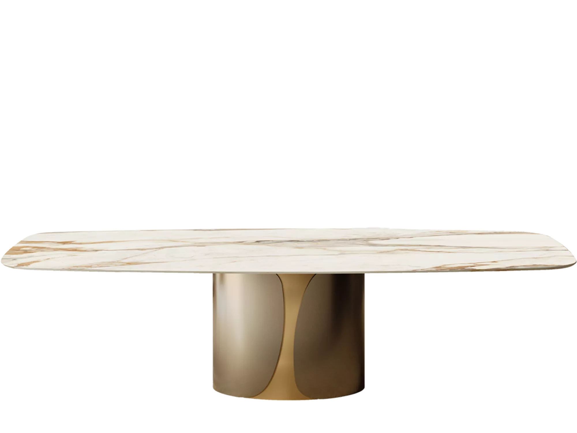 Il tavolo Talos si distingue per una presenza scenografica e una linea architettonica solida, capace di trasformare la sala da pranzo o il living in un ambiente di grande personalità. Il suo tratto iconico è la base ellittica monolitica, composta da due gusci simmetrici che avvolgono il corpo centrale, creando un effetto dinamico e scultoreo.