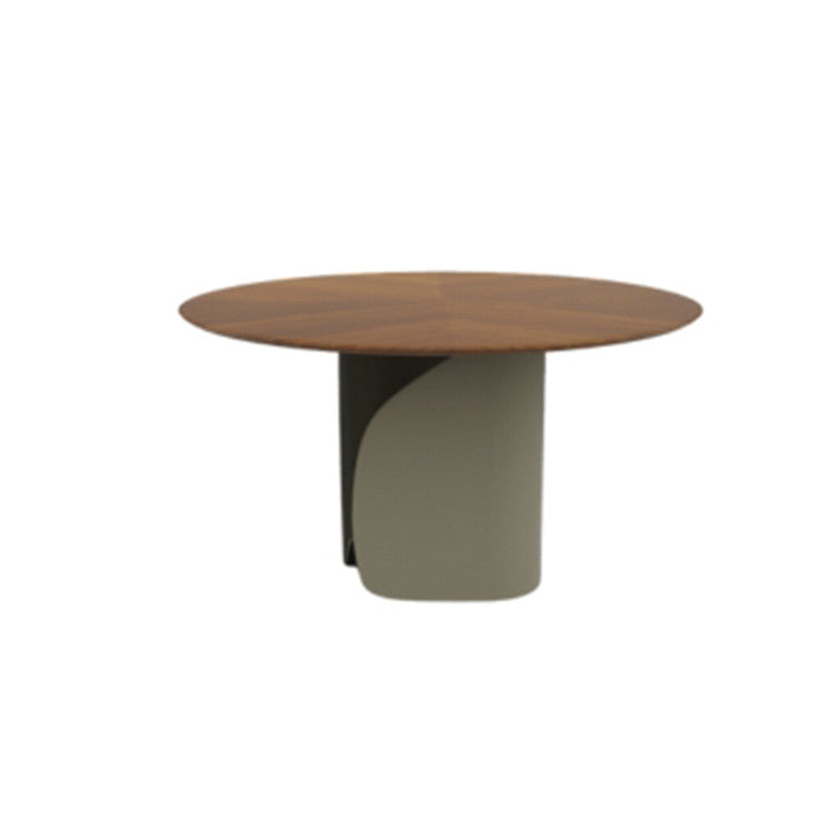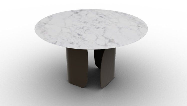 Il piano rotondo, proposto in pregiata ceramica oppure in legno intarsiato, permette di scegliere tra un’estetica più contemporanea e materica o una più calda e artigianale. La forma circolare enfatizza la convivialità, rendendo il tavolo ideale per ambienti accoglienti e ricercati, senza rinunciare a una forte presenza scenica.