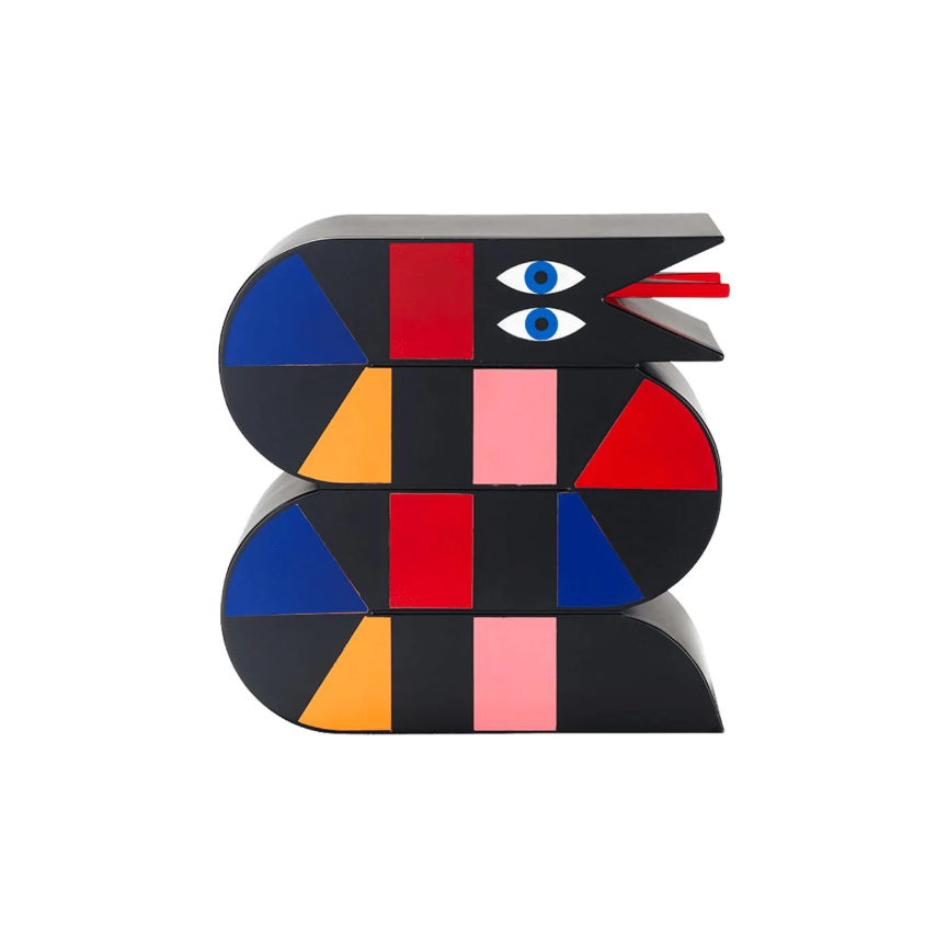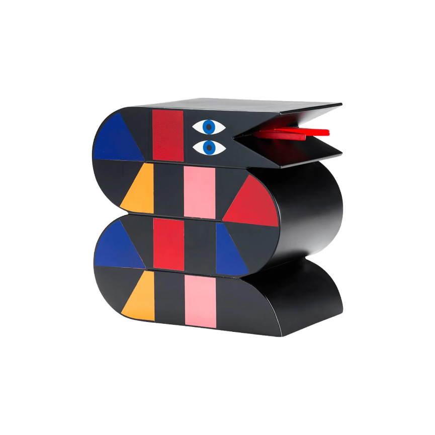 Realizzato in legno laccato, Mambo rappresenta un serpente nero stilizzato, trasformato in un tavolino iconico, decorativo e funzionale. Il linguaggio visivo di Oggian — basato su colori primari, segni grafici essenziali e forme giocose — conferisce a questo pezzo una forte identità pop e contemporanea.