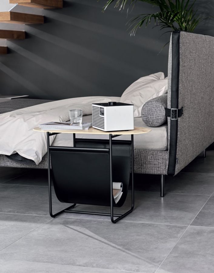 Disponibile in un’unica dimensione, il tavolino moderno Magazine presenta una struttura in metallo nero opaco che sostiene un piano in legno laccato nero, creando un elegante gioco monocromatico. Il tratto distintivo è la sacca porta riviste in cuoio rigenerato, disponibile nei colori nero o cognac, ideale per tenere libri e magazine sempre in ordine.