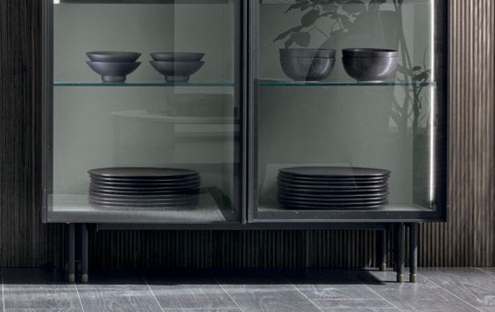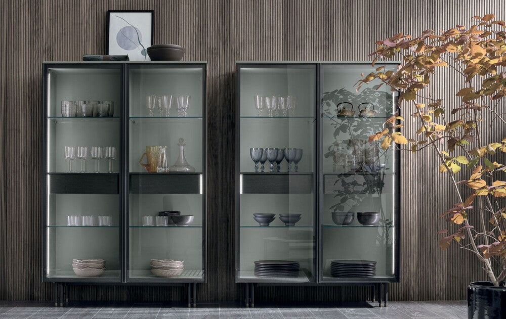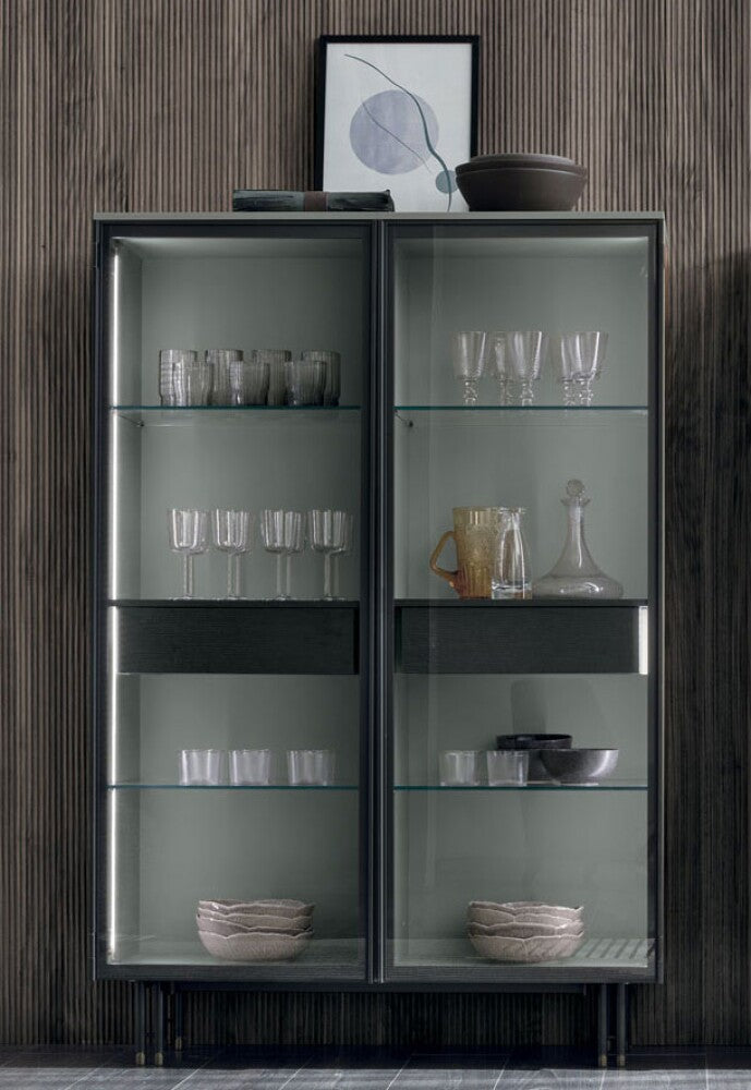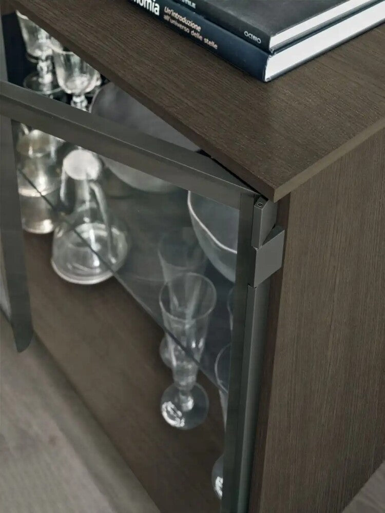 La vetrina è provvista di due ampie ante in vetro, realizzabili con finitura trasparente o fumé, incorniciate da un telaio in metallo antracite con maniglia integrata. Le ante si distinguono per l’apertura a 180°, un dettaglio tecnico che ne esalta la praticità e l’ergonomia.