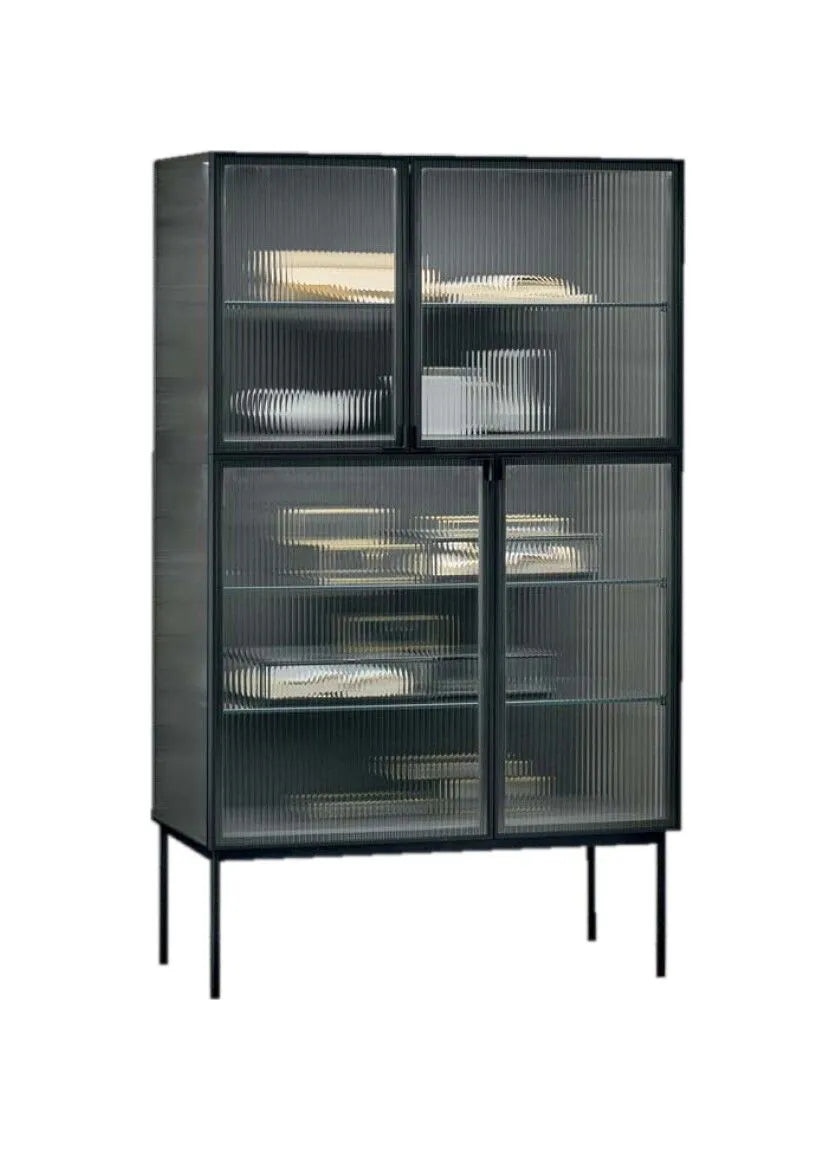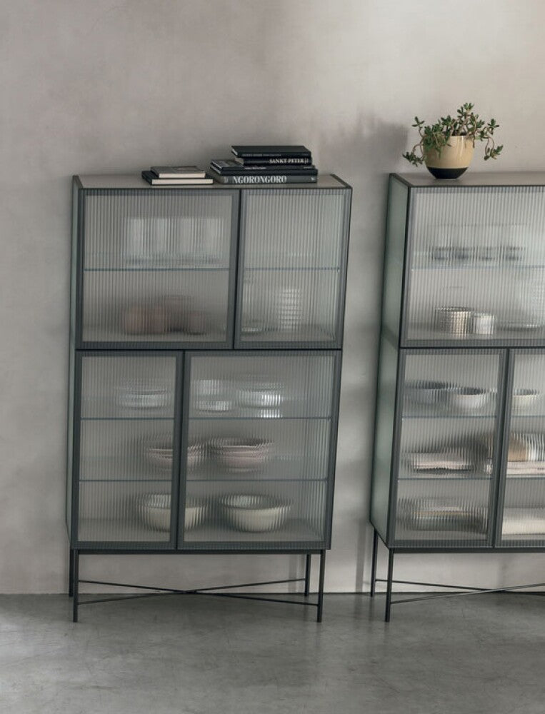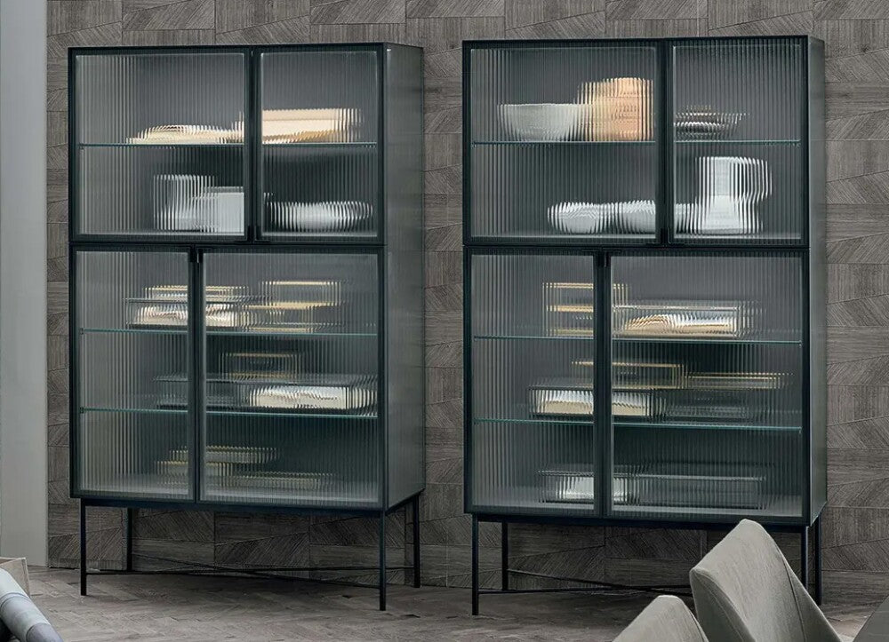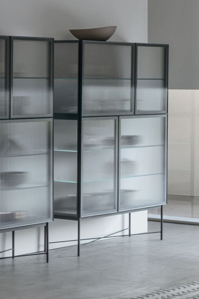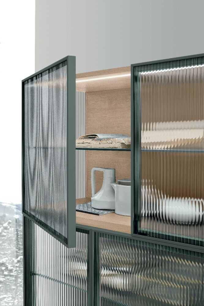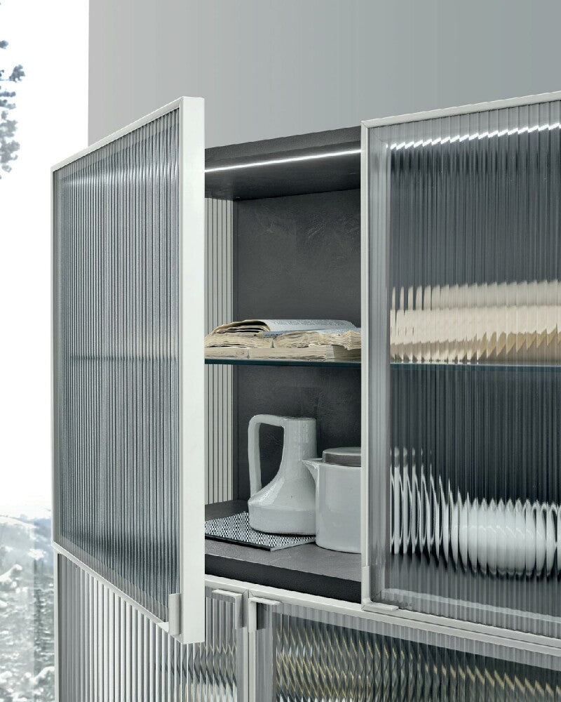 Caratterizzata da linee sobrie e proporzioni armoniose, la vetrina Nina è provvista di quattro ante con apertura push-pull e si distingue per il suggestivo vetro cannettato (canetté) che riveste i fianchi e i frontali. Questa particolare lavorazione crea un sofisticato effetto “vedo-non-vedo”, che valorizza gli oggetti contenuti all’interno donando profondità e movimento alla struttura. L’interazione tra luce, trasparenze e riflessi trasforma ogni angolo della casa in una piccola galleria d’arte.