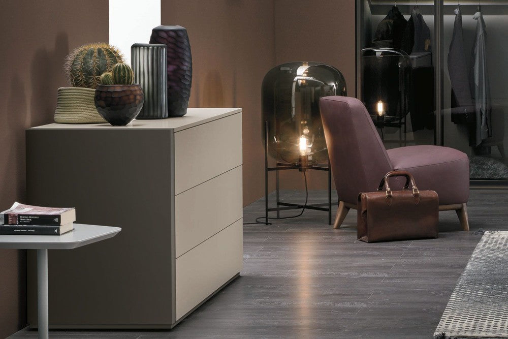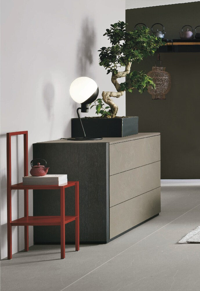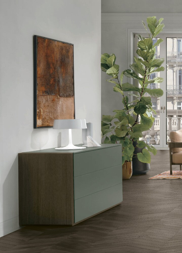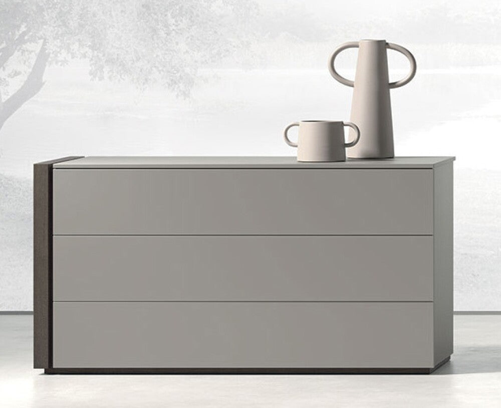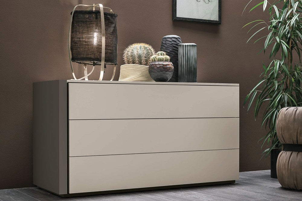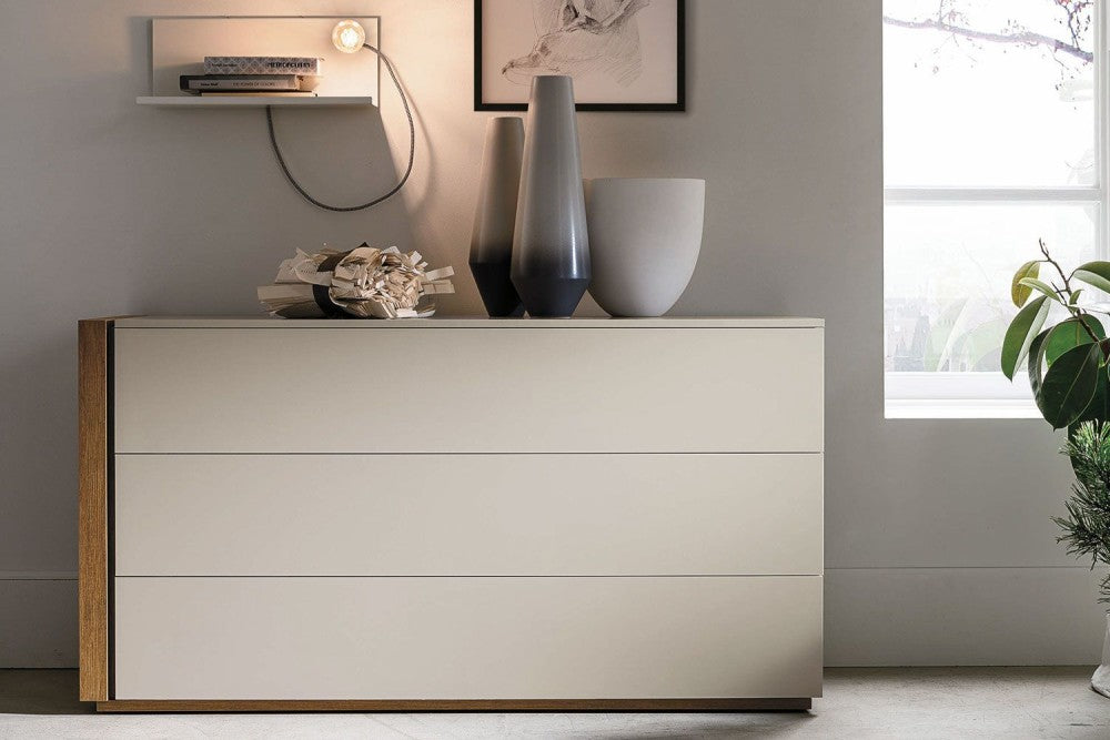Il comò Capitol è privo di maniglie: l’apertura dei 3 cassetti avviene tramite un’incavo laterale, soluzione che esalta l’essenzialità delle forme. Proposto nella versione con fianco di spessore maggiorato sul lato sinistro, è completamente personalizzabile grazie all’ampia gamma di finiture materiche (effetto legno, cemento, pietra, ecc.) e laccate (opache, a poro aperto o lucide). Una scelta perfetta per camere moderne e contemporanee.