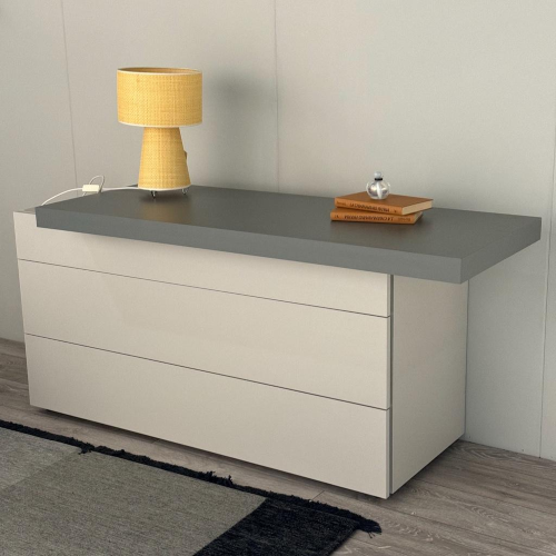 La particolarità del comò Argo nella versione scrittoio è il top con spessore di 6 cm, dotato di un innovativo meccanismo che consente lo scorrimento laterale (max 25 cm) e frontale (max 15 cm). Questa soluzione intelligente trasforma il comò in una funzionale postazione home office o in un elegante angolo make-up, disponibile nelle varianti DX o SX a seconda del verso di scorrimento. Essendo rifinito su tutti e quattro i lati, può essere collocato anche al centro della stanza.