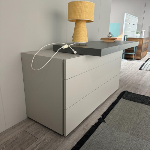 Il comò Argo Scrittoio di Tomasella appartiene al gruppo notte Argo, una collezione completa che include anche comodini a 2 o 4 cassetti, un comò a 3 cassetti e un settimanale a 5 cassetti.
