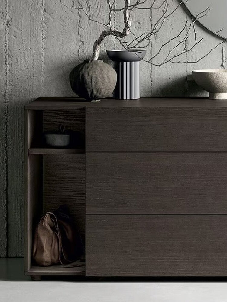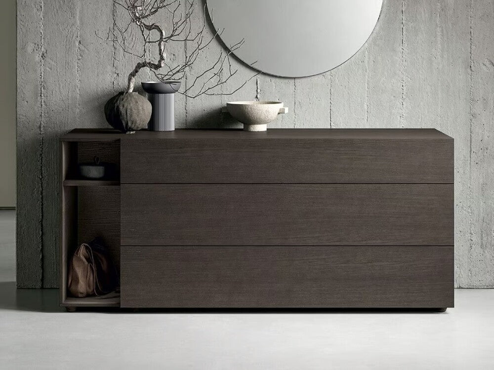 Perfetto per camere arredate in stile contemporaneo, il comò Theo è altamente personalizzabile: struttura e frontali possono essere realizzati in numerose finiture materiche (effetto legno, cemento, pietra, ecc.) oppure in tonalità laccate, opache o a poro aperto. Nella versione con vano a giorno, il fianco interno del vano è proposto nella stessa finitura scelta per i frontali, per un design armonico e coordinato.