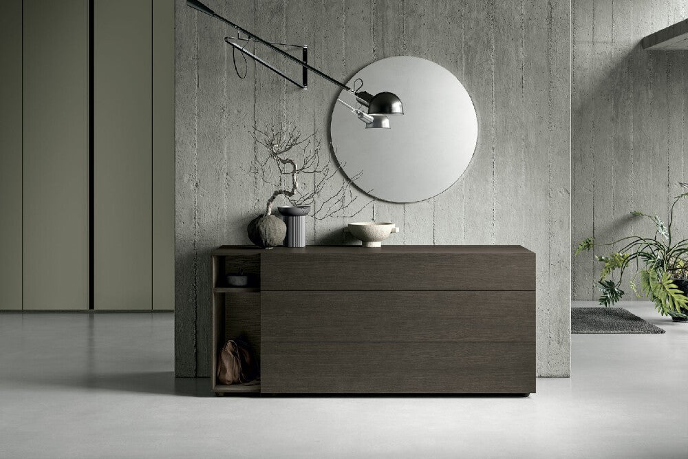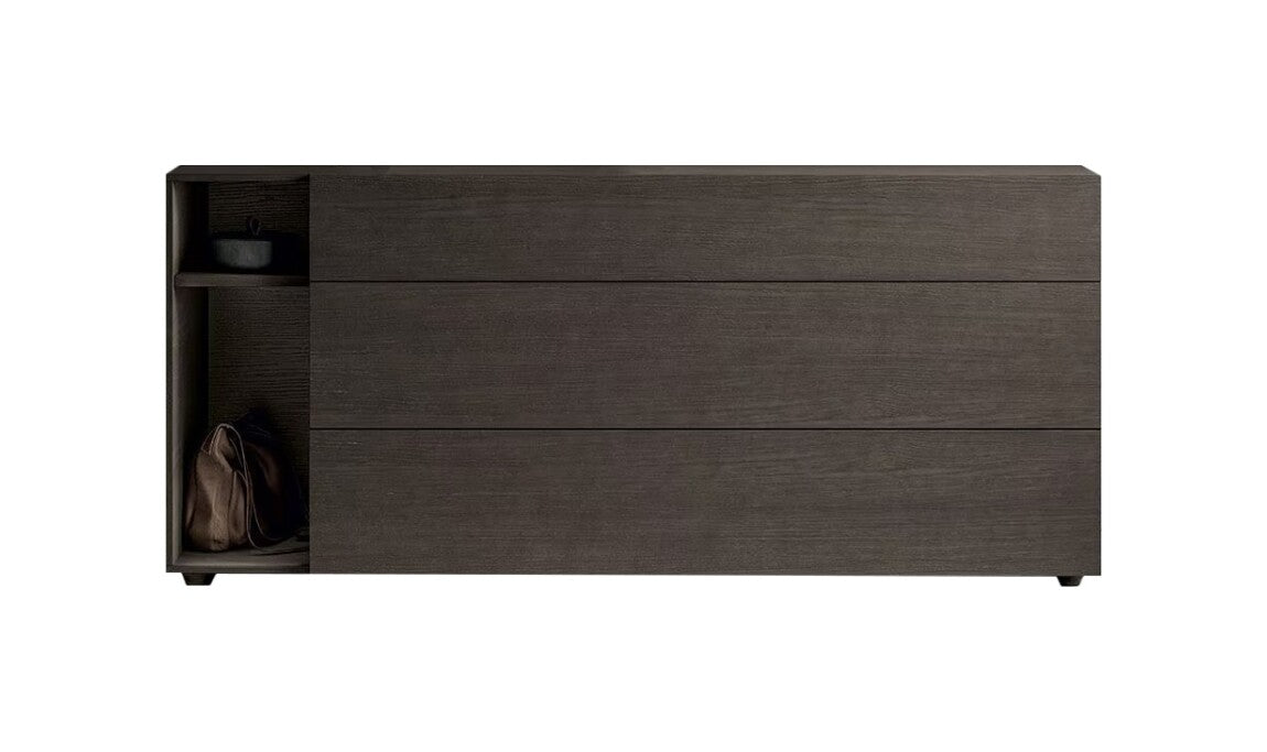 Dallo stile moderno e dalle linee pulite e rigorose, il comò Theo è disponibile in 4 varianti, di cui due con vano a giorno laterale (a destra o a sinistra), suddiviso in due ripiani: uno spazio pratico e decorativo, ideale per riporre libri, oggetti personali o accessori, mantenendoli sempre a portata di mano e in bella vista.