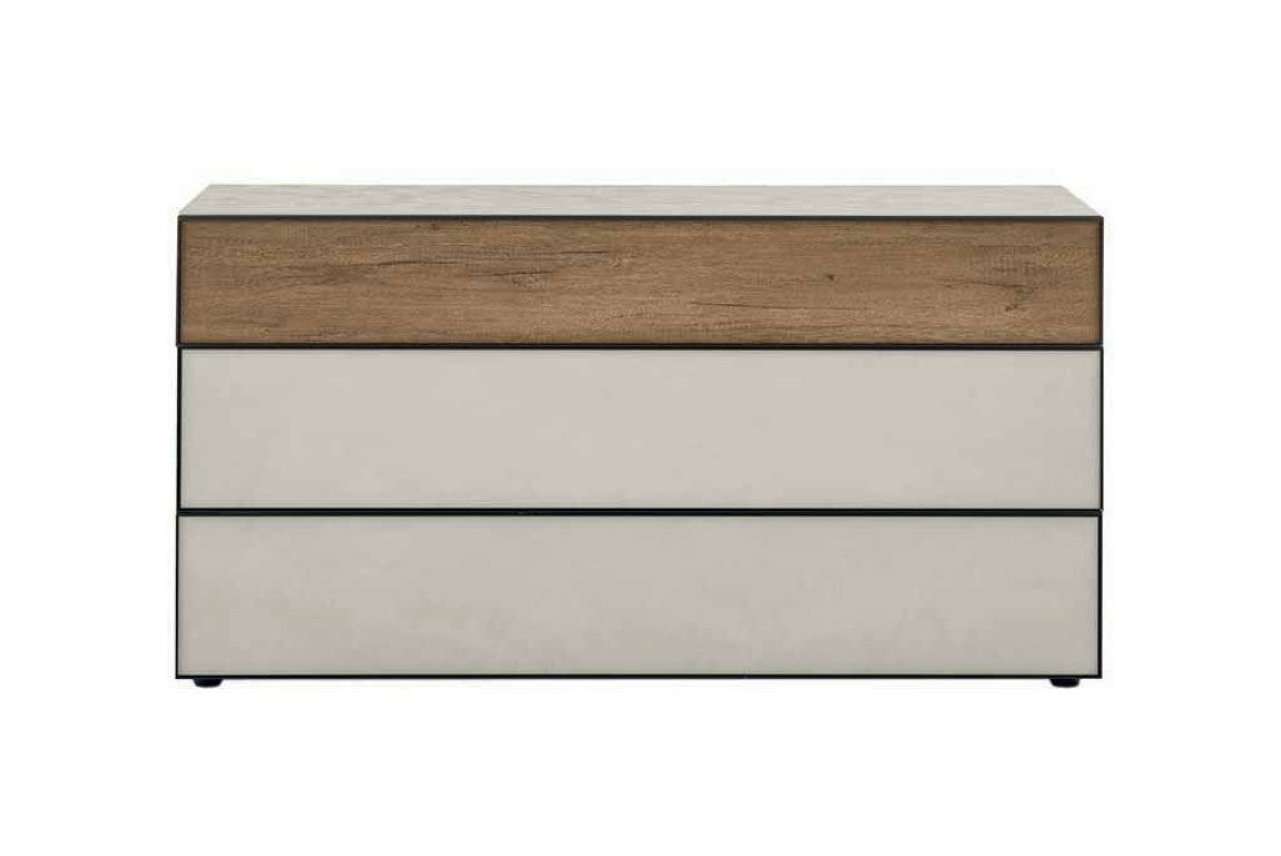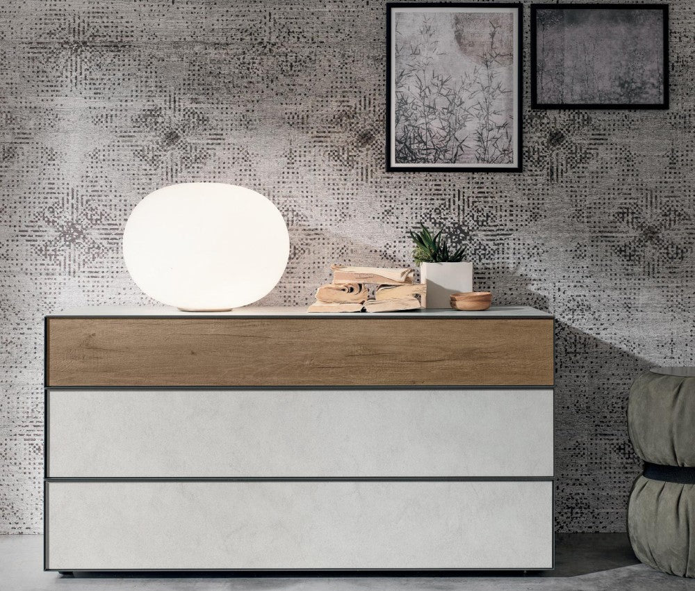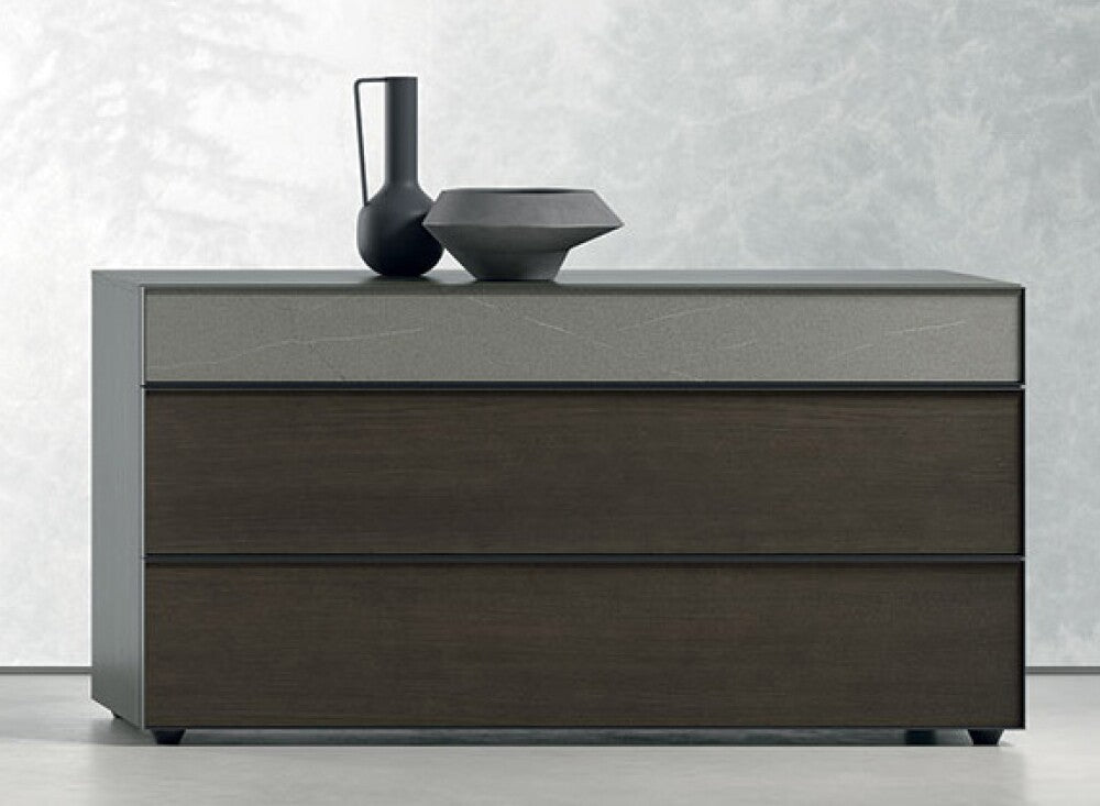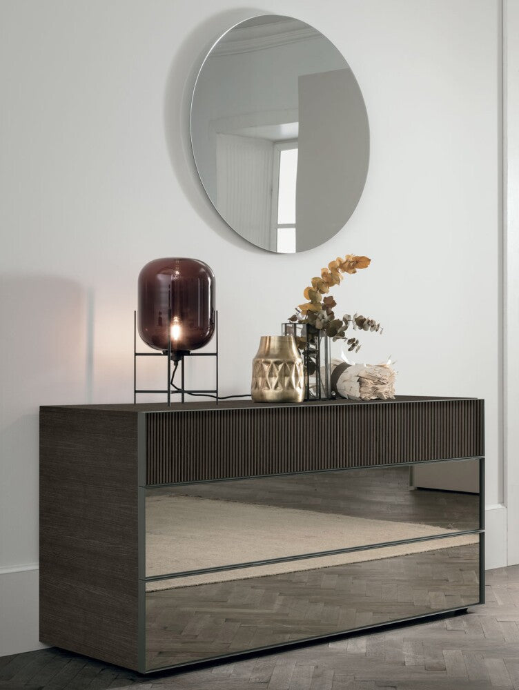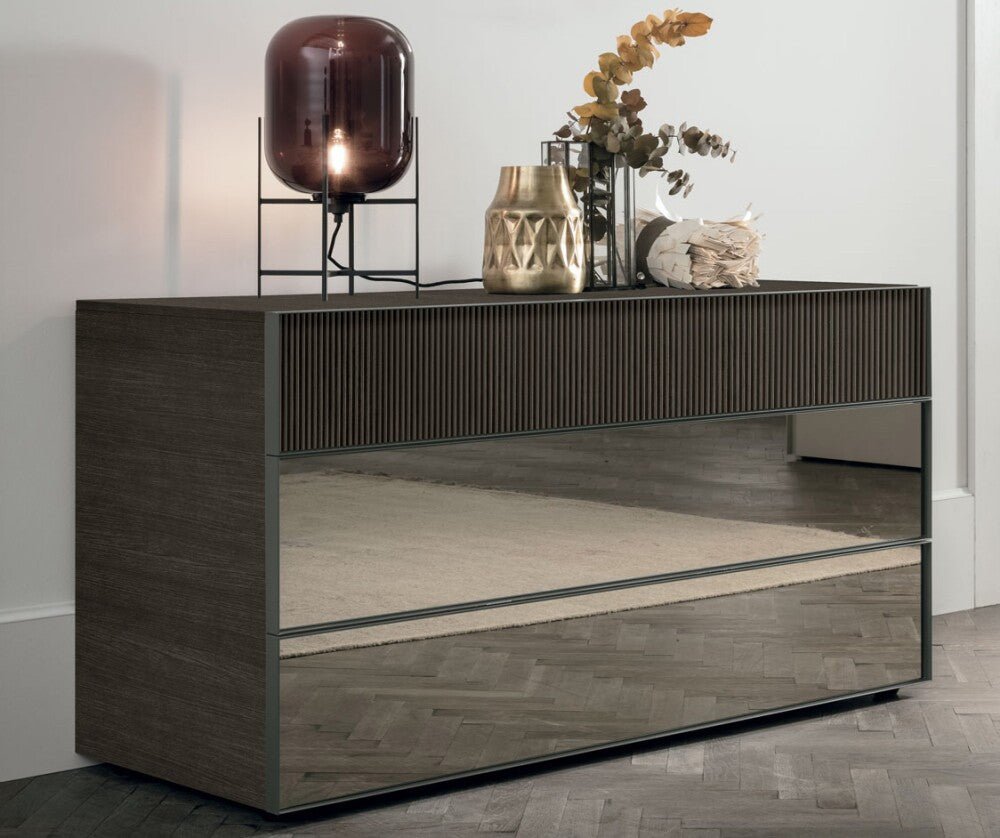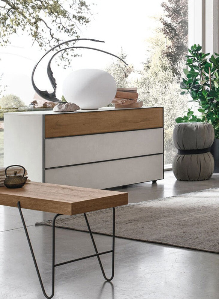 Altamente personalizzabile, il comò Vinci permette di scegliere la finitura della struttura (in materico, laccato opaco o laccato a poro aperto), quella dei frontali e perfino il profilo metallico che li incornicia. Il frontale può essere arricchito con materiali a contrasto: legno canetté per il cassetto superiore o specchio per i due inferiori, creando combinazioni uniche e originali.