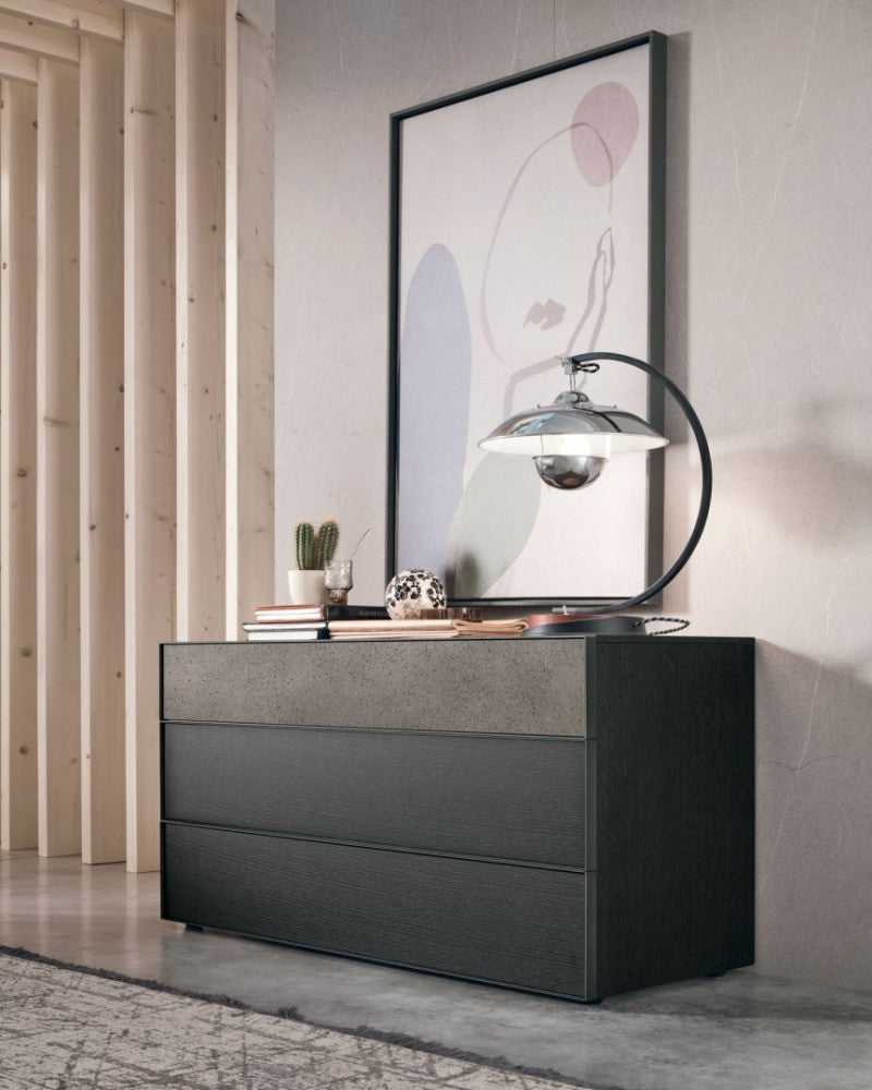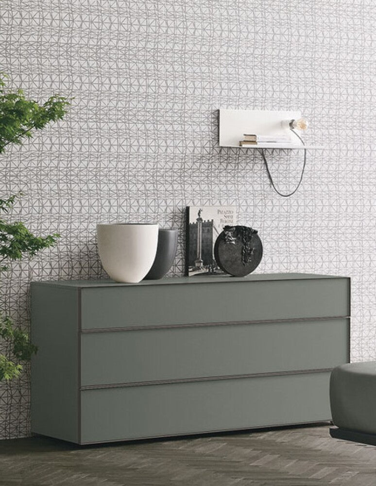 Il comò Vinci di Tomasella fa parte dell’omonimo gruppo notte, una collezione che comprende anche un comodino a 2 cassetti e un settimanale a 5 cassetti.