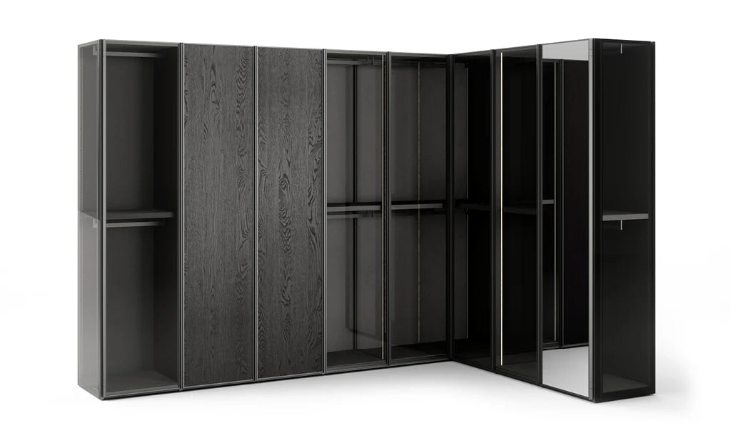 L’armadio Perry si distingue per il suo telaio in metallo e l’anta personalizzabile in vetro temprato o in pannelli di materiali pregiati, come cuoio, legno o finiture laccate, anche combinabili tra loro per creare soluzioni uniche e di grande impatto estetico.