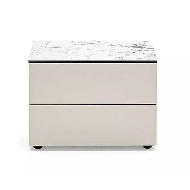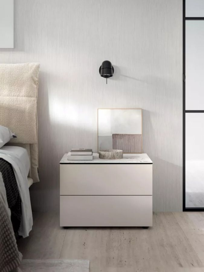 Il mobile è proposto nelle eleganti finiture bianco, canapa e tortora, tonalità neutre e versatili che si integrano facilmente in diversi stili di interior design. Il piano in ceramica effetto marmo bianco aggiunge un tocco sofisticato e materico, valorizzando l’estetica minimale del comodino moderno.