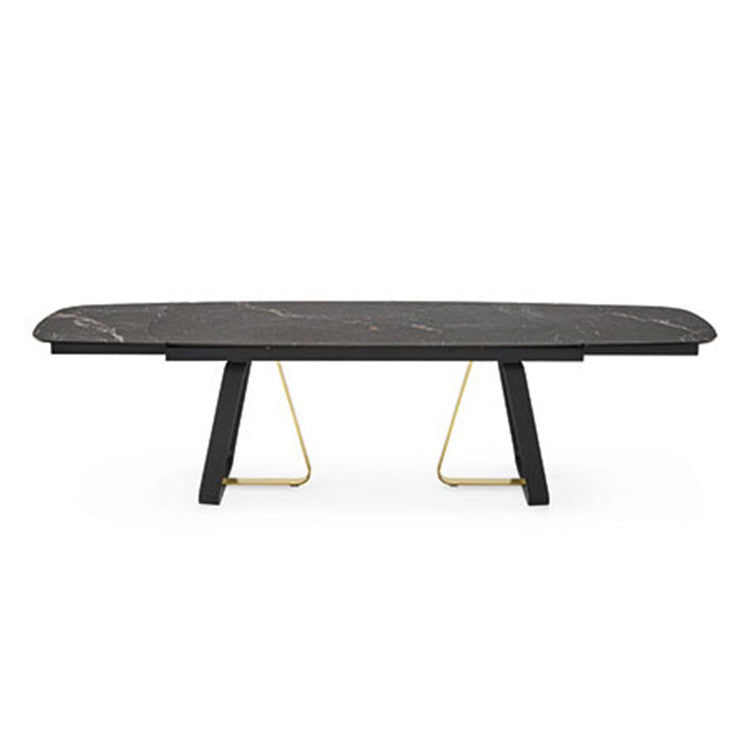 La base composta da due elementi in metallo è disponibile interamente nella stessa finitura oppure con le parti centrali in una finitura metallica differente, offrendo interessanti possibilità di personalizzazione estetica. Il piano sagomato dai bordi arrotondati, realizzato in pregiata ceramica, è allungabile grazie alle allunghe su due lati apribili singolarmente, consentendo di ampliare la superficie in modo pratico e intuitivo, mantenendo un’immagine elegante e coerente anche in configurazione estesa.