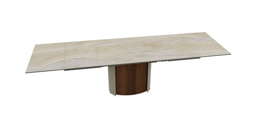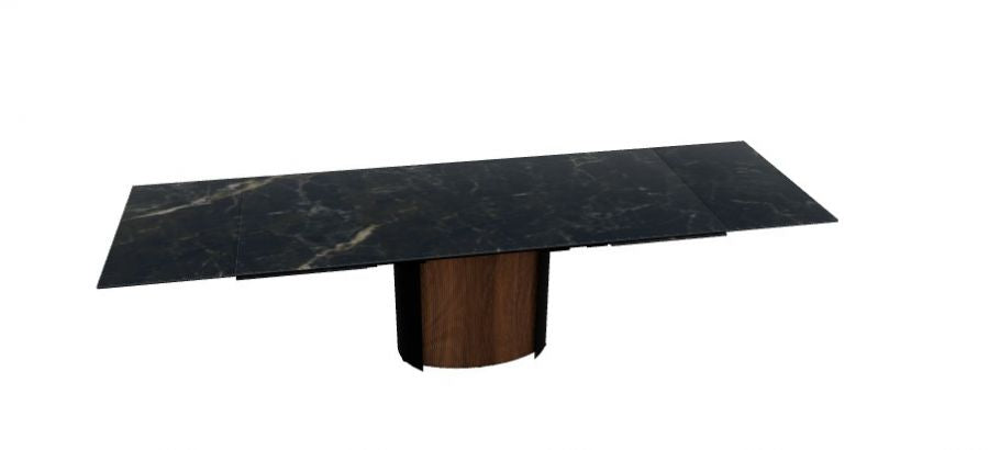 La base scultorea in metallo è arricchita da due inserti in legno, disponibili anche nella versione cannettata, che introducono una raffinata componente materica e rafforzano la percezione di solidità e resistenza. Il piano rettangolare in pregiata ceramica è allungabile grazie a due allunghe laterali apribili singolarmente, consentendo di ampliare la superficie in modo pratico e intuitivo, mantenendo un’estetica ordinata e coerente anche in configurazione estesa.