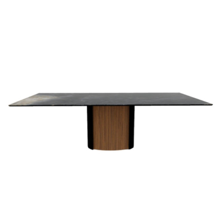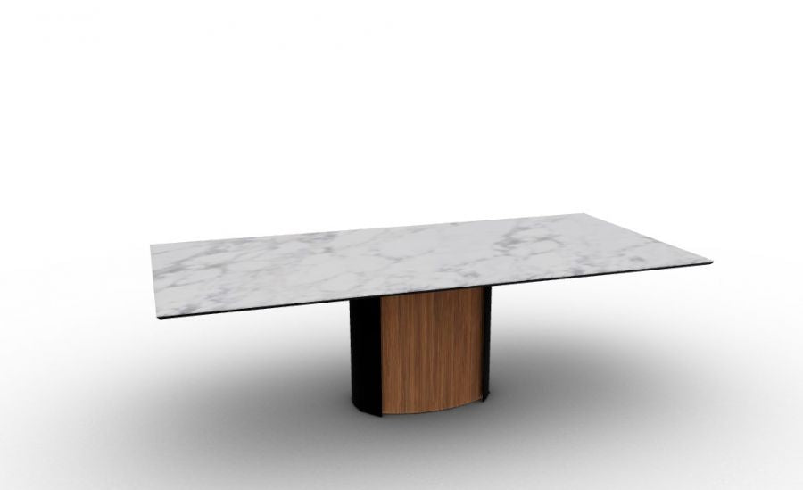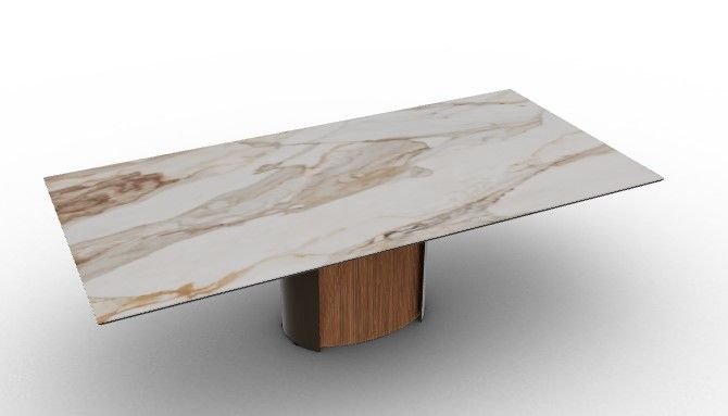 La base scultorea in metallo è impreziosita da due inserti in legno, disponibili anche nella versione cannettata, che aggiungono profondità materica e rafforzano la percezione di solidità e resistenza. Il piano rettangolare in pregiata ceramica valorizza il progetto con una superficie raffinata, durevole e pratica, ideale sia per l’uso quotidiano sia per momenti conviviali.