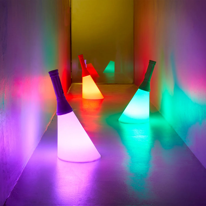Realizzata in polietilene riciclabile, Flash è una lampada wireless con batteria ricaricabile, dotata di LED RGB regolabile tramite telecomando per creare atmosfere dinamiche e personalizzate.