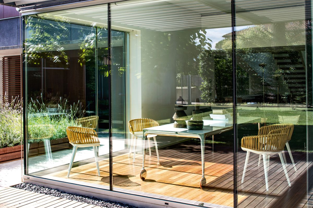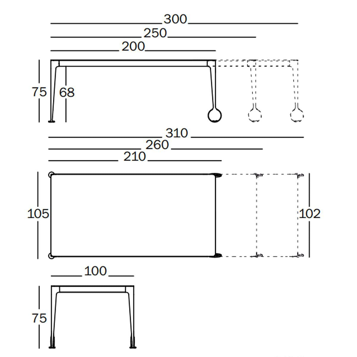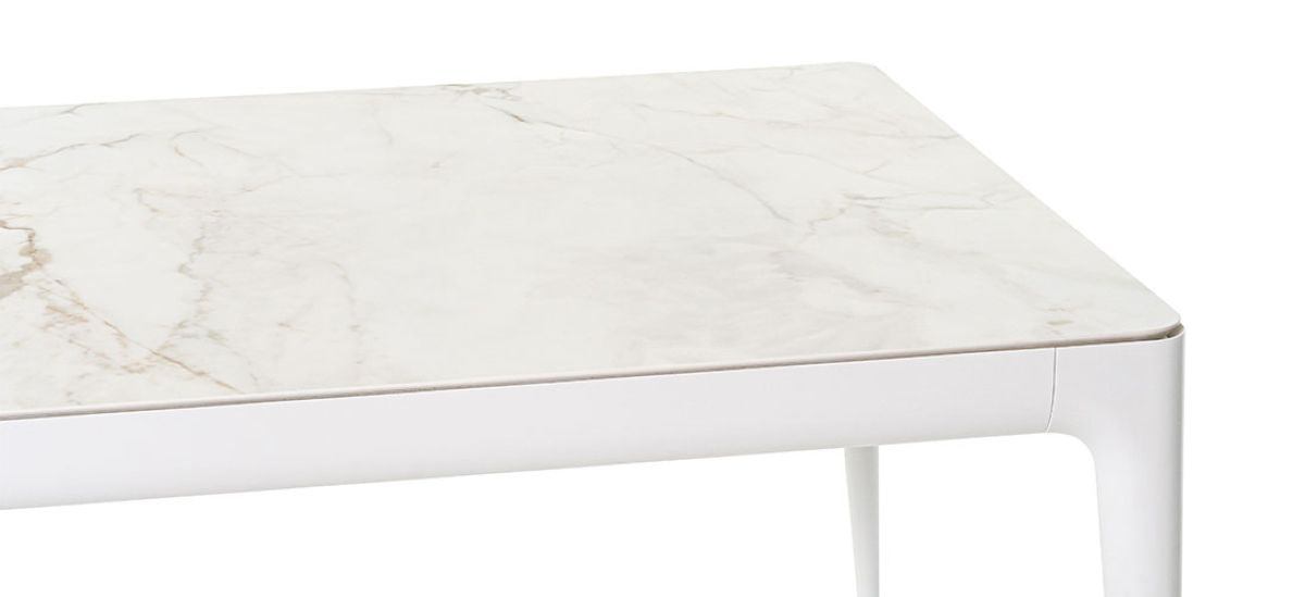 La struttura è composta da gambe in pressofusione di alluminio e traversi in profilato di alluminio verniciato, elementi che garantiscono stabilità, resistenza e durata nel tempo. Il tavolo è dotato di ruote in gomma, che facilitano lo spostamento senza compromettere l’equilibrio e la protezione delle superfici.