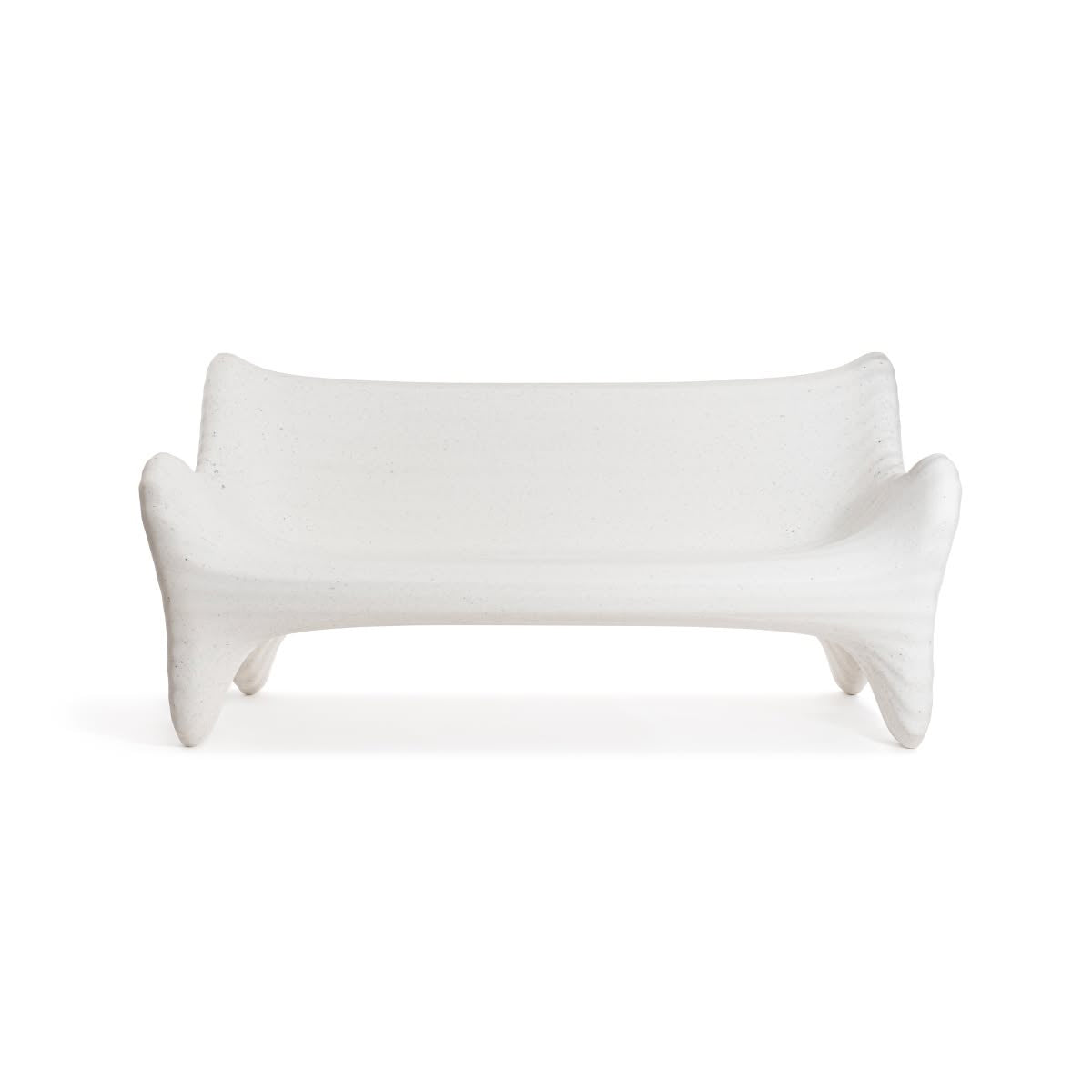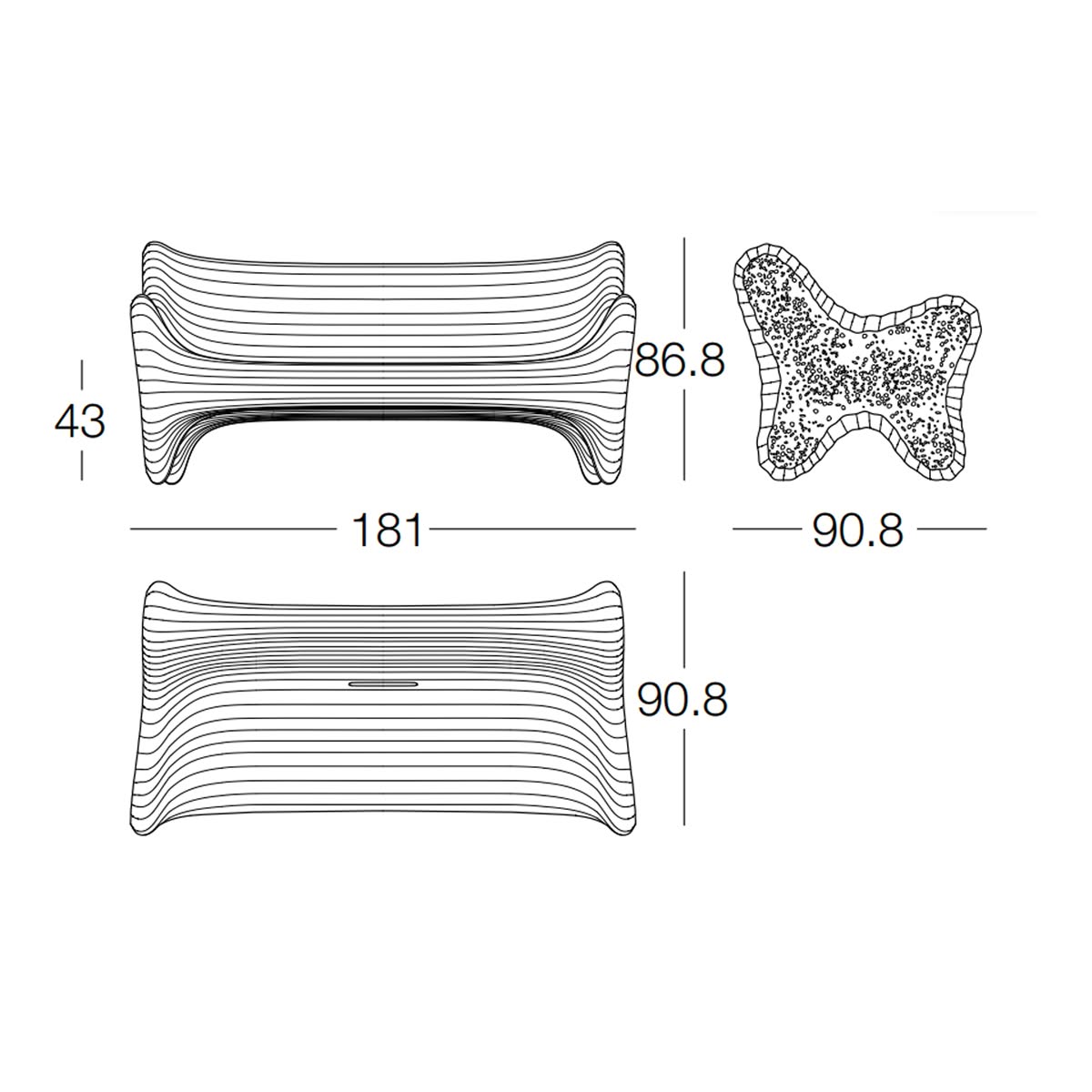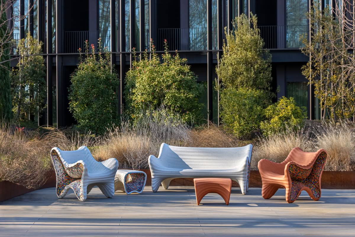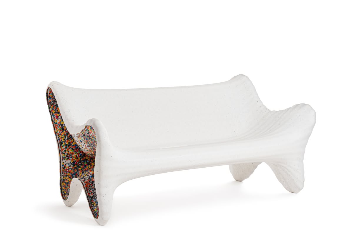 Realizzato in polietilene contenente materiale riciclato post-consumo, il divano è arricchito da chips laterali multicolore in polietilene riciclato post-industriale, visibili e volutamente valorizzate come segno distintivo del progetto. Ogni pezzo presenta così un aspetto unico, espressione concreta di un approccio circolare al design.