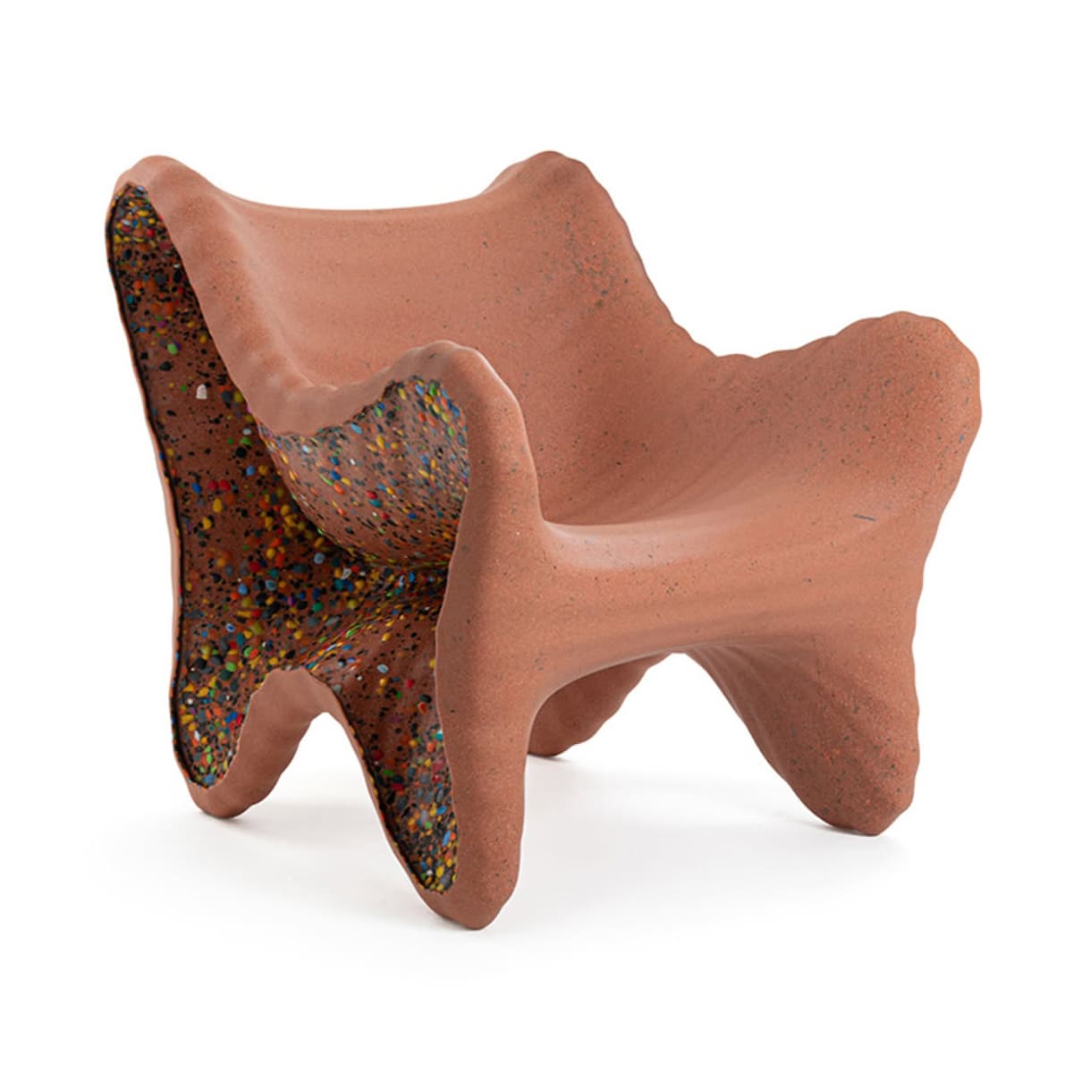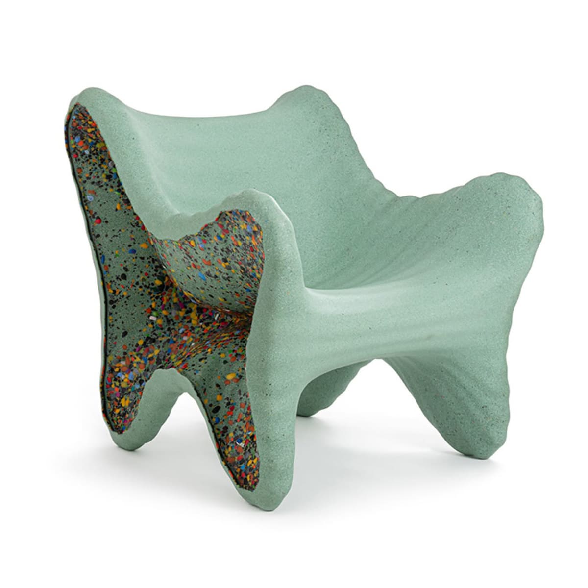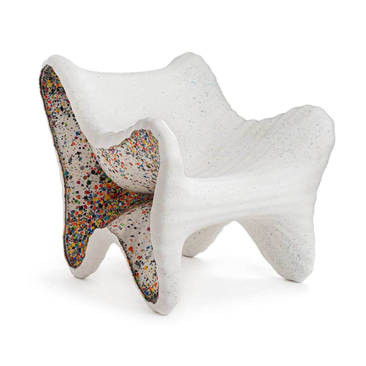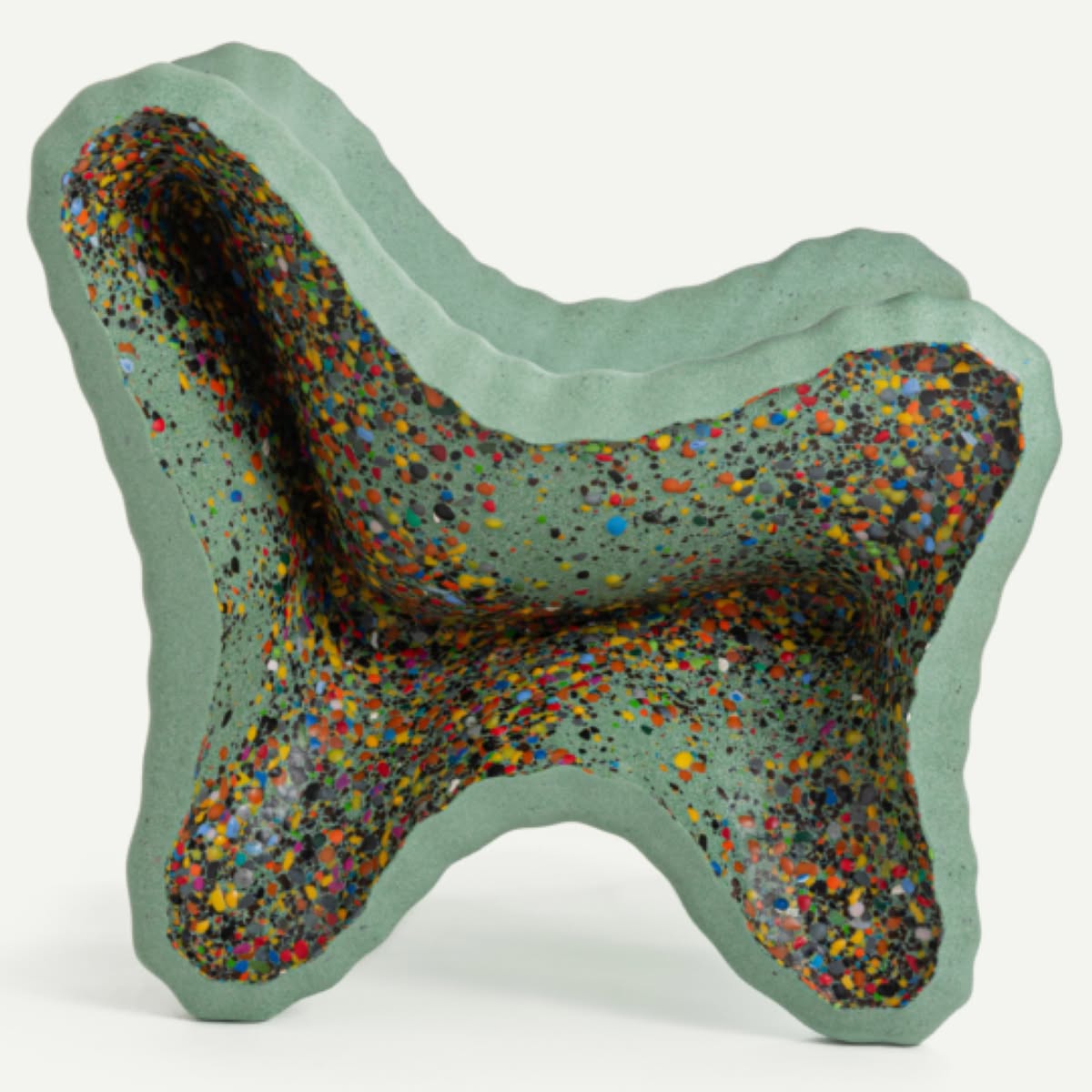Realizzata in polietilene contenente materiale riciclato post-consumo, la poltrona è caratterizzata da chips laterali multicolore in polietilene riciclato post-industriale, volutamente lasciate a vista come segno distintivo del progetto. Ogni pezzo risulta così unico, espressione di un approccio progettuale orientato alla sostenibilità e alla valorizzazione della materia.