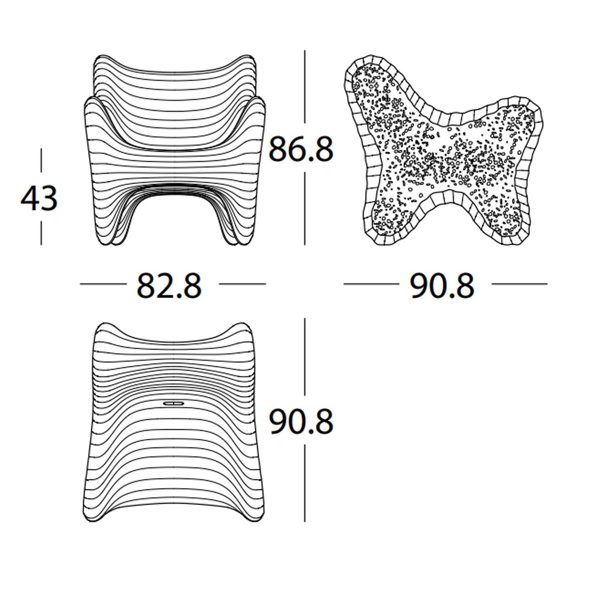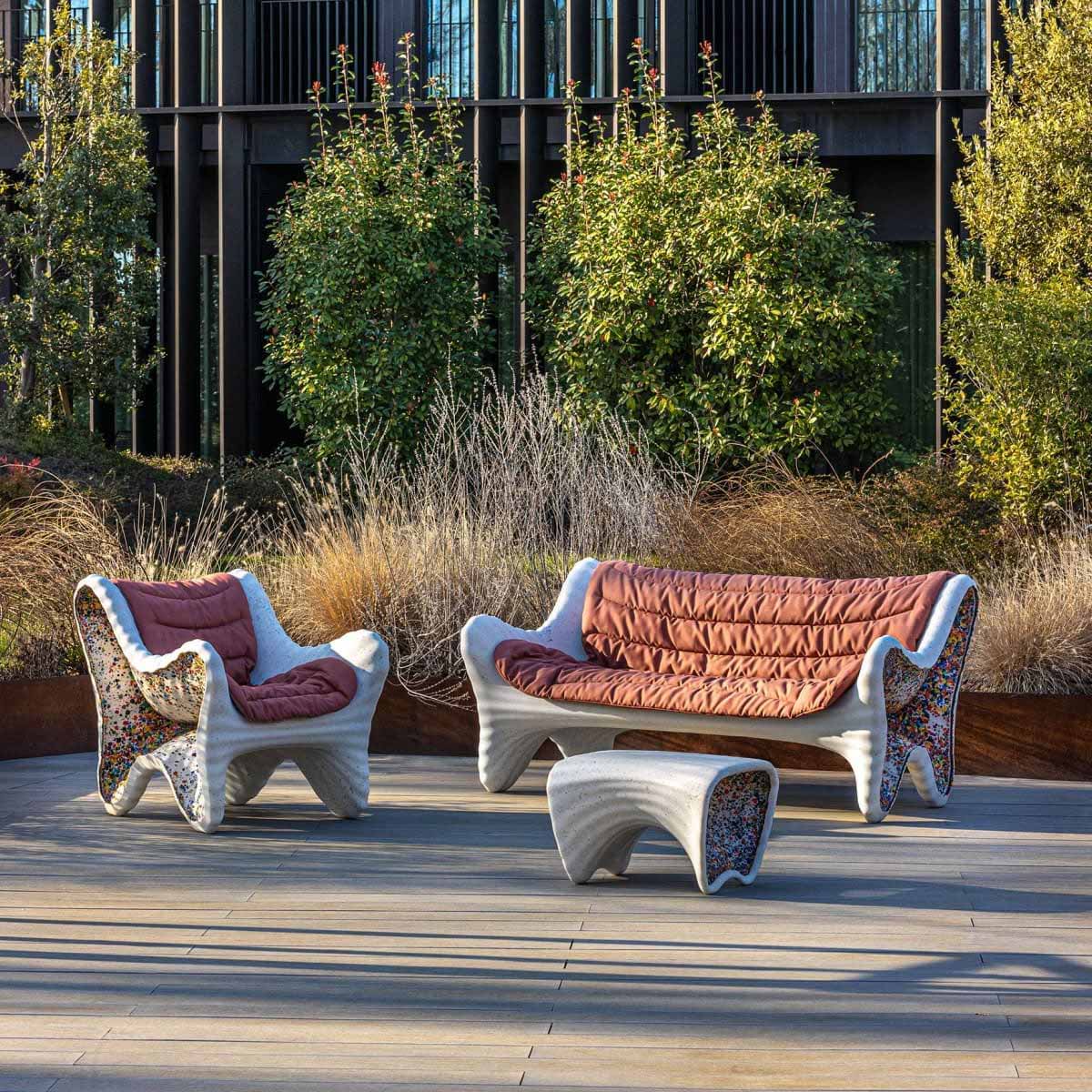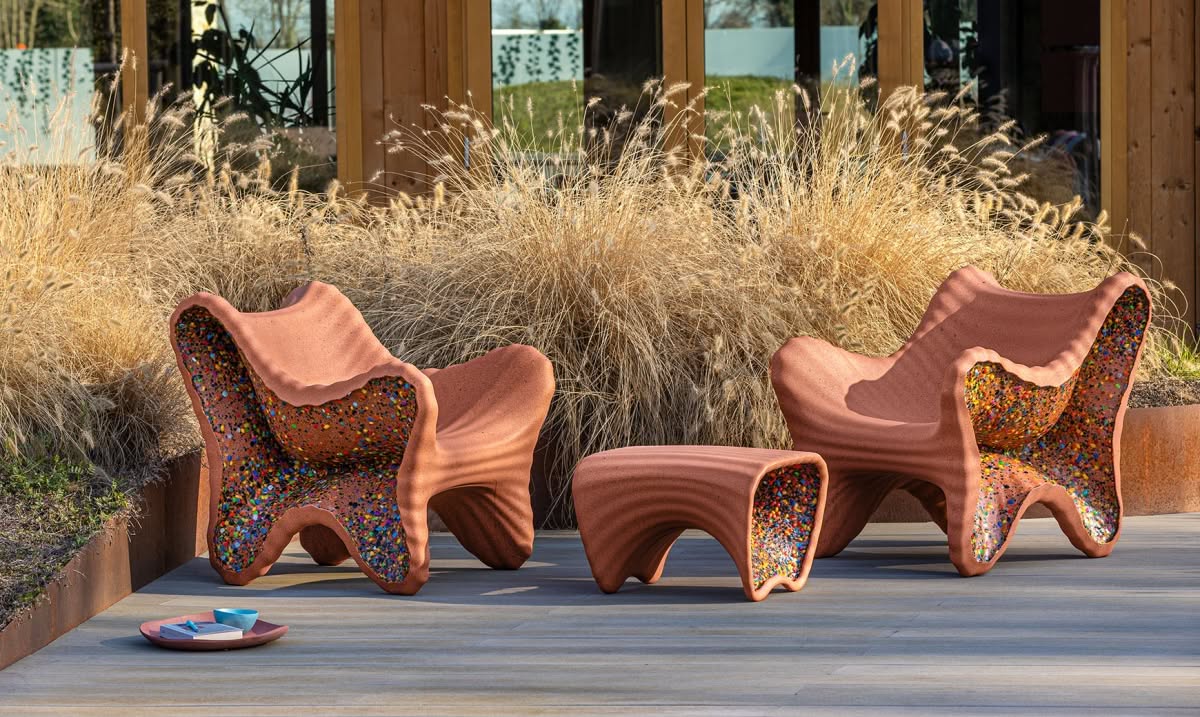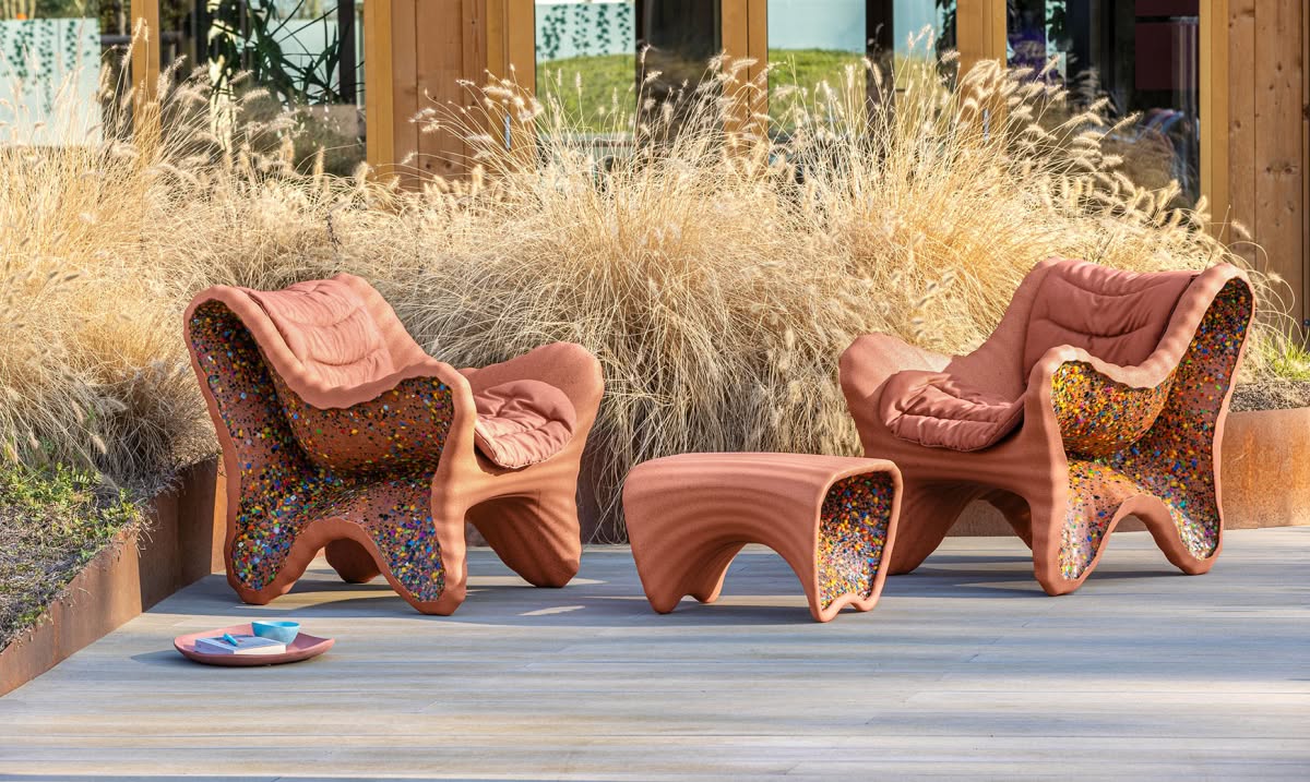 Realizzata in polietilene contenente materiale riciclato post-consumo, la poltrona è caratterizzata da chips laterali multicolore in polietilene riciclato post-industriale, volutamente lasciate a vista come segno distintivo del progetto. Ogni pezzo risulta così unico, espressione di un approccio progettuale orientato alla sostenibilità e alla valorizzazione della materia.