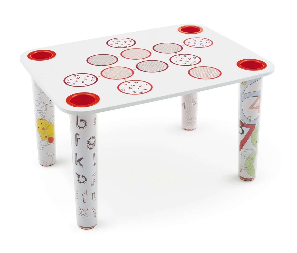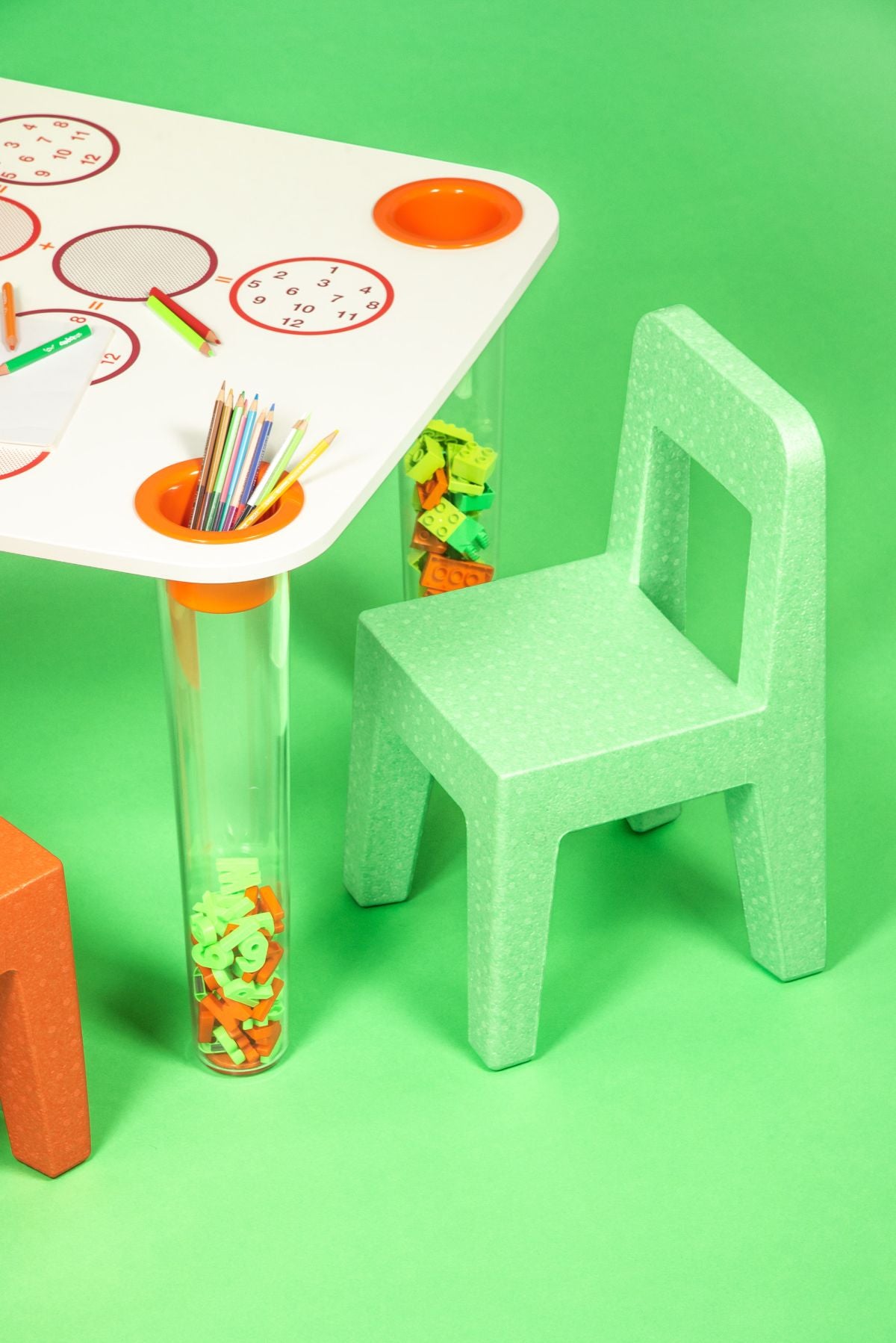 La struttura si distingue per le gambe in policarbonato trasparente neutro, stampate a iniezione, che conferiscono al tavolino un effetto leggero ed etereo, perfetto per integrarsi armoniosamente in camerette e spazi creativi. Il piano in MDF, rivestito con foglia polimerica, è progettato per resistere all’uso quotidiano ed è forato per l’alloggiamento delle vaschette portapenne in ABS, disponibili a seconda della configurazione.