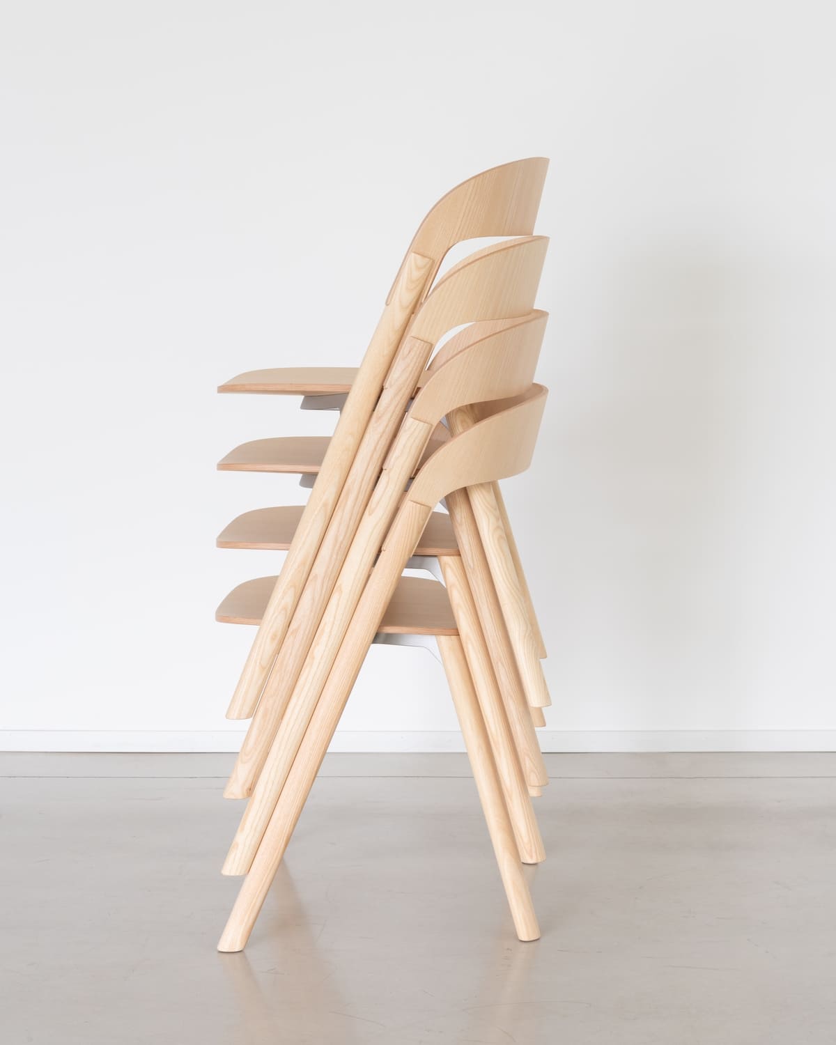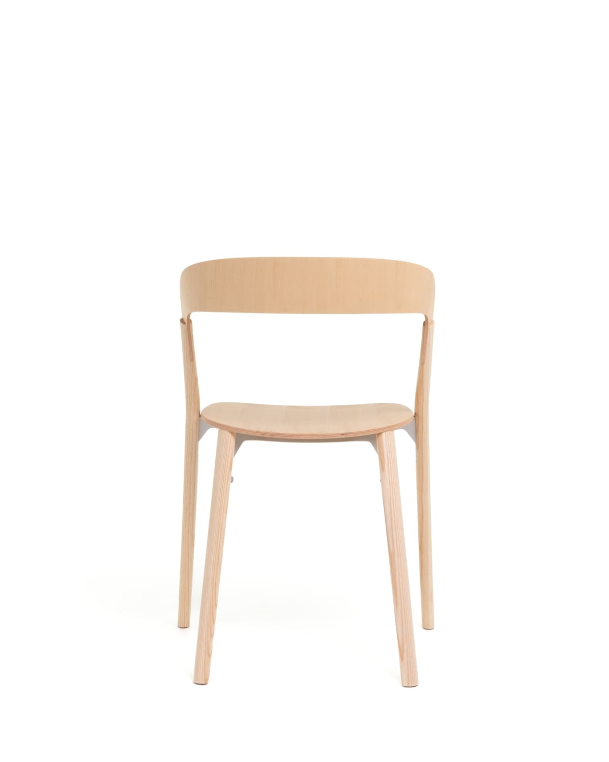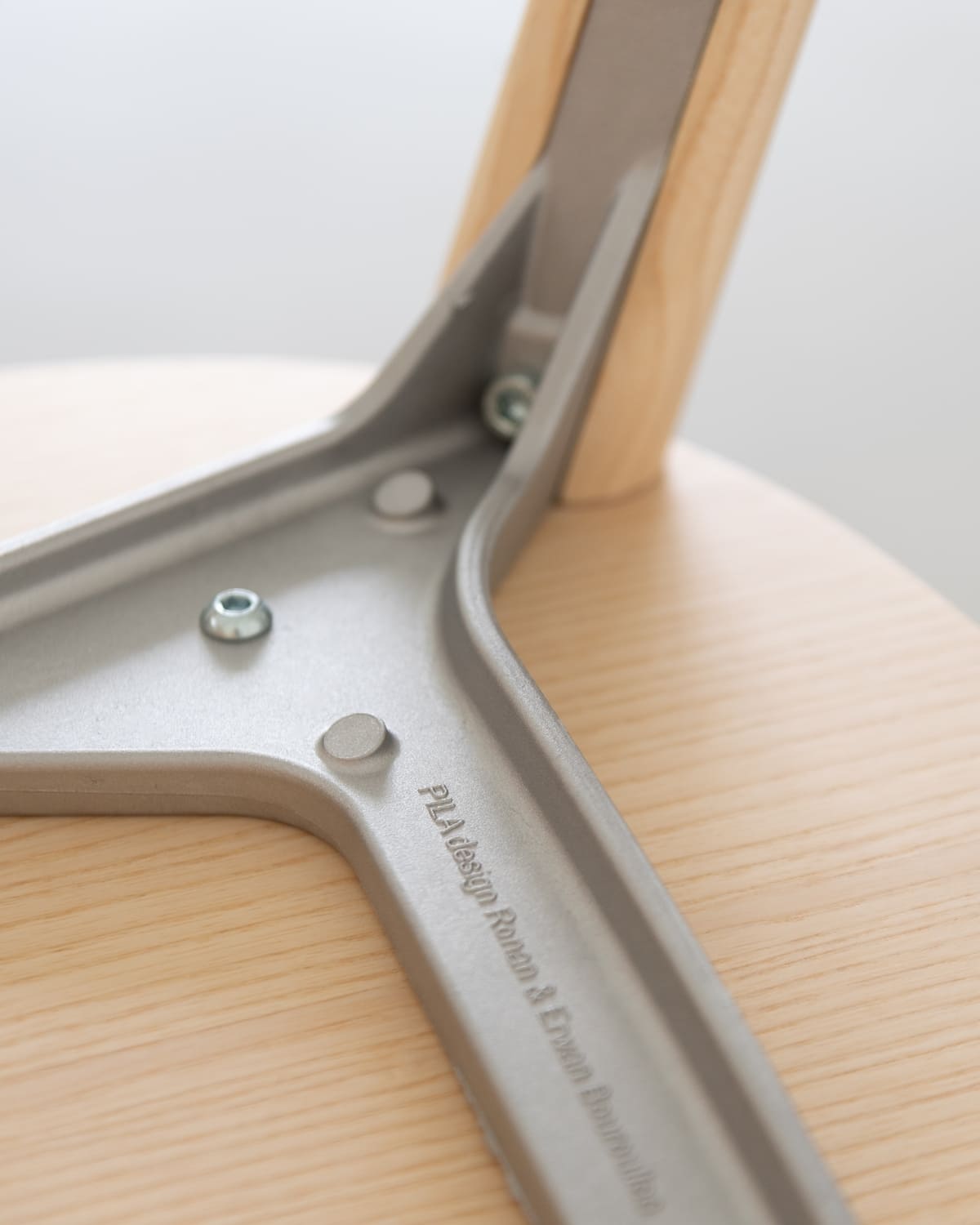 Sedile e schienale sono realizzati in multistrato di frassino, disponibili in finitura naturale o verniciata, mentre le gambe in massello di frassino garantiscono solidità e stabilità strutturale. L’elemento distintivo del progetto è il giunto di connessione in pressofusione di alluminio, disponibile sabbiato o verniciato in resina epossidica, che introduce un raffinato contrasto materico e sottolinea l’approccio tecnico del design.