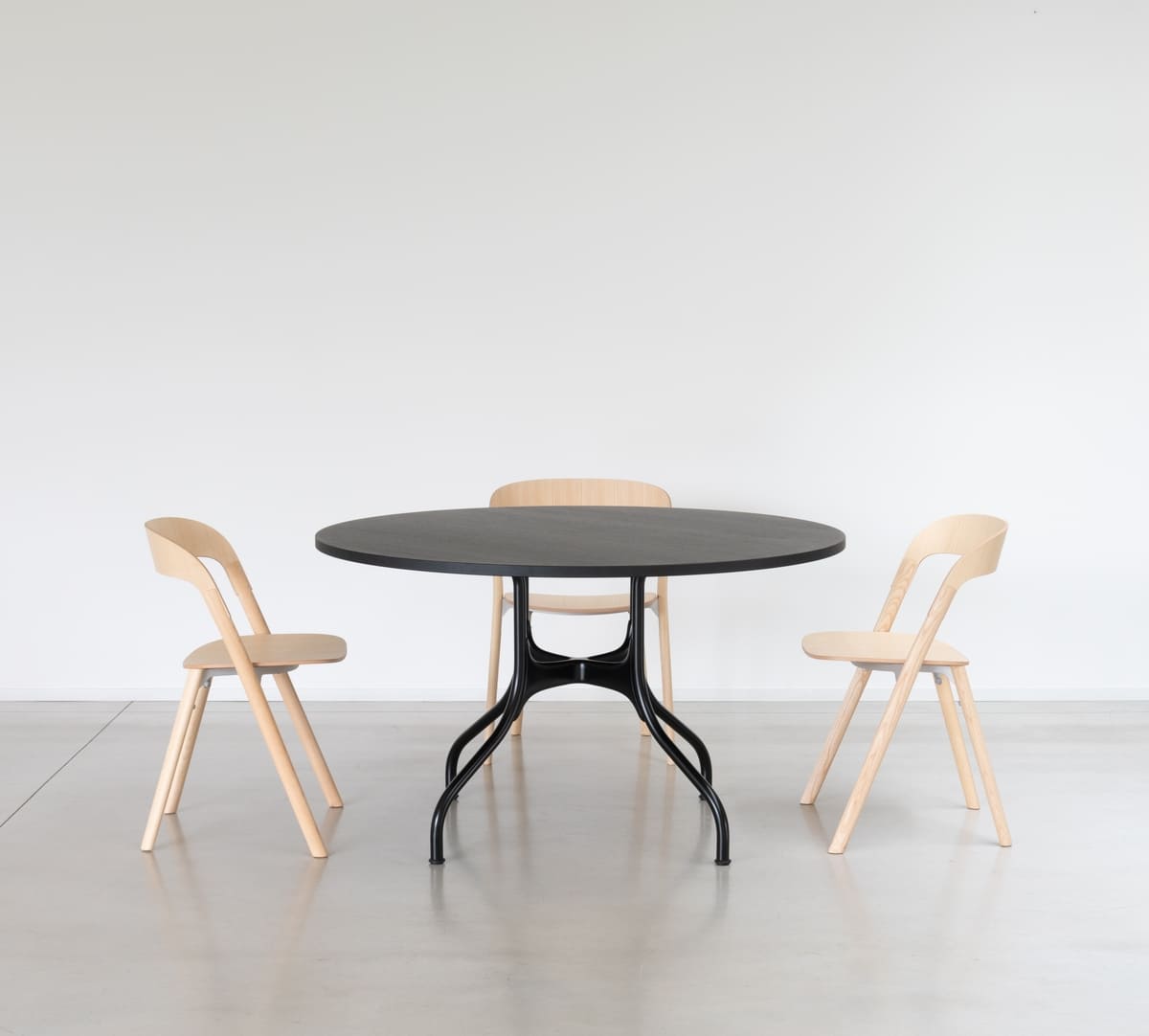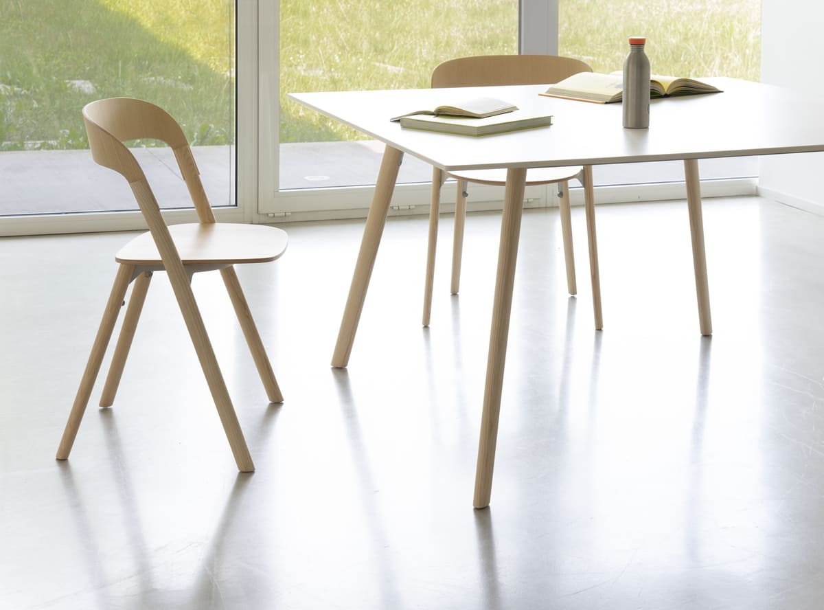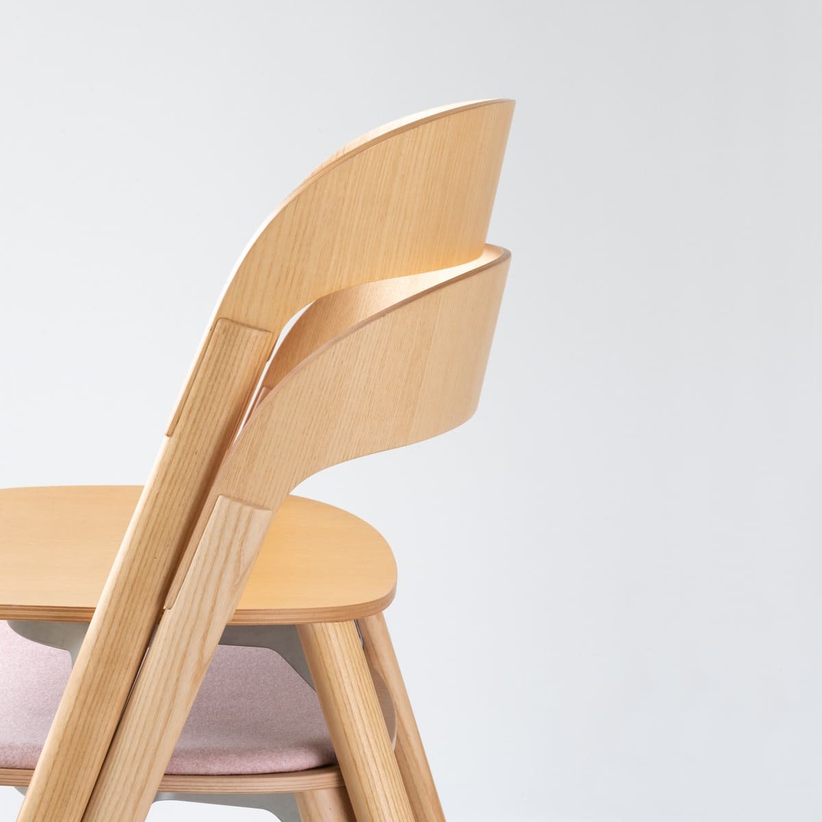 Sedile e schienale sono realizzati in multistrato di frassino, disponibili in finitura naturale o verniciata, mentre le gambe in massello di frassino garantiscono solidità e stabilità strutturale. L’elemento distintivo del progetto è il giunto di connessione in pressofusione di alluminio, disponibile sabbiato o verniciato in resina epossidica, che introduce un raffinato contrasto materico e sottolinea l’approccio tecnico del design.