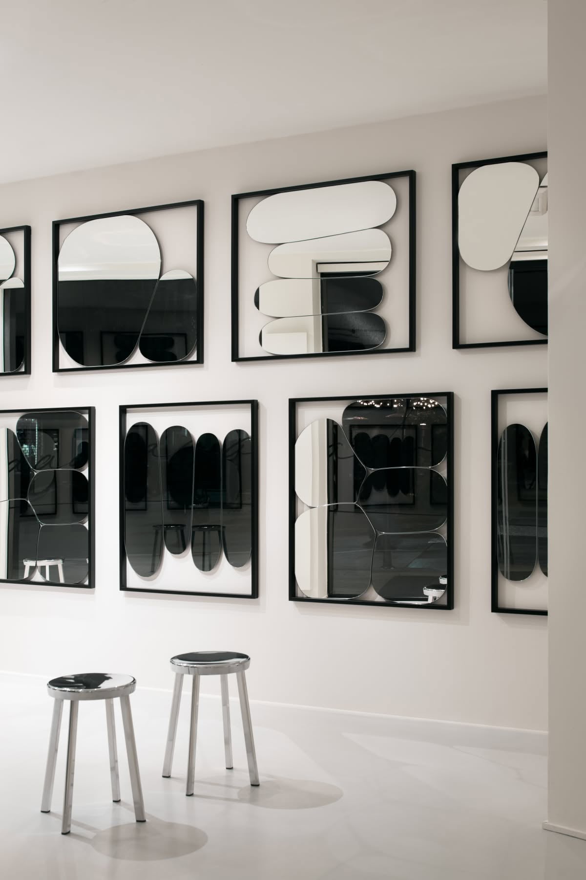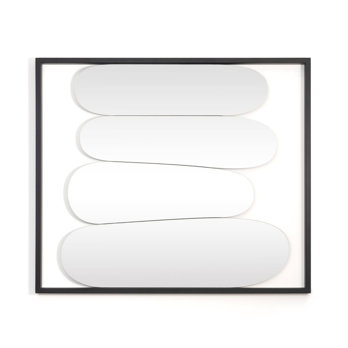 Caratterizzato da vetro retropellicolato e da una struttura pensata per una installazione flessibile, lo specchio Squash può essere fissato a muro su quattro lati, permettendo diverse configurazioni compositive. A seconda del modello, la cornice o gli elementi funzionali sono realizzati in estruso di alluminio verniciato nero oppure in massello di frassino nero, materiali che conferiscono eleganza, solidità e un’estetica contemporanea.