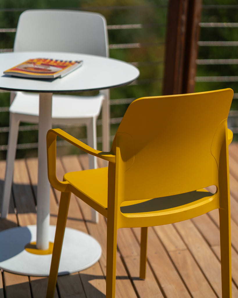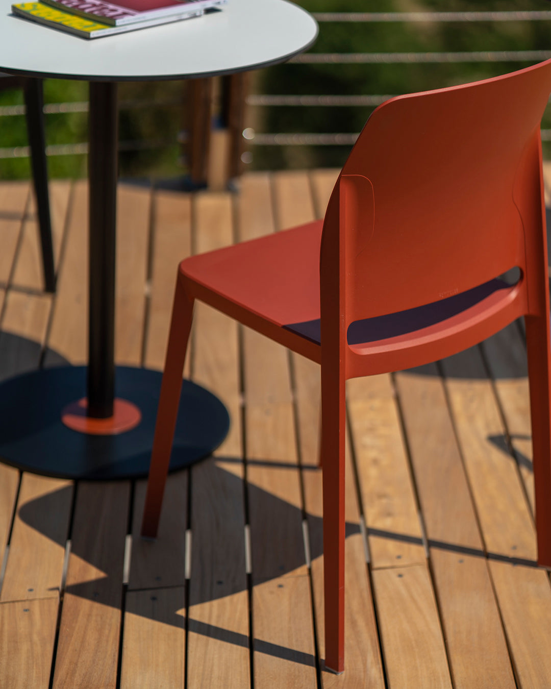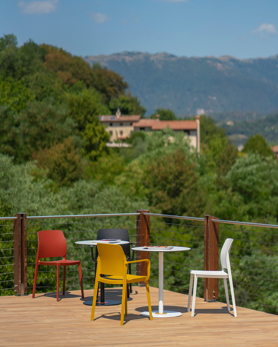 Il tavolo è disponibile con top in finitura Cleaf (spessore 18 mm bordato), perfetto per ambienti interni grazie alle sue texture effetto legno, pietra e superfici materiche. Per ordini superiori a 25 pezzi, il top può essere realizzato anche in HPL da 10 mm, ideale per uso esterno, oppure in melamminico, garantendo massima flessibilità per progetti contract e forniture professionali.