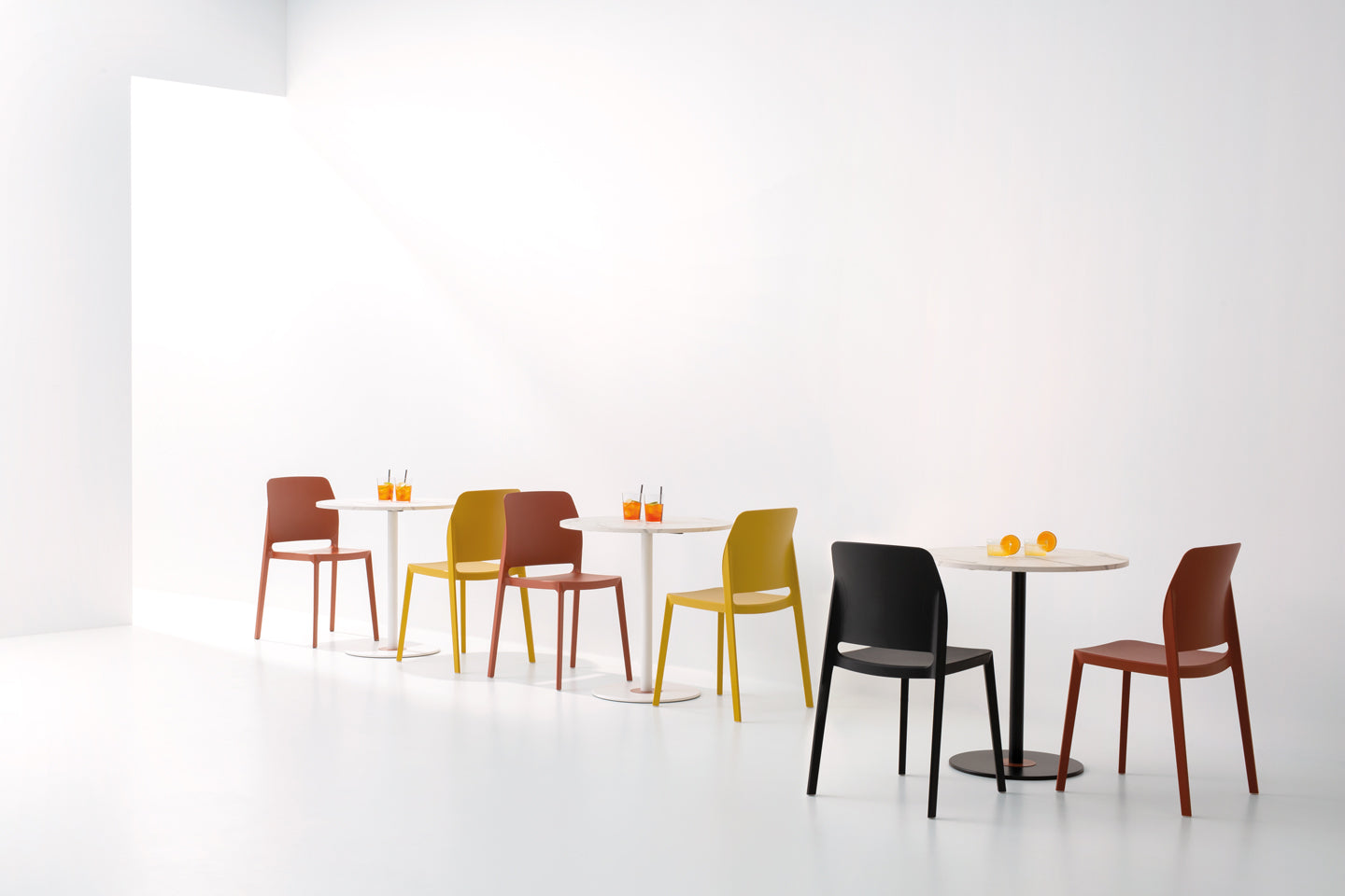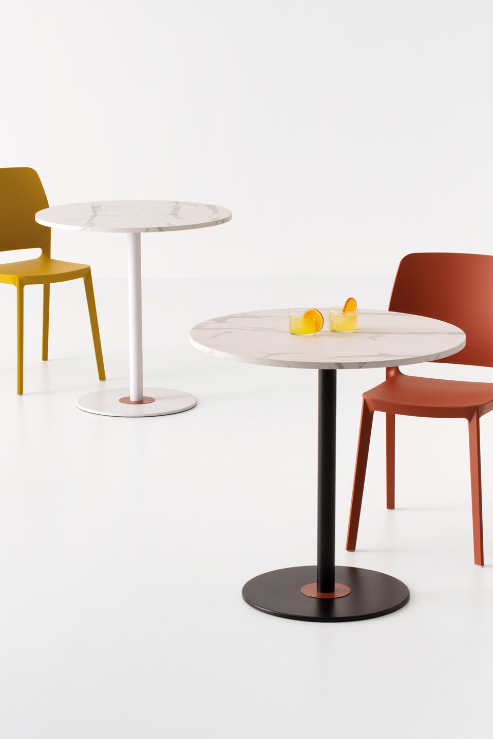 Ovo è disponibile in diverse dimensioni e altezze, incluse varianti ovoidali da 70 e 80 cm, una versione rotonda da 130 cm e diverse opzioni di altezza: 74 cm per l’uso tradizionale da pranzo, 90 cm per bancone e bar, e 110 cm per soluzioni alte o tavoli snack.