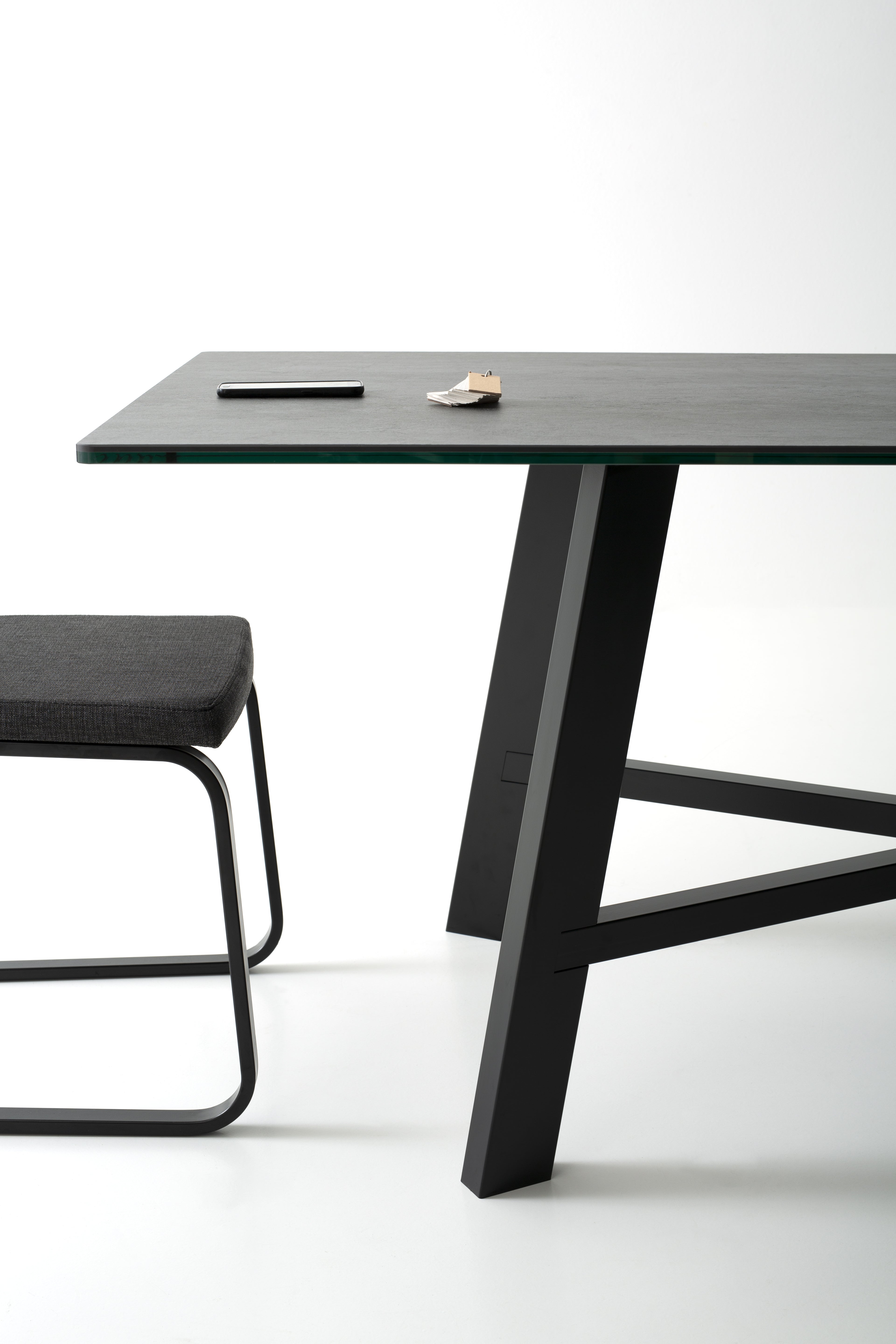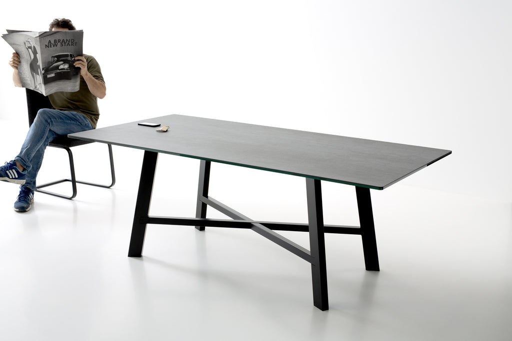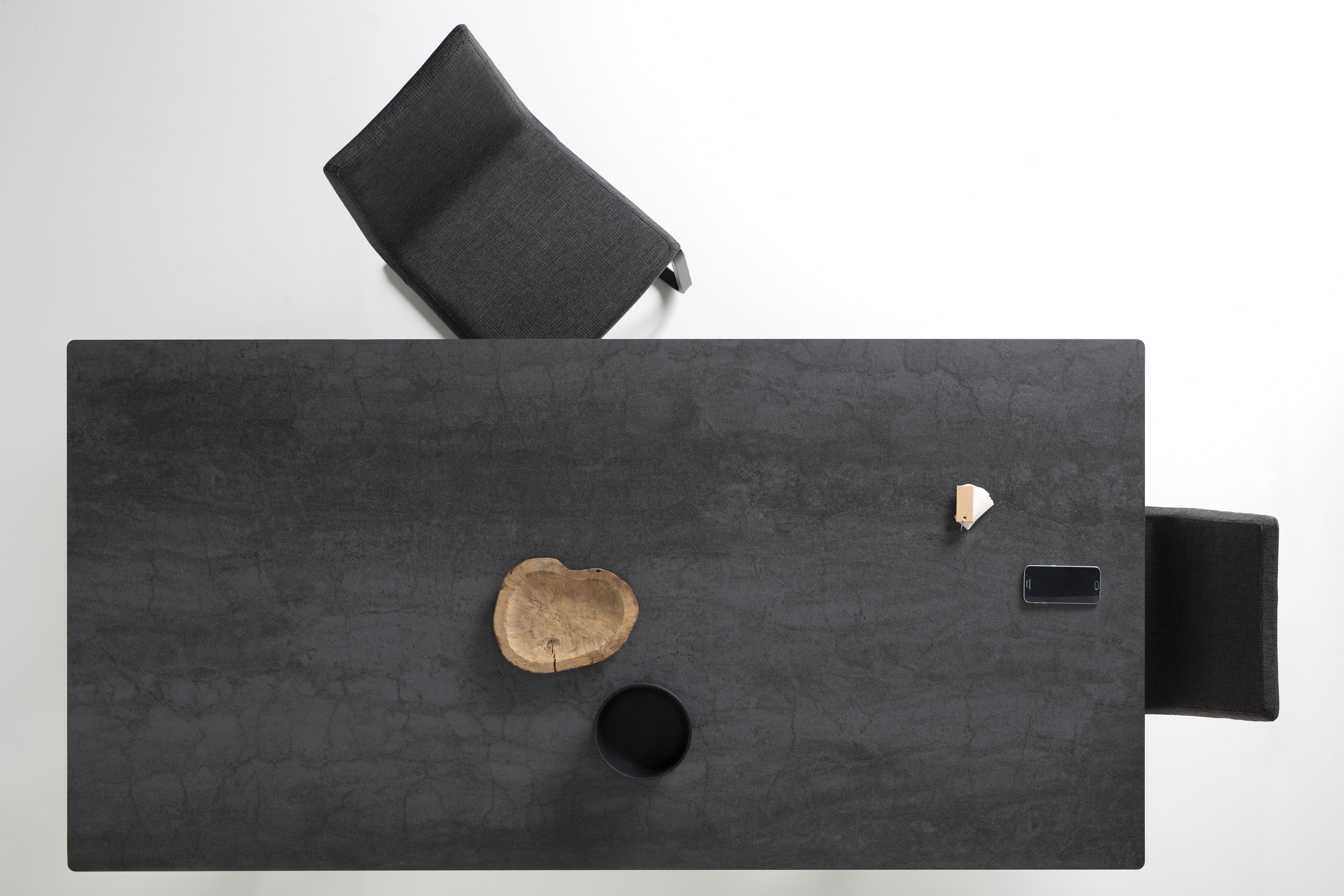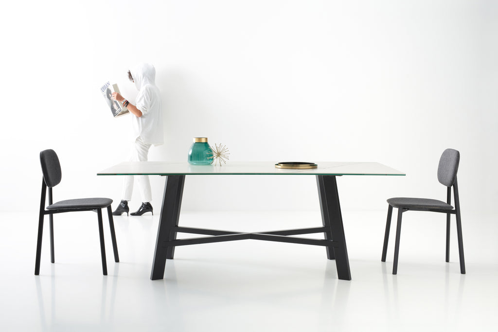 Il basamento, sempre in acciaio con giunzioni a vista, conferisce al tavolo un design audace e contemporaneo, mantenendo un’atmosfera accogliente e raffinata.