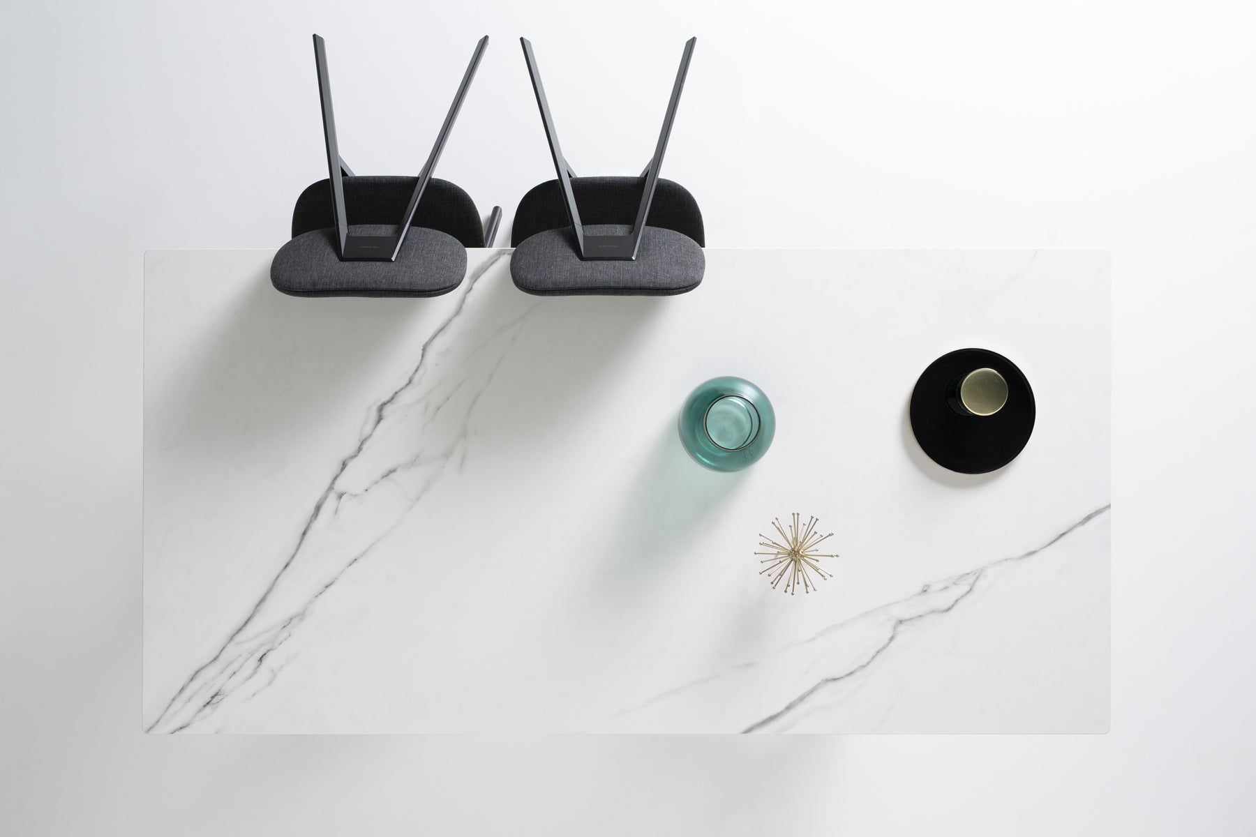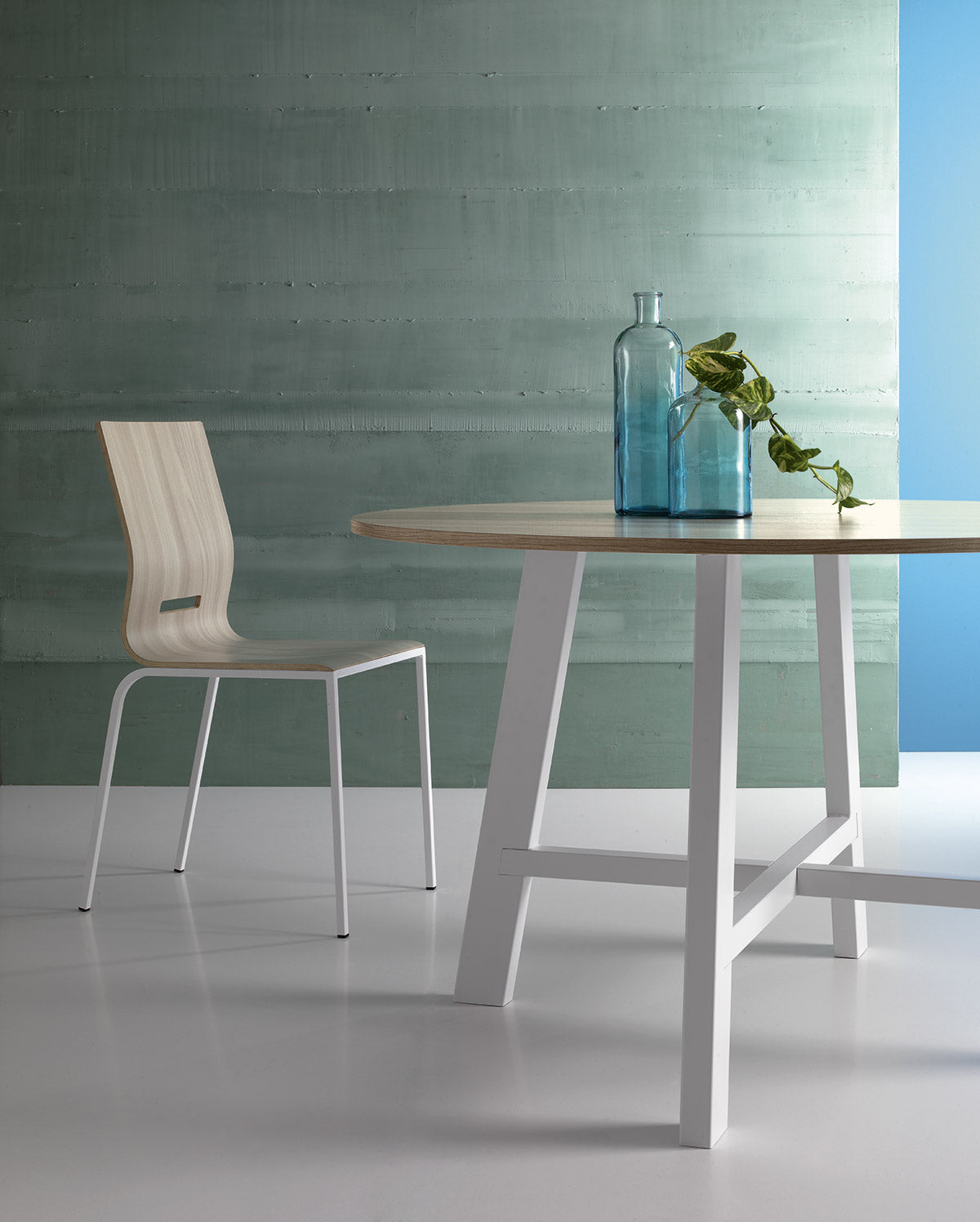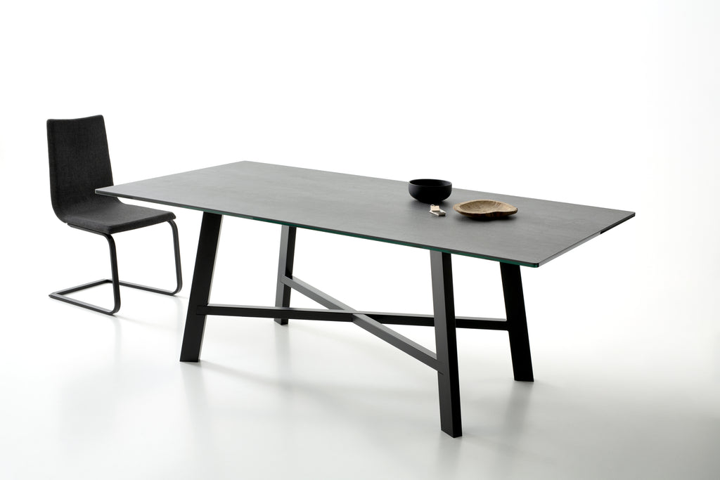 Il basamento, sempre in acciaio con giunzioni a vista, conferisce al tavolo un design audace e contemporaneo, mantenendo un’atmosfera accogliente e raffinata.