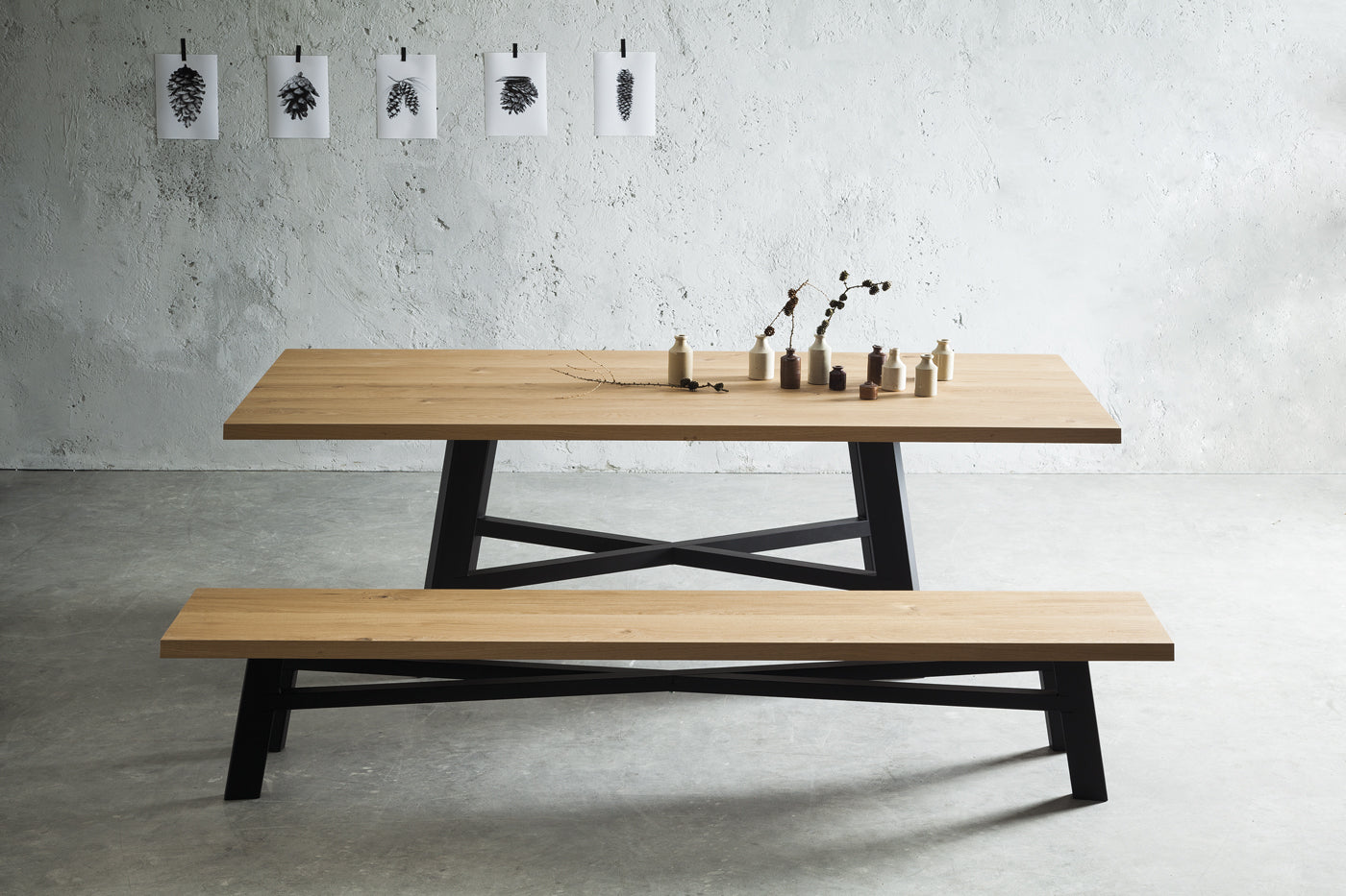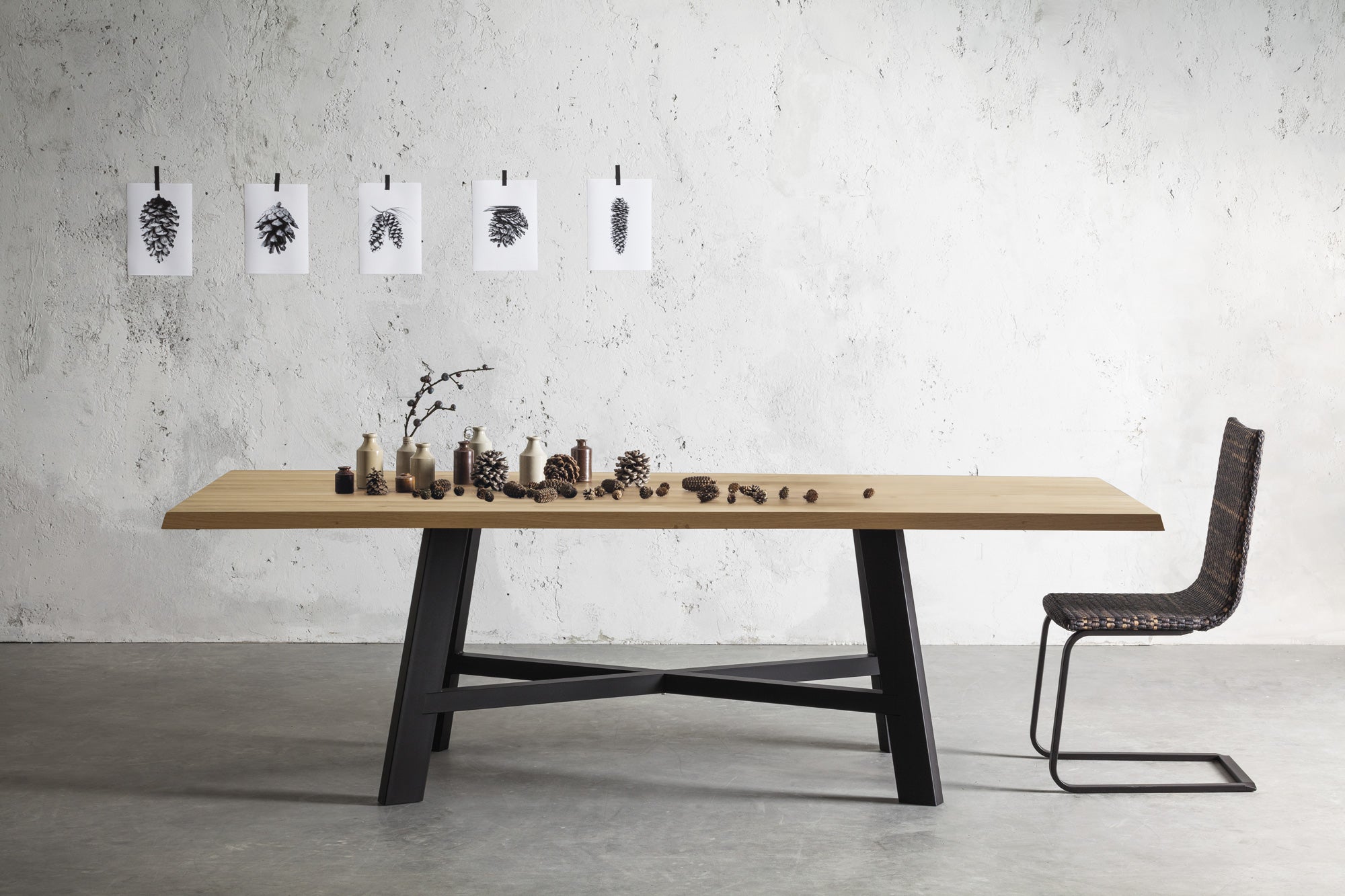 Tavolo Thor è un complemento d’arredo dalla forte personalità, capace di combinare alla perfezione influenze rustiche e stile industriale contemporaneo. Il suo elemento distintivo è il basamento centrale in tubolare rettangolare di acciaio, realizzato con giunzioni a vista ottenute tramite taglio laser: una lavorazione precisa che mette in risalto l’artigianalità e la cura del dettaglio.
